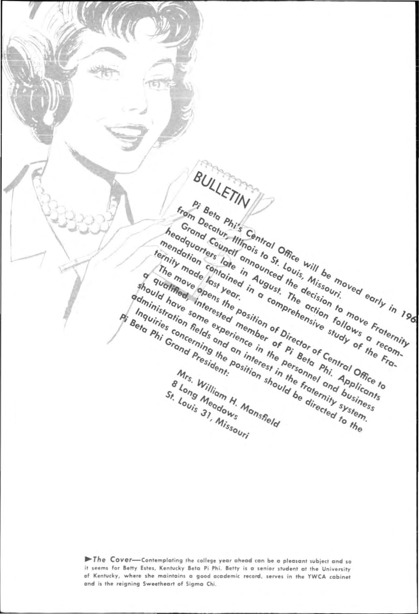 The CoVer-Contemplat i ng , college year ahead can be a pl.olon, subje't and so it , •• ms for aetty Estes , Klntucky Beta Pi 'h i. a etty is a 'Inior s'udent at Ih, Un i nity of Kentucky, where she ",oinlolr" a good ocodem ic record 'Itvl ' in the YWCA cab i nri and is the rl i gning Sw theort of Sigma Ch i.