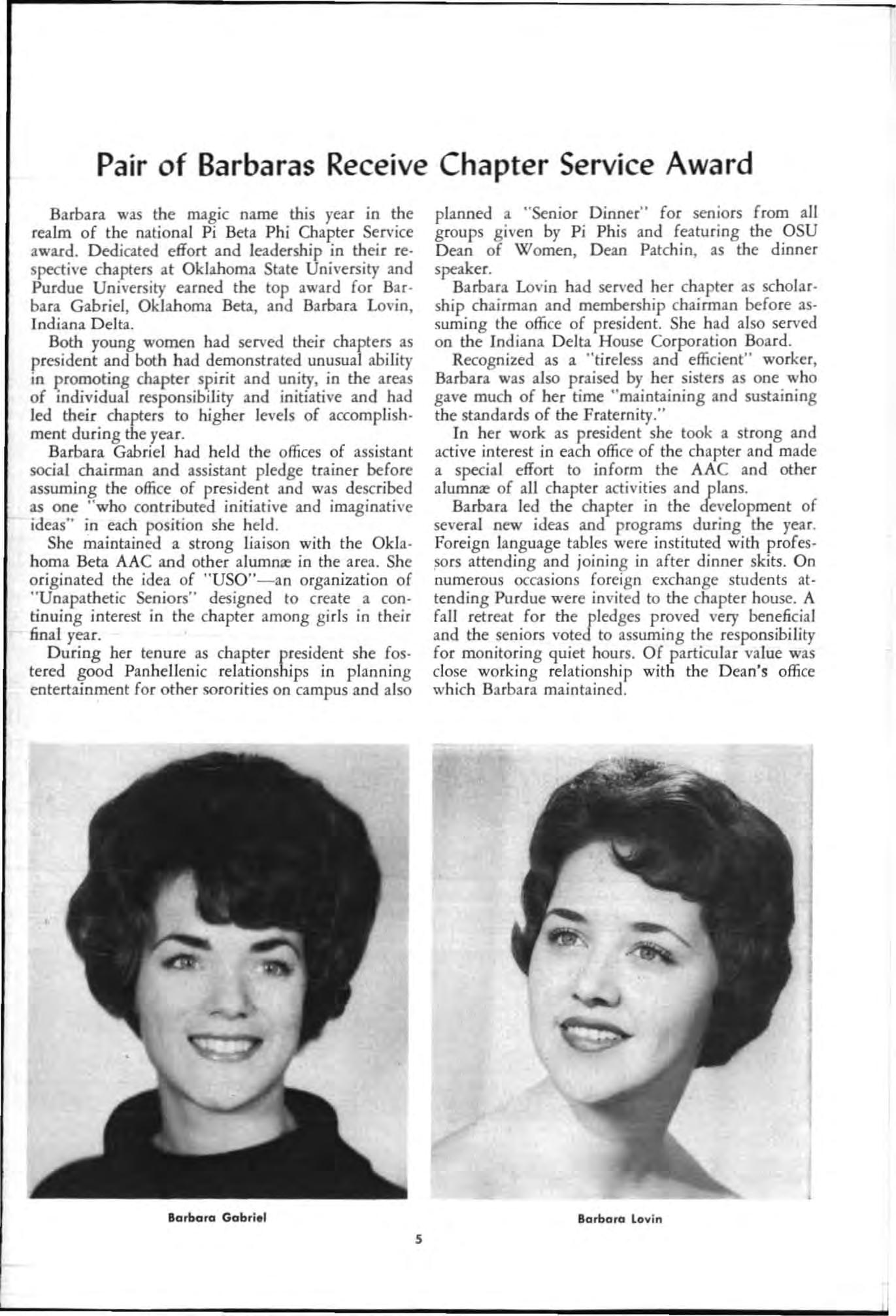 Barbara was the magic name this year in the realm of the national Pi Beta Phi Chapter Service award. Dedicated effort and leadership in their respective chapters at Oklahoma State University and Purdue University earned the top award for Barbara Gabriel. Oklahoma Beta. and Barbara Lovin. Indi ana Delt a.