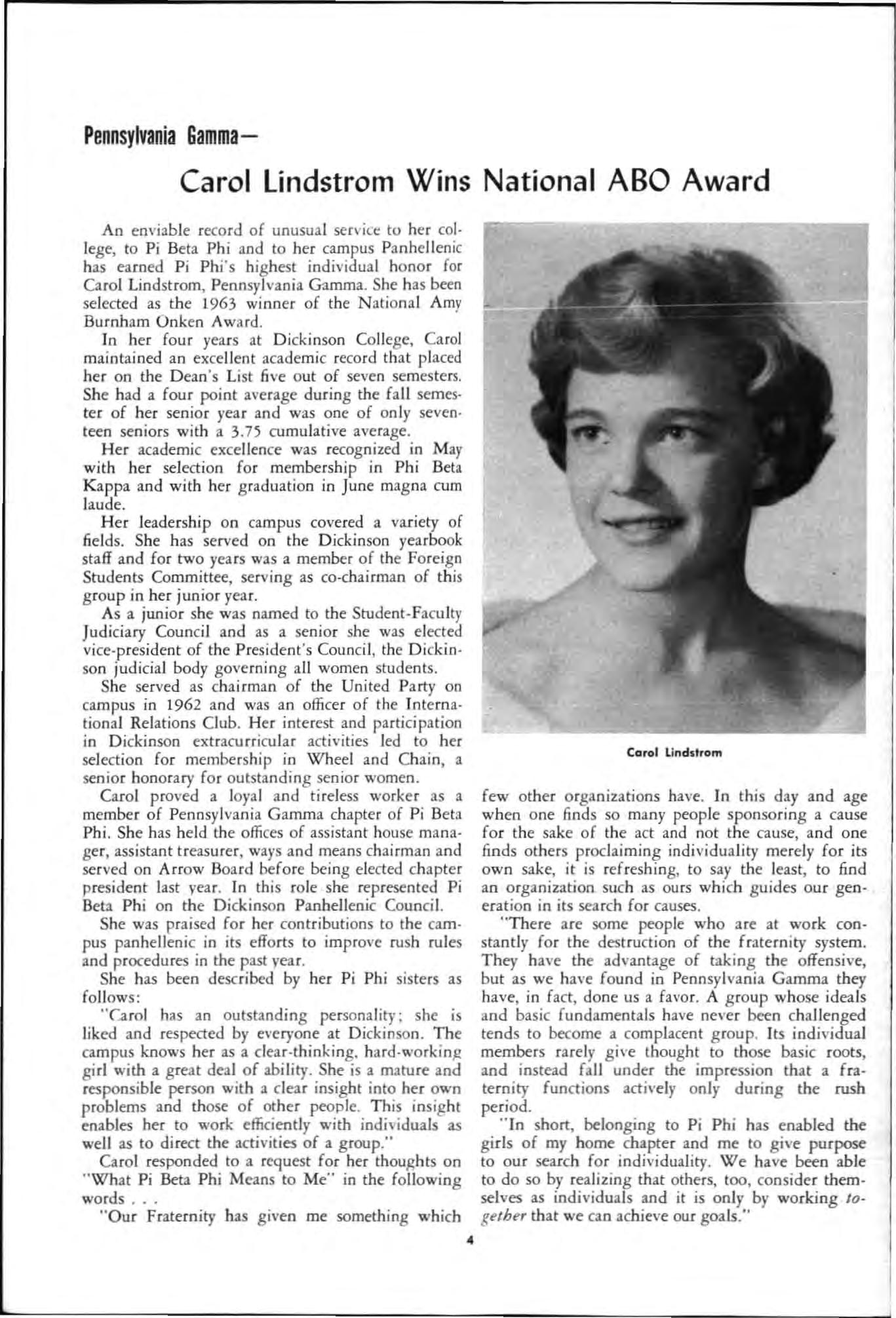 An enviab le record of unusua l service to he r co l· lege, to Pi Beta Phi and to her campus Pa n h e llen ic h as ea rn ed Pi Ph i's h ig h est indiv idua l hono r fo r Caro l Lind strom, Penn sy lvania Gamma. She h as been selected as the 1963 winner of the N at io nal Am y Burnh am Onk e n Aw ard.