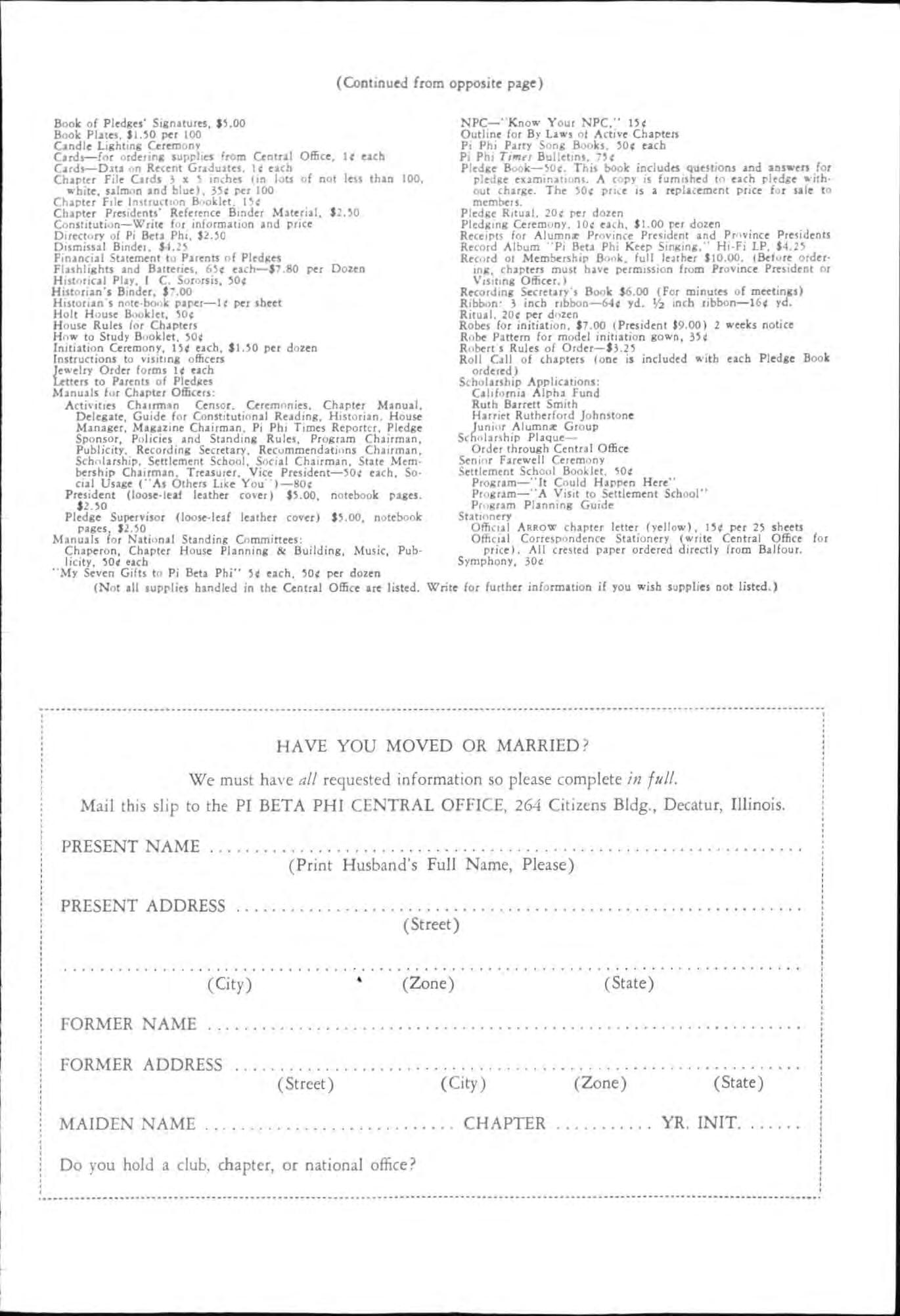 We must have all requested information so please co mplete in !"I/. Mail this slip to the PI BETA PHI CENTRAL OFFICE, 264 Citizens Bldg ., Decatur, Illinois.
