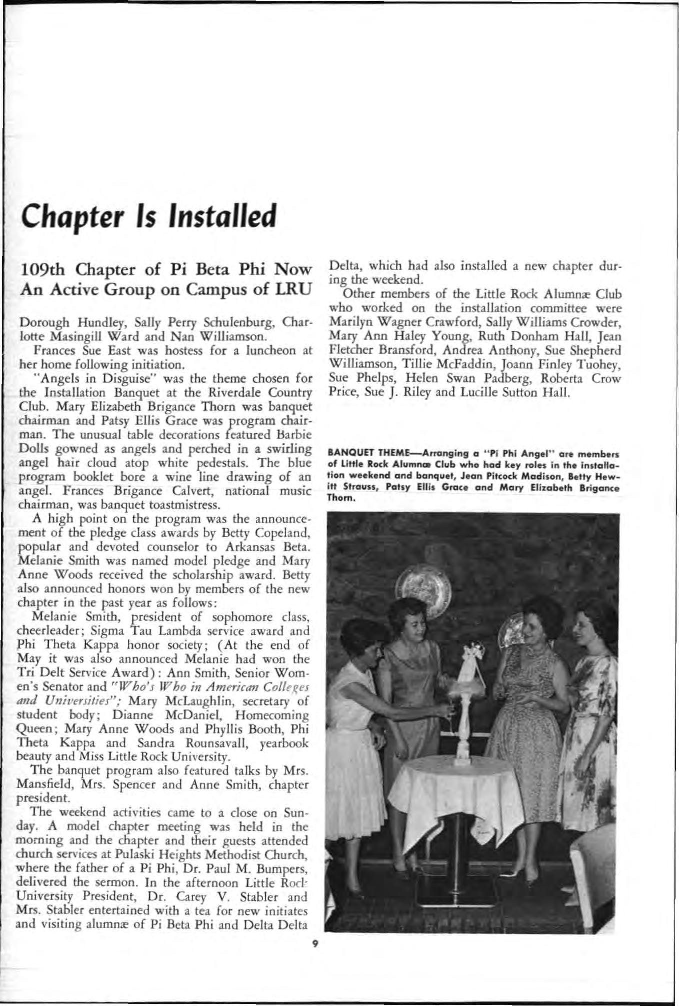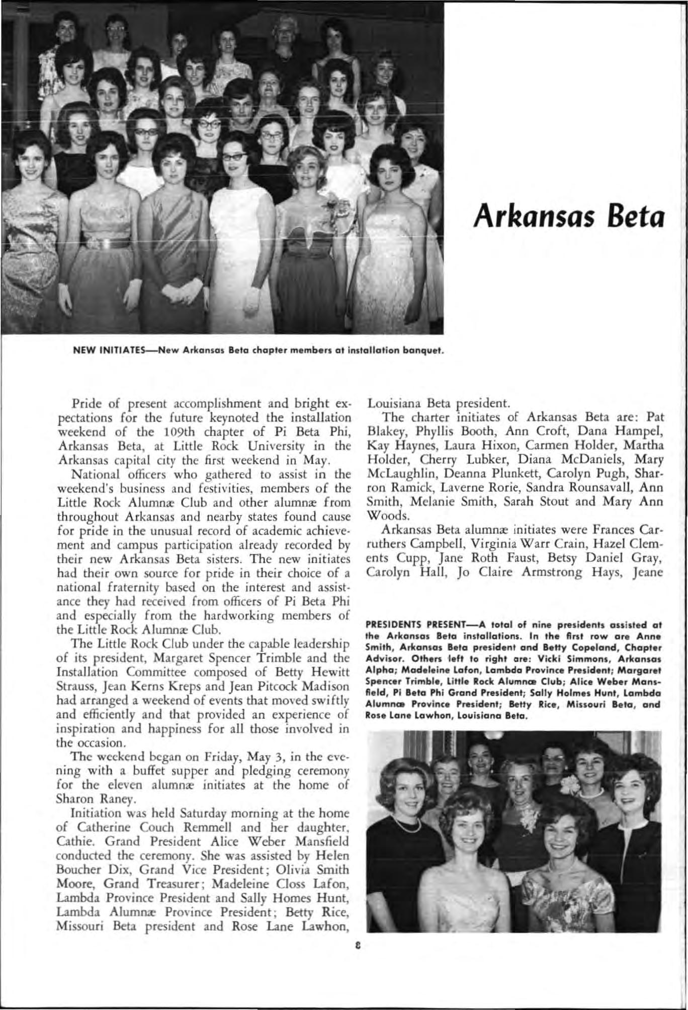 Pride of present accomp li shment and bright expectations for the future keynoted the installation weekend of the l09th chapter of Pi Beta Phi , Arkansas Beta , at Little Rock University in the Arkansa s cap ital city th e first weekend in May . Nation al offICers who gathered to assist in the weekend 's business and festivit ies, members of the Little Rock Alumn., Club and other alumn., from th roug hout Arkansas and ne arby states found cause for pride in the unu sual record of academic achievement and campus participation already recorded by their new Arkansas Beta sisters. T he new initi ates h ad their ow n sou rce for pride in their c hoi ce of a national fr ate rnity based On the interest and assistance they h ad received from officers of Pi Beta Phi and especially from the hardworking members of the Littl e Rock Alumnre Club