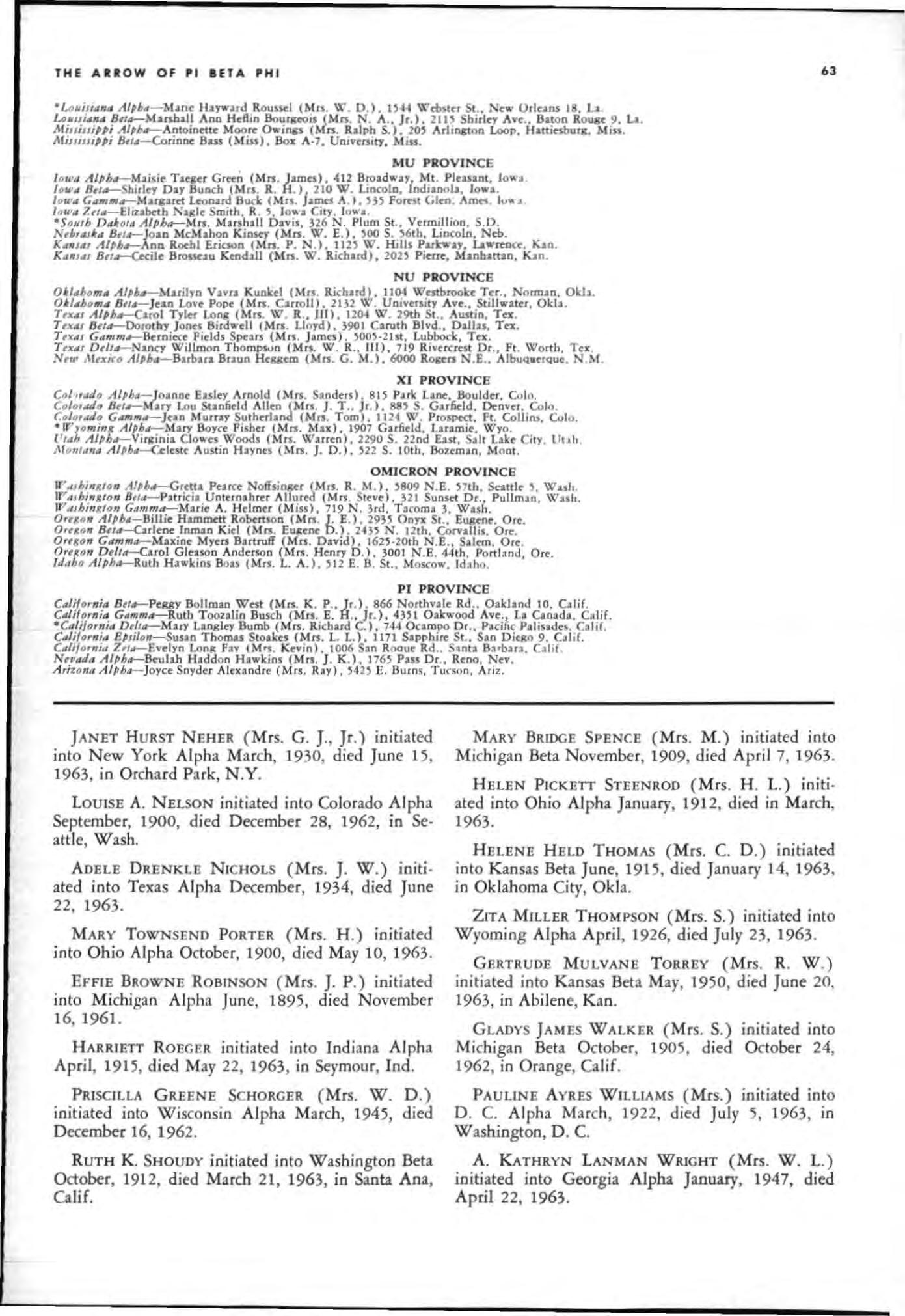The weekend began on Friday, May 3, in the evening wit h a buffet supper and pledging ceremony for the eleven alumn.r initiates at the home of Sharon Raney rniti ation was held Saturday morning at the hom e of Catherine Couch Remmell and her daughter , Cathie Grand President Alice Weber Mansfield conducted the ce remon y. he was assisted by Helen Boucher D ix, Grand Vi ce Presid ent; Olivia Smith Moore, Grand Treasurer ; Madeleine Closs Lafon , Lambda Province President and Sa lly Homes Hunt , Lambda Alum"", Province President ; Betty Ri ce, Mi ssou ri Beta president and Rose Lane Lawhon , e
