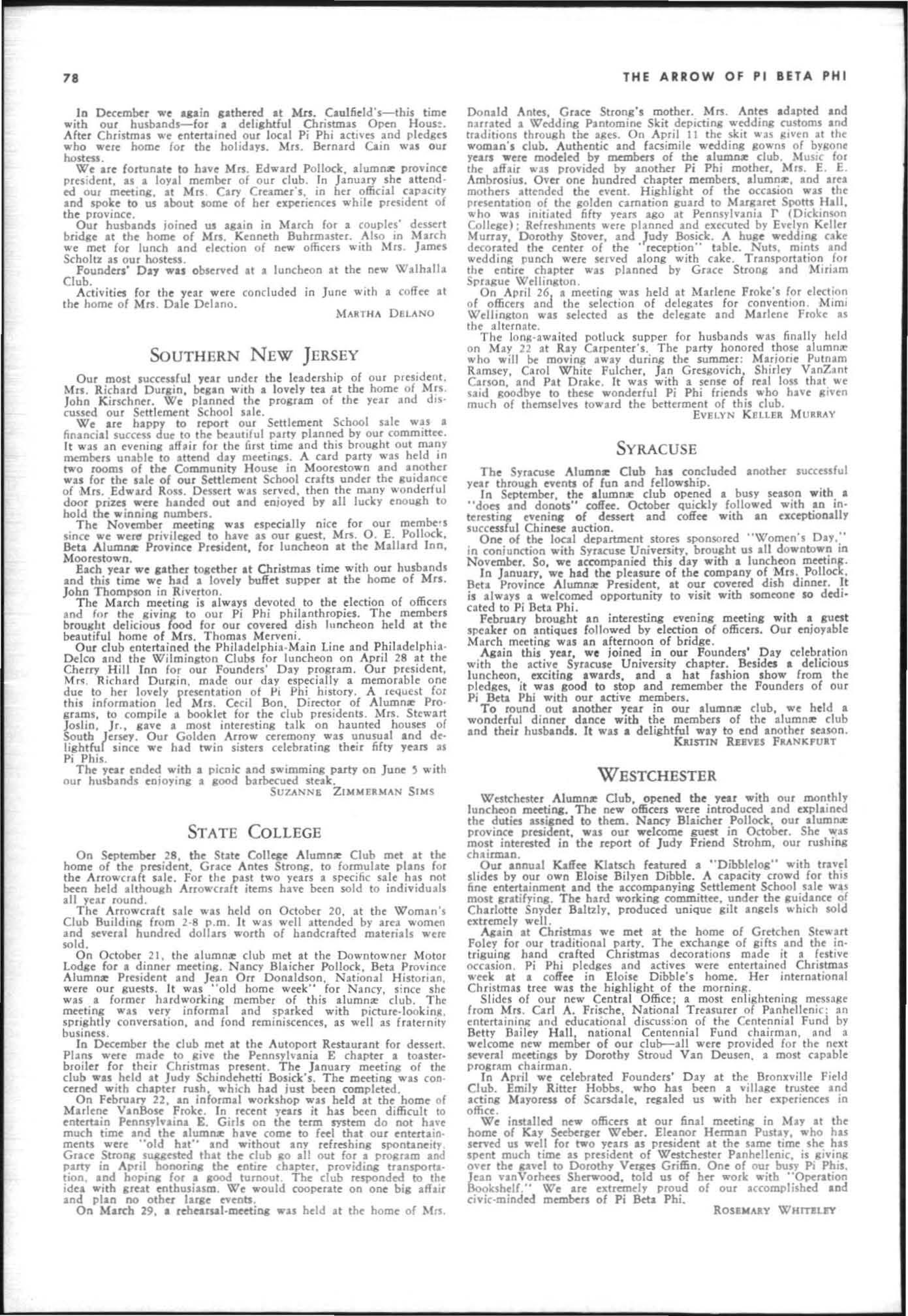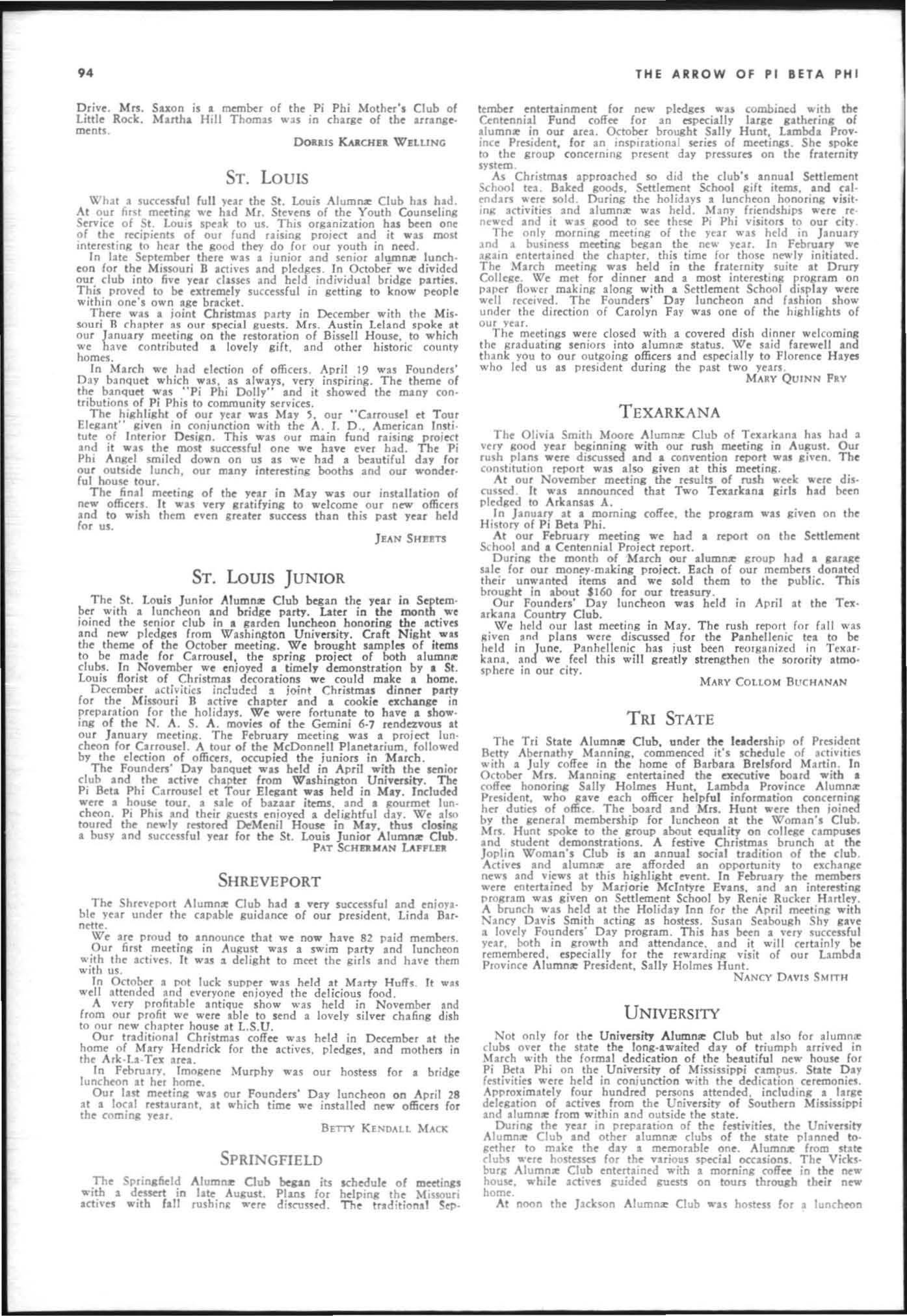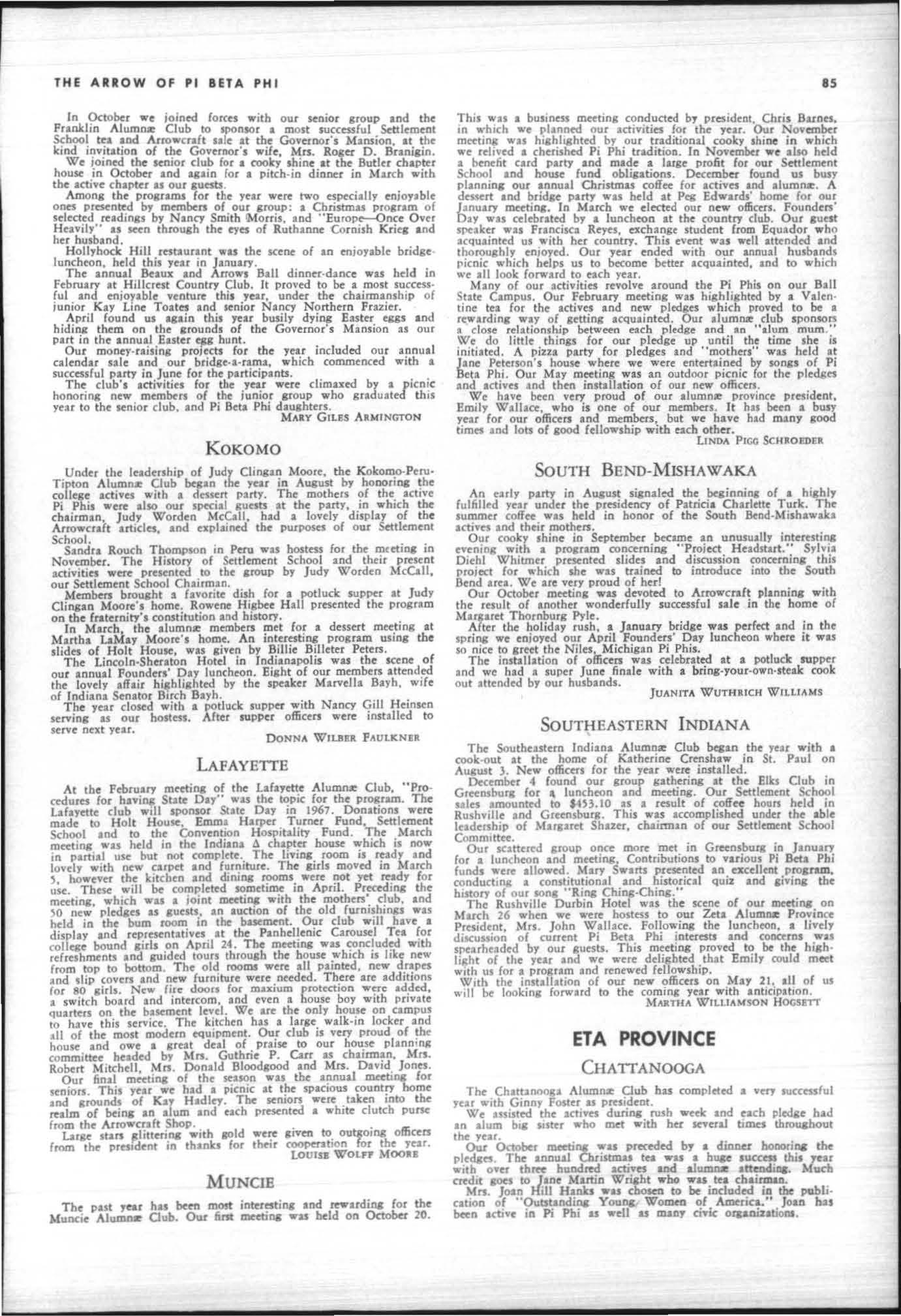 She was elected editor of THE ARROW thirty years after she had attended her first Pi Phi convent ion as a sophomore chapter delegate in St. Louis in 1904. In the interim she had been active not only in the Washington Club but in severa l others in areas where she and her husband had been stationed. She had been scholarship chairman of Gamma Provin ce and a province president for four years in the J<a ppa Provin ce.