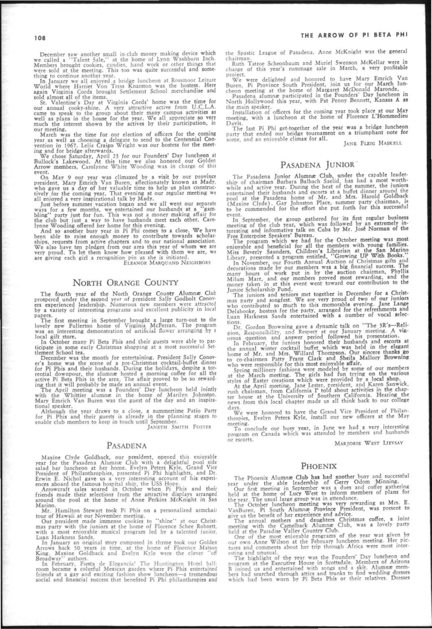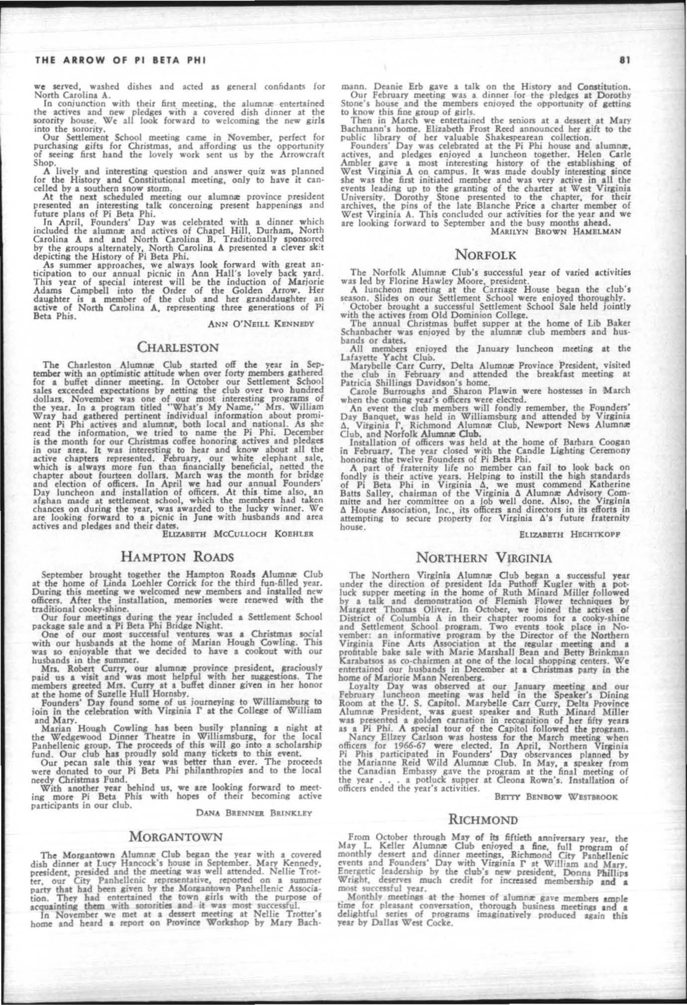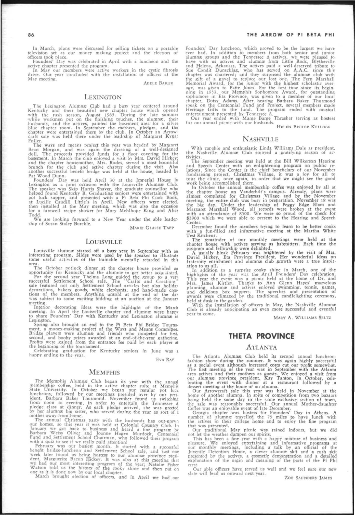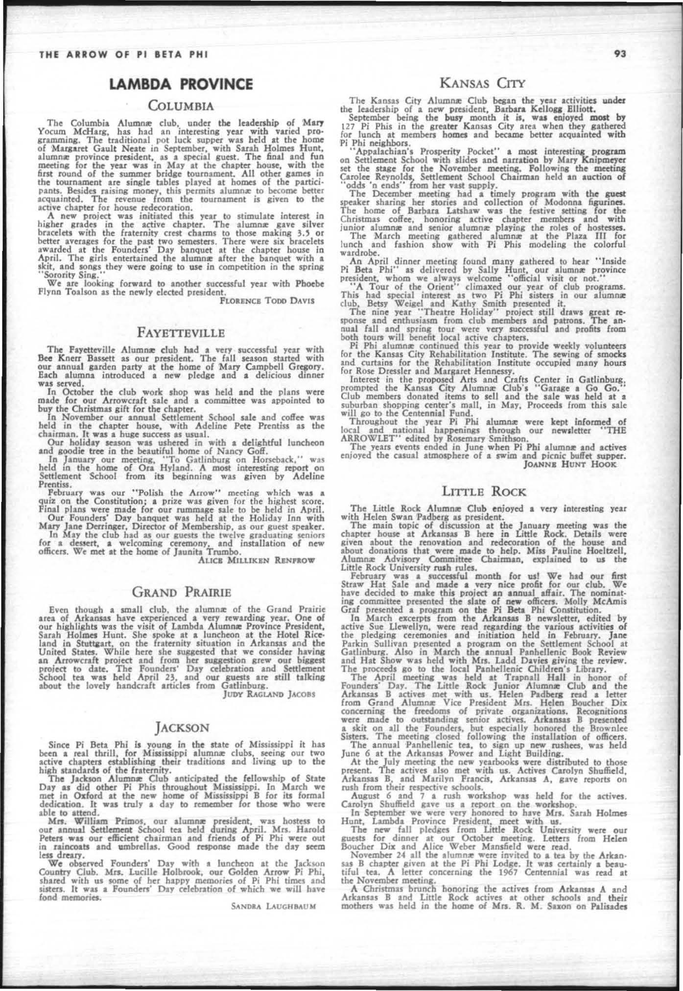 She was elected editor of THE ARROW thirty years after she had attended her first Pi Phi convent ion as a sophomore chapter delegate in St. Louis in 1904. In the interim she had been active not only in the Washington Club but in severa l others in areas where she and her husband had been stationed. She had been scholarship chairman of Gamma Provin ce and a province president for four years in the J<a ppa Provin ce.