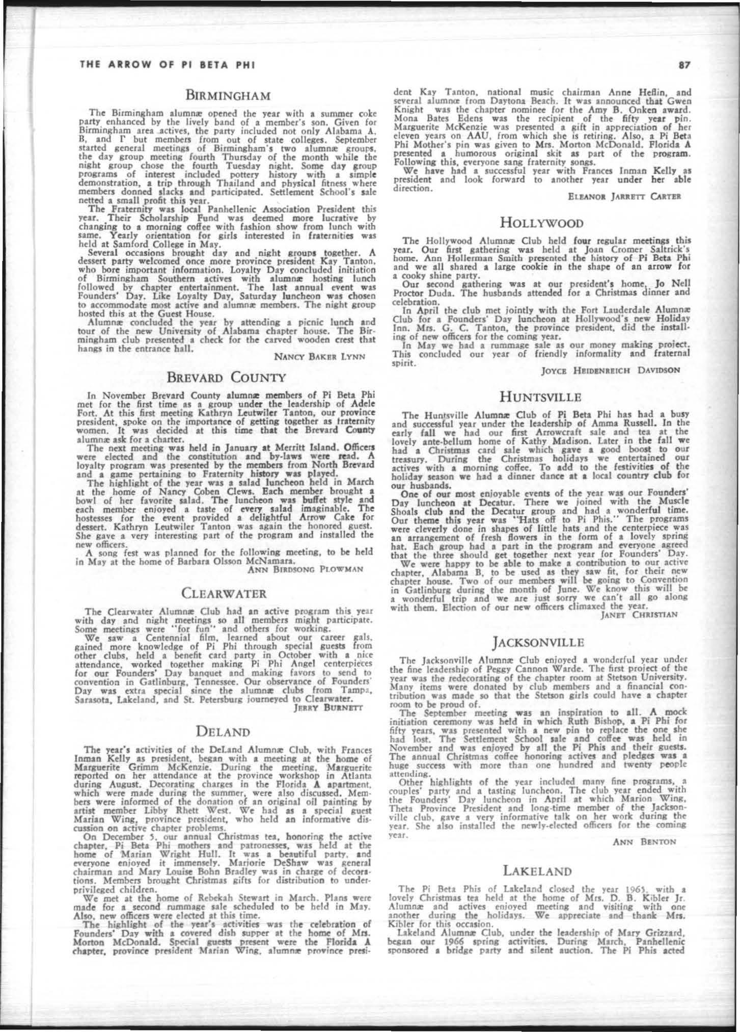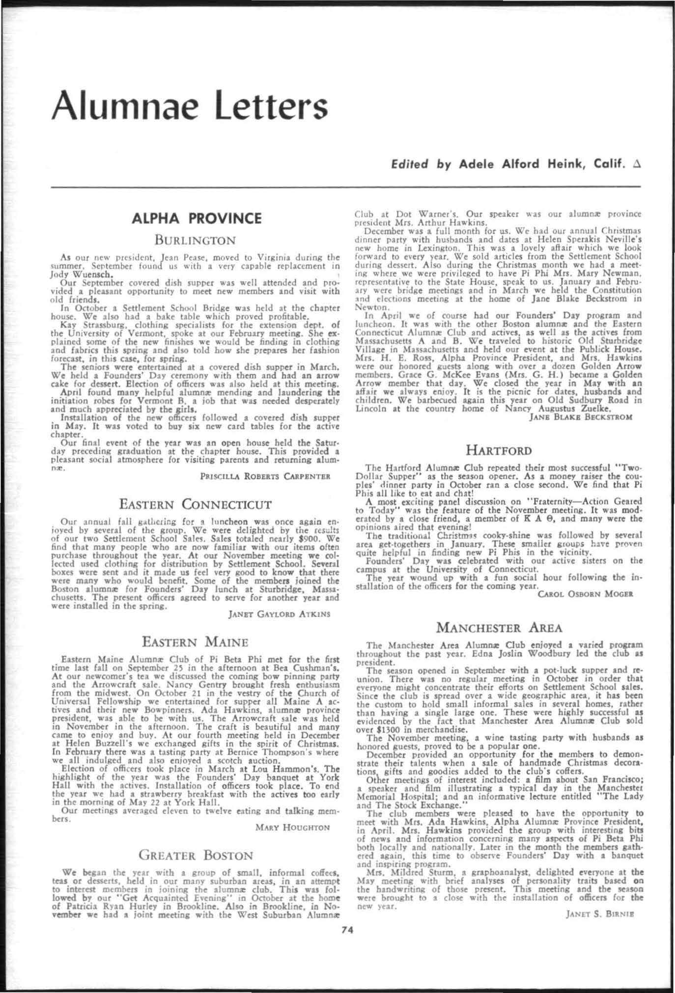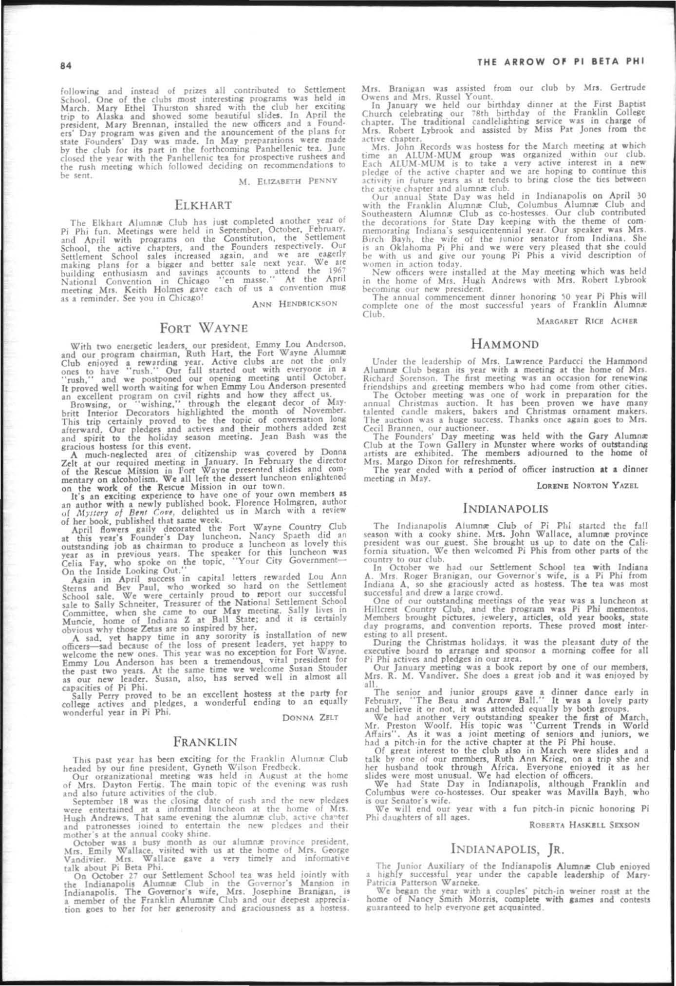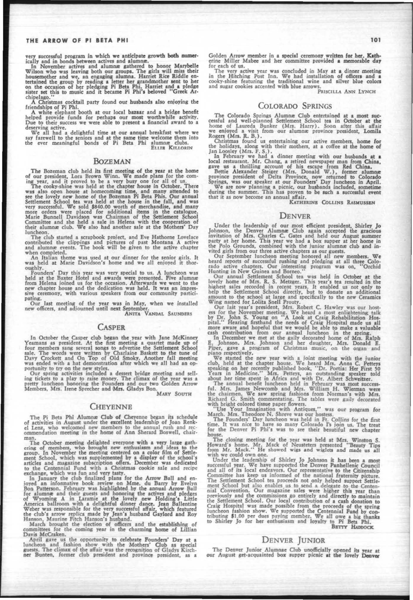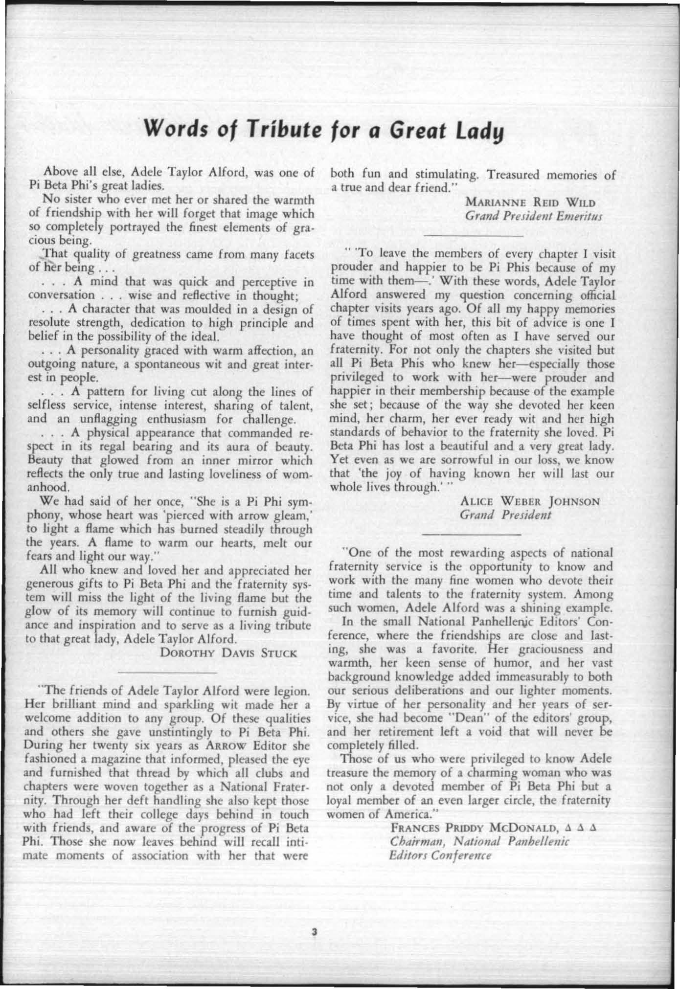 " The friends of Adele Taylo r Alford were legion . Her brilliant mind and sparkling wit made her a welcome addition to any group. Of these qualities and ot hers she gave unstintingly to Pi Beta Phi . During her twenty six years as ARROW Editor she fashioned a magazine that informed , pleased the eye and furn ished that thread by whi ch all clubs and chapters were woven together as a National Frater. nity. Through her deft handling she also kept those who h ad left th e ir co llege days be hi nd in touch wit h friends, and aware of th e progress of Pi Beta Phi Those she now leaves behind will recall inti · mate moments of association with her that were
