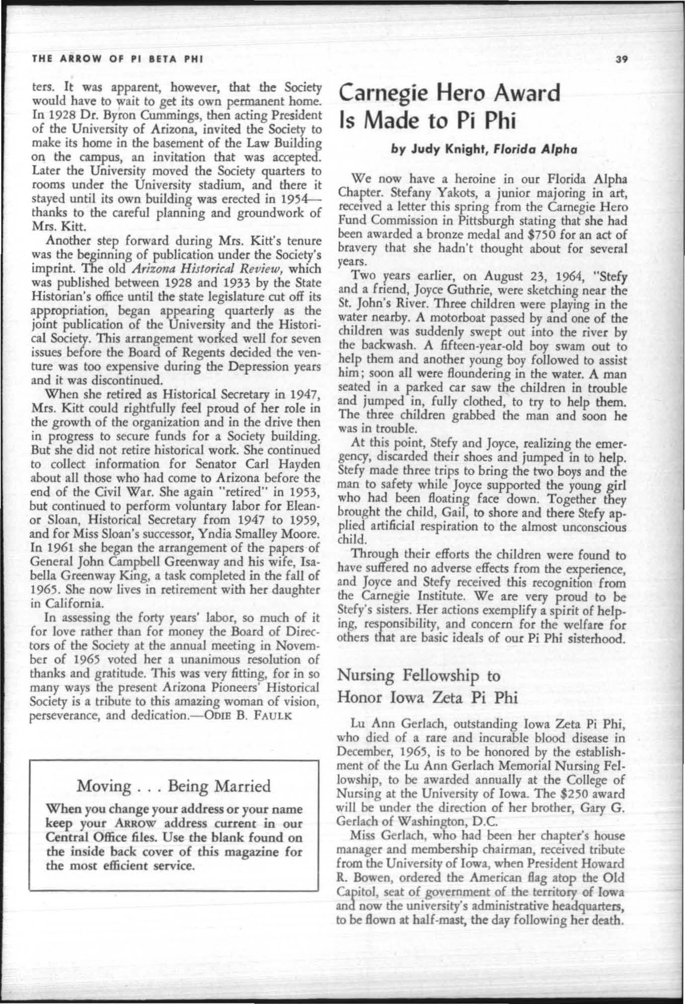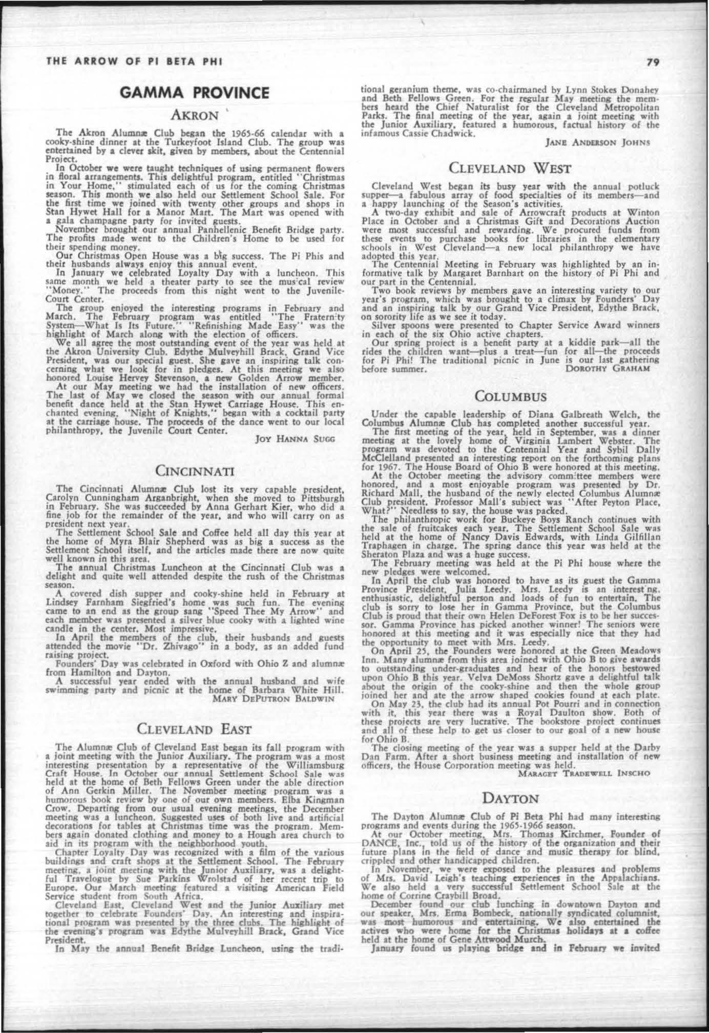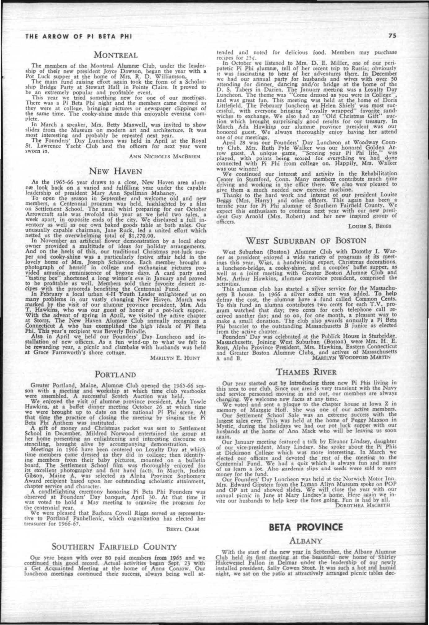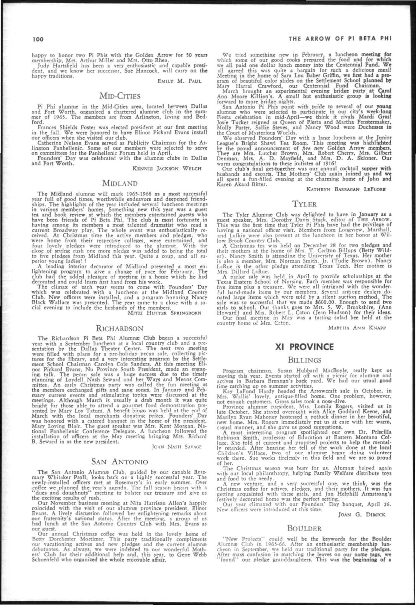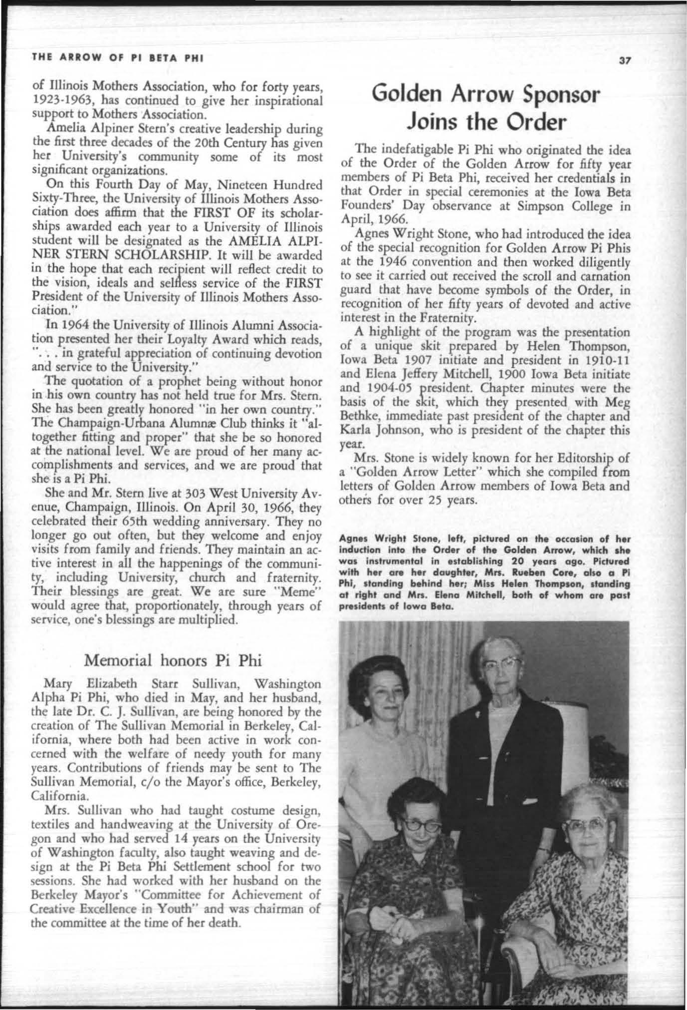" The friends of Adele Taylo r Alford were legion . Her brilliant mind and sparkling wit made her a welcome addition to any group. Of these qualities and ot hers she gave unstintingly to Pi Beta Phi . During her twenty six years as ARROW Editor she fashioned a magazine that informed , pleased the eye and furn ished that thread by whi ch all clubs and chapters were woven together as a National Frater. nity. Through her deft handling she also kept those who h ad left th e ir co llege days be hi nd in touch wit h friends, and aware of th e progress of Pi Beta Phi Those she now leaves behind will recall inti · mate moments of association with her that were
