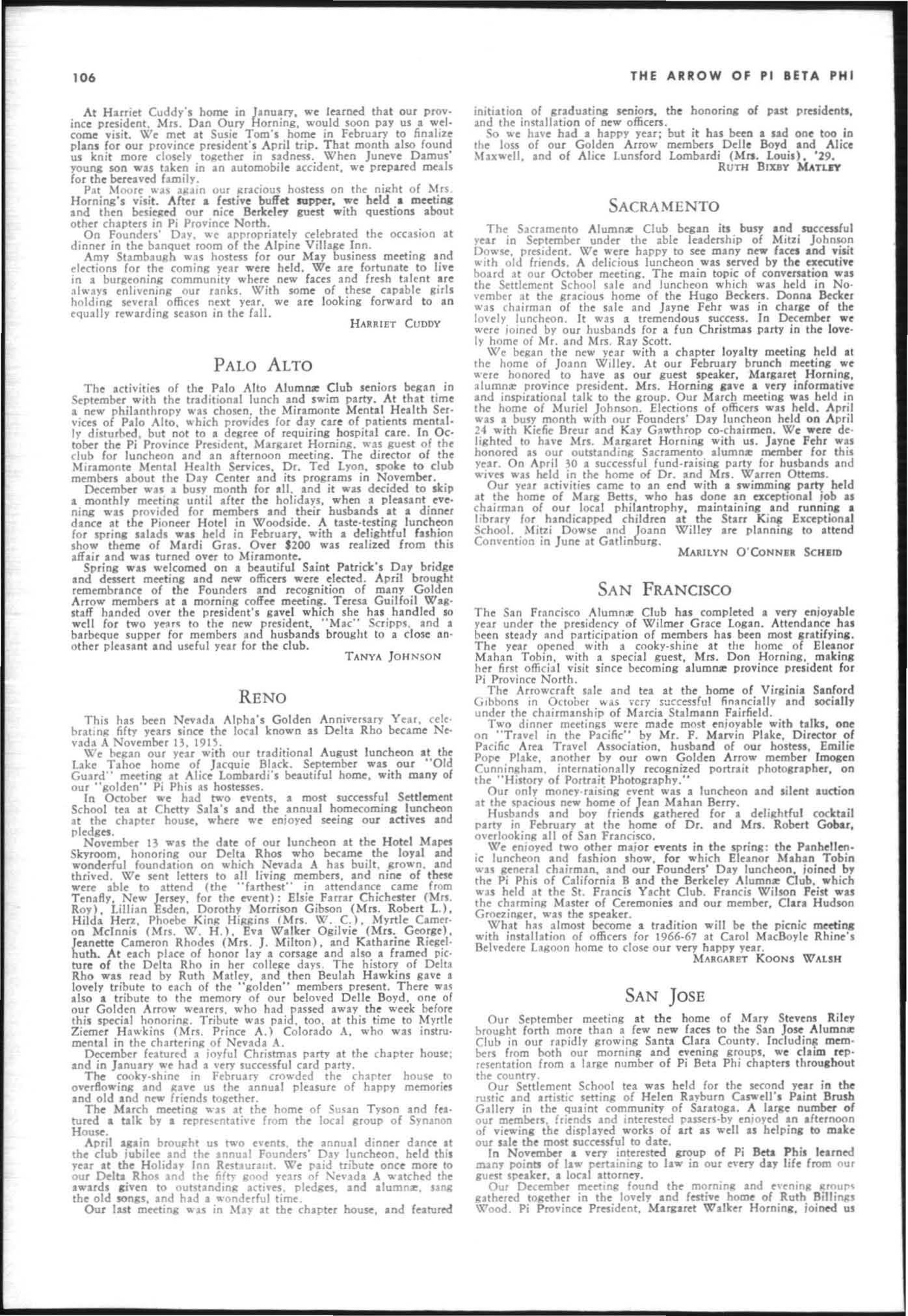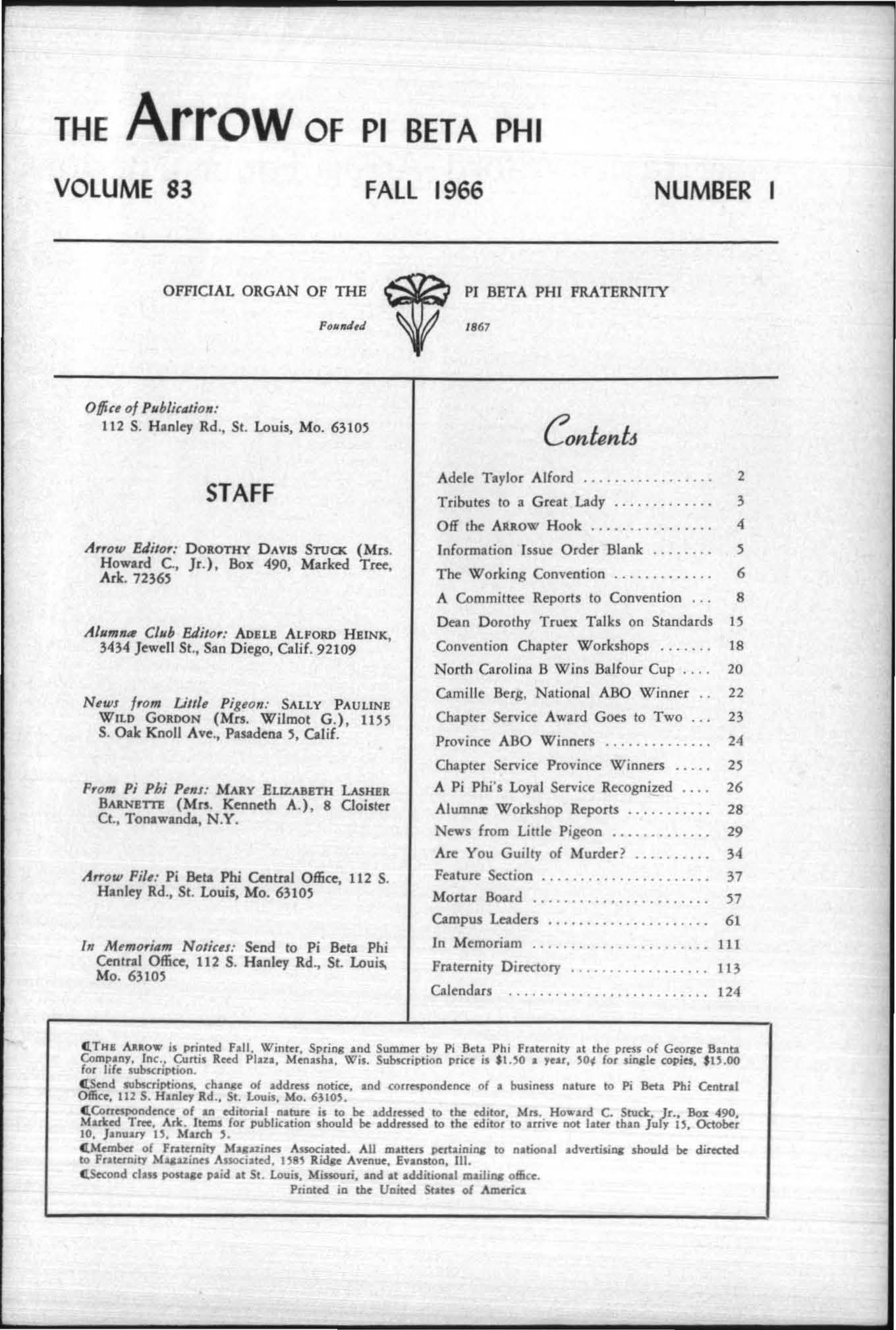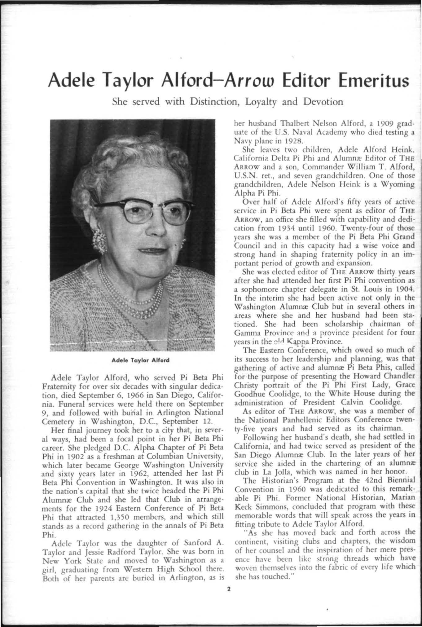 Adele Taylor Alford, who served Pi Beta Phi Fraternity for over six decades with singu lar dedica· tion, died September 6, 1966 in San Diego, California . Funeral services were held there on September 9, and followed with bunal in Arlington Nal iona l Cemetery in Washington, D.C., September 12. Her final journey took her to a city that , in stveral ways, h ad been a focal point in her Pi Beta Phi ca reer. She pledged D.C. Alpha Chapter of Pi Beta Phi in 190 2 as a freshman at Columbian University, which later became George Washington University and sixty years later in 1962 , attended he r last Pi Beta Phi Convention in Washington. It was also in the nation's capita l that she twice headed the Pi Phi Alumna: Club and she led that Club in arrange· ments for the 1924 Eastern Conference of Pi Beta Phi t h at attracted members, and which still stands as a record gathering in the annals of Pi Beta Phi