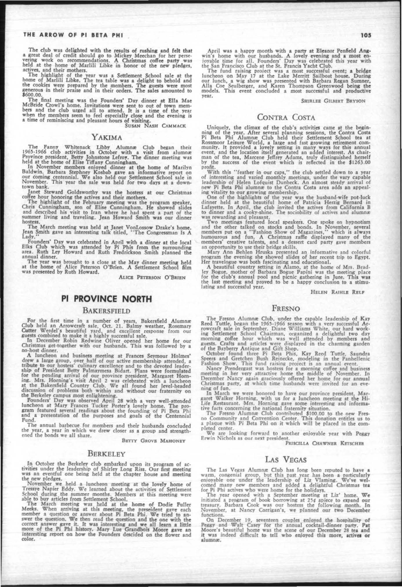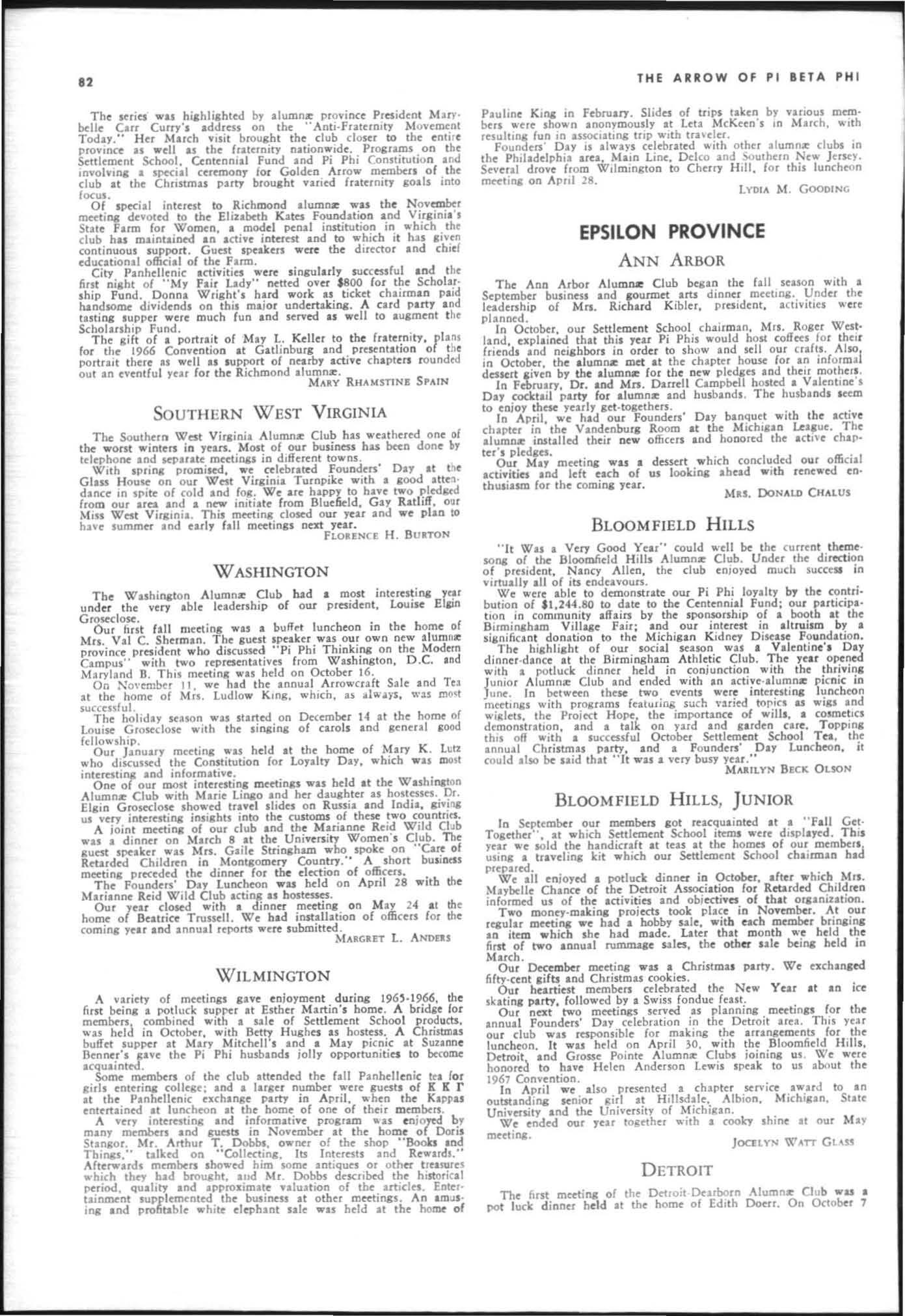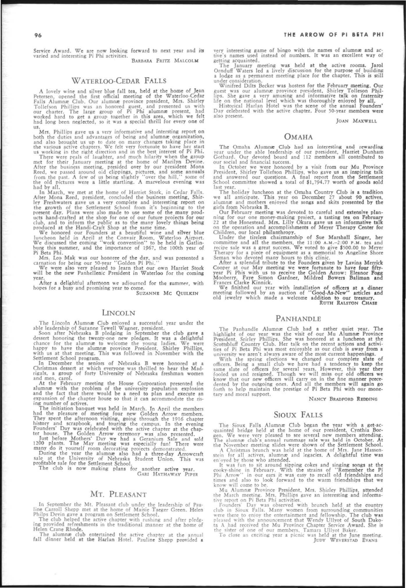 Adele Taylor Alford, who served Pi Beta Phi Fraternity for over six decades with singu lar dedica· tion, died September 6, 1966 in San Diego, California . Funeral services were held there on September 9, and followed with bunal in Arlington Nal iona l Cemetery in Washington, D.C., September 12. Her final journey took her to a city that , in stveral ways, h ad been a focal point in her Pi Beta Phi ca reer. She pledged D.C. Alpha Chapter of Pi Beta Phi in 190 2 as a freshman at Columbian University, which later became George Washington University and sixty years later in 1962 , attended he r last Pi Beta Phi Convention in Washington. It was also in the nation's capita l that she twice headed the Pi Phi Alumna: Club and she led that Club in arrange· ments for the 1924 Eastern Conference of Pi Beta Phi t h at attracted members, and which still stands as a record gathering in the annals of Pi Beta Phi