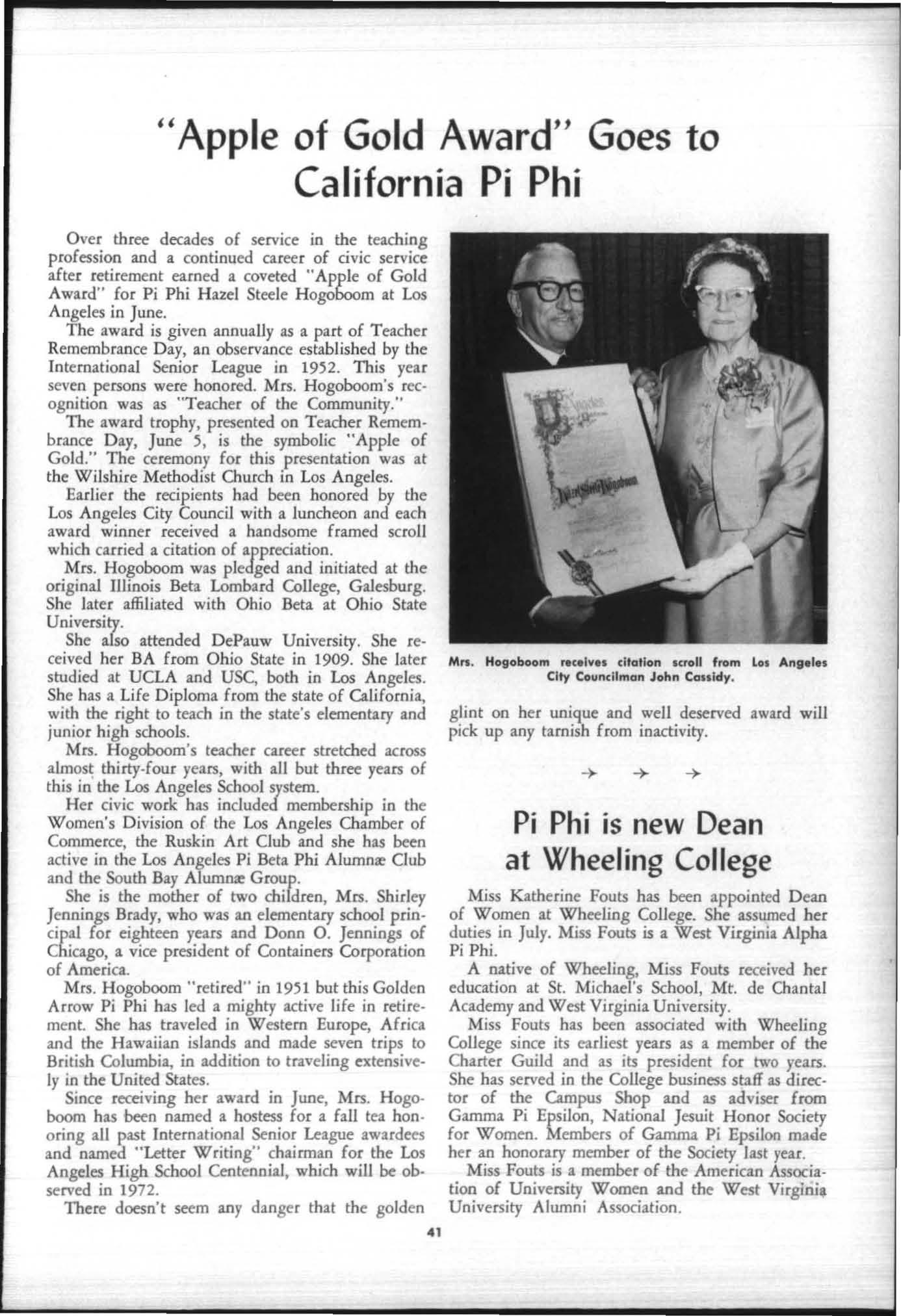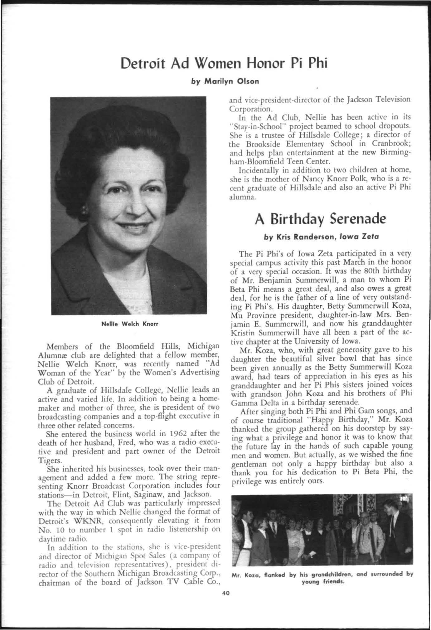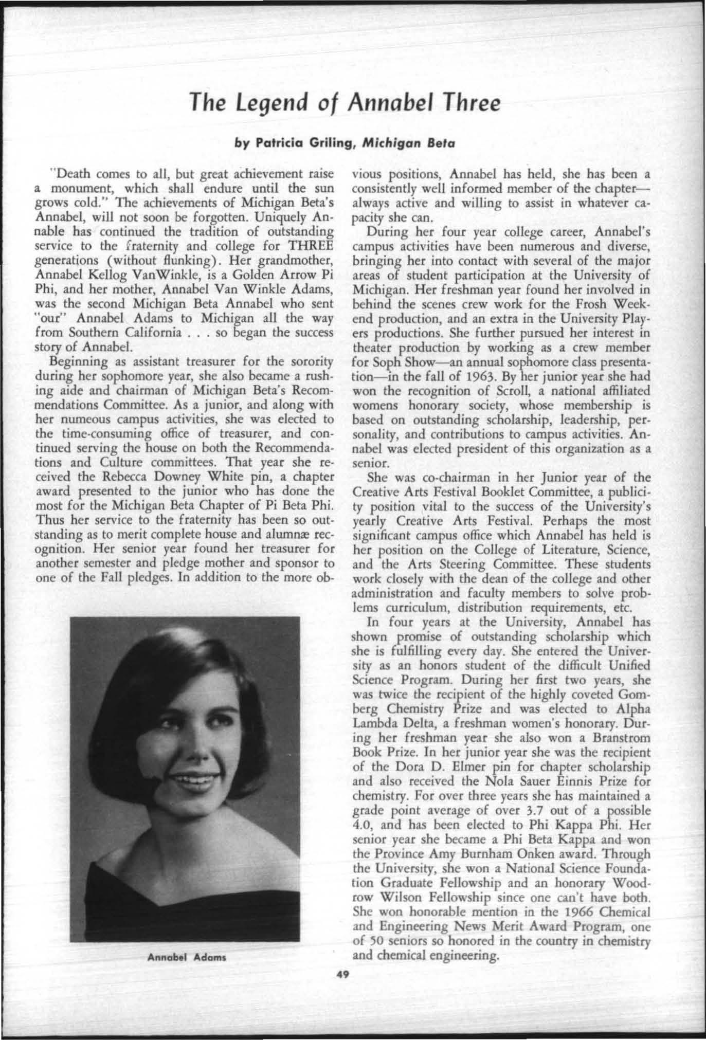 Those of us who were privileged to know Adele treasure the memory of a charming woman who was not only a devoted member of Pi Beta Phi but a loyal member of an even larger circle, the fraternity women of America. "
