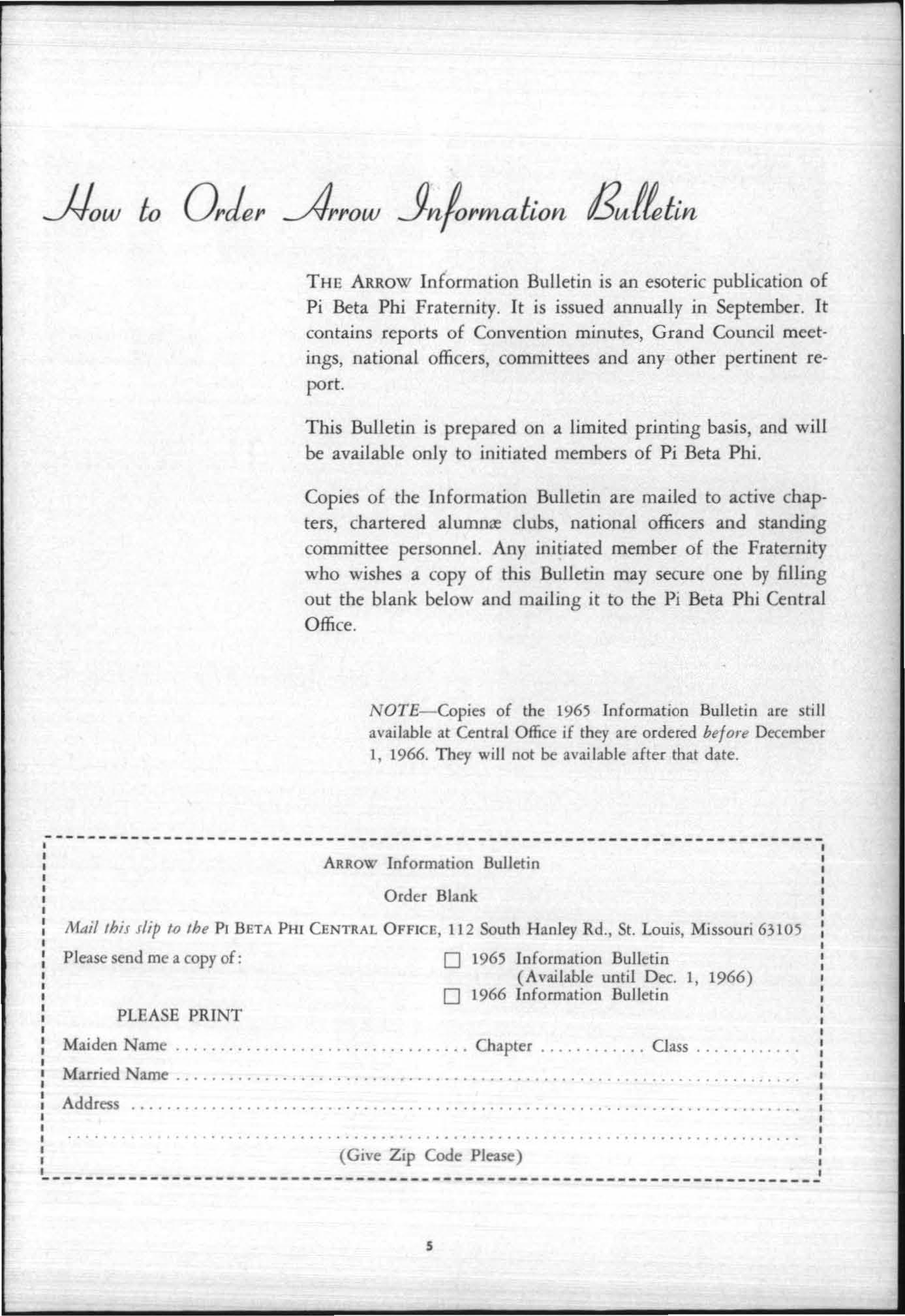 Copies of the Information Bulletin are mailed to active chapters , chartered alumnae clubs, national officers and standing co mmittee personnel. Any initiated member of the Fraternity who wishes a co py of this Bulletin may secure one by fillin g o ut the blank below and mailin g it to the P i Beta Phi Central Offi ce.