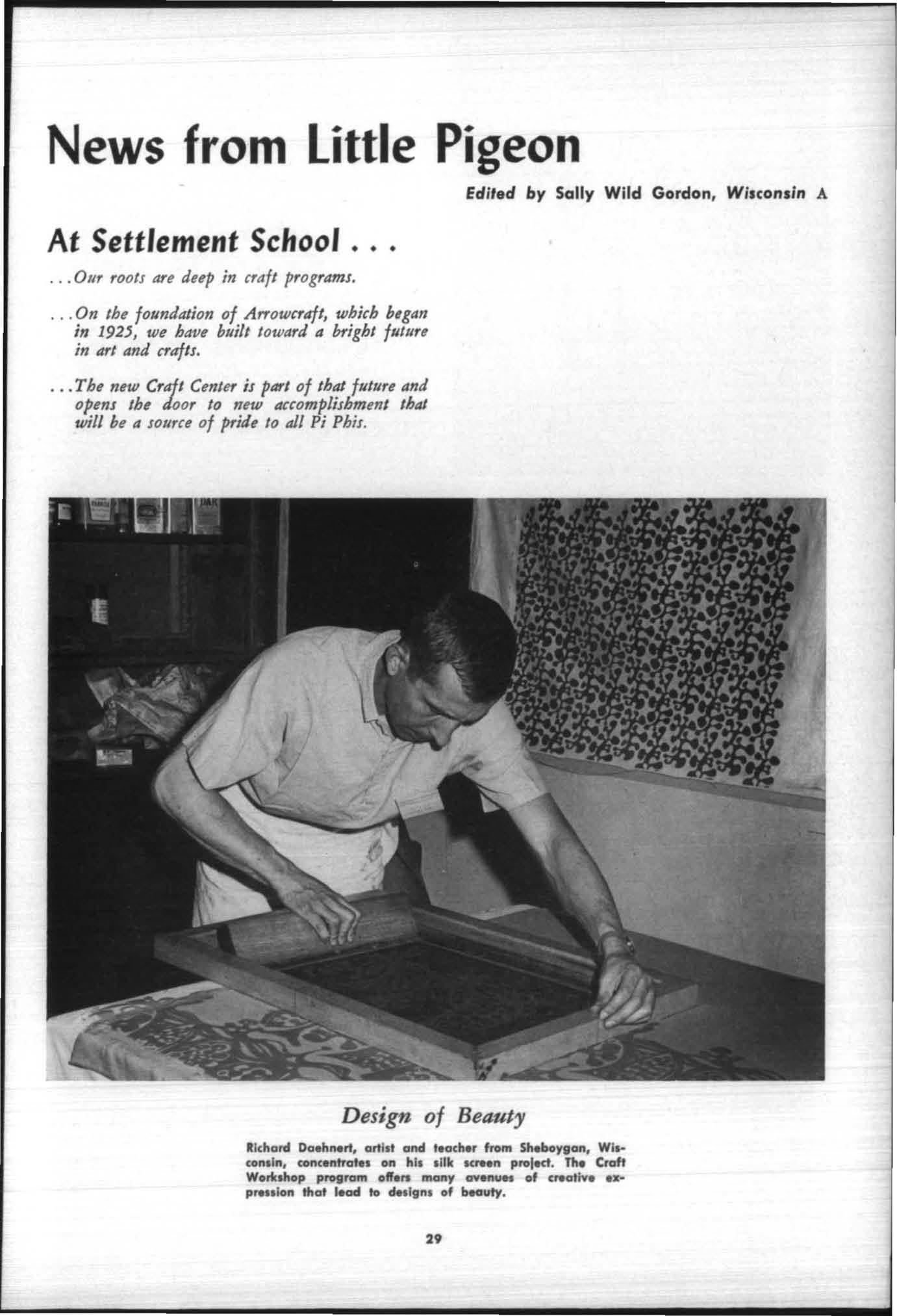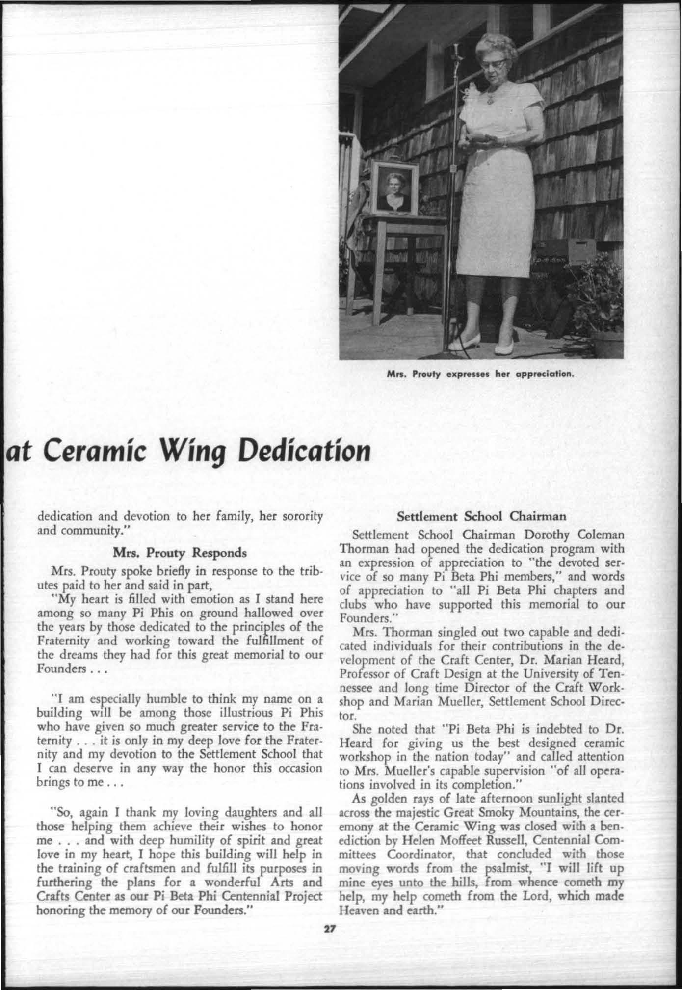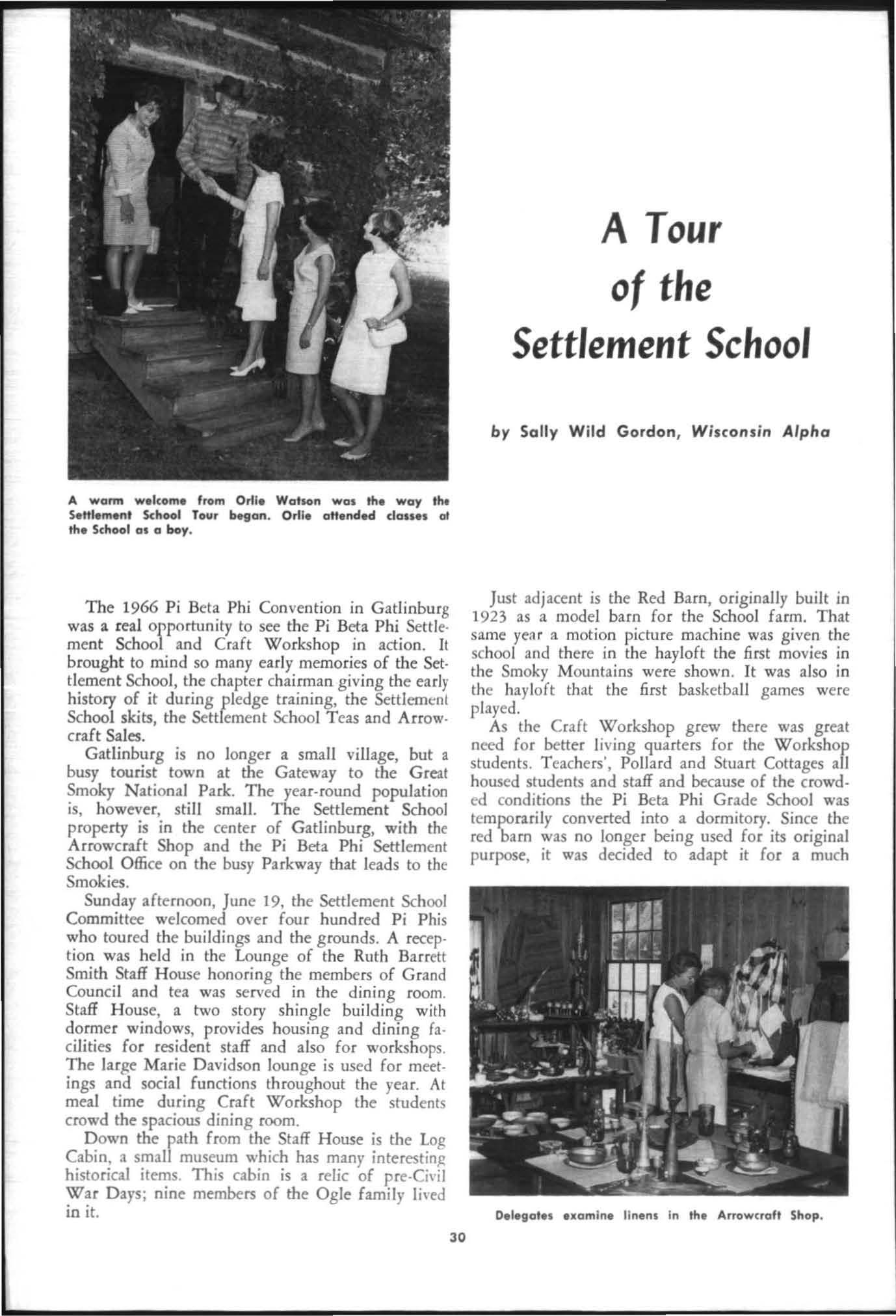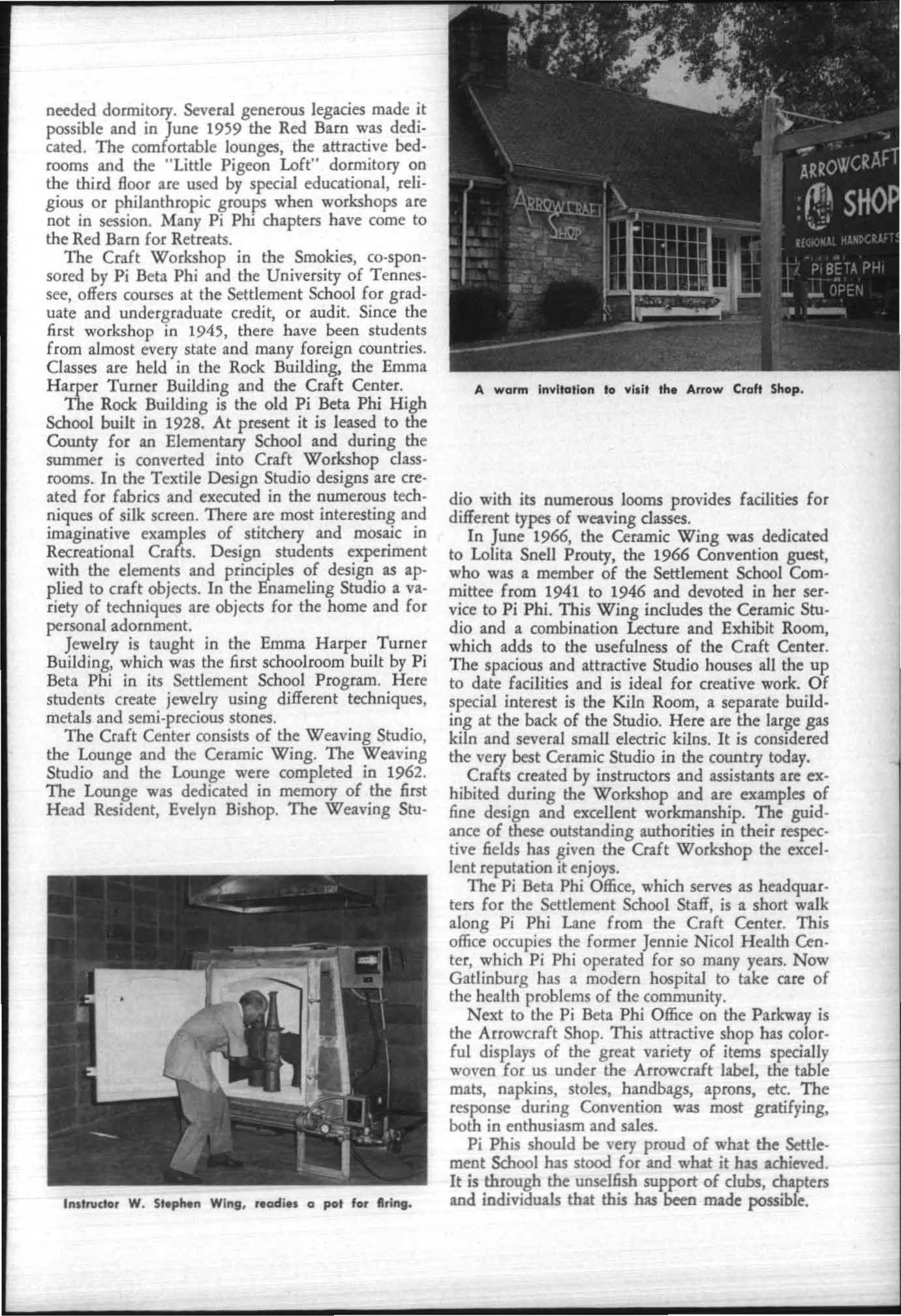 Few, if any Pi Phis, have ever come to Gatlinburg, Tennessee for a first hand look at their Fraternity's en· deavors the re and not gone away with :1 new appreciation of the philanthropic project of thei r fraternity. For those who attended last summer's convention there was a dual opportunity for this appreciation. One , in seeing what has been accom plished across the years through the Settlement School project and envisioning the broad field for new service in the Centennial project. which will be geared to developing an Arts and Crafts Center.