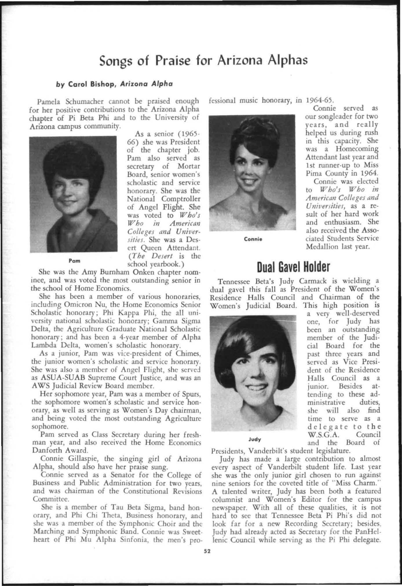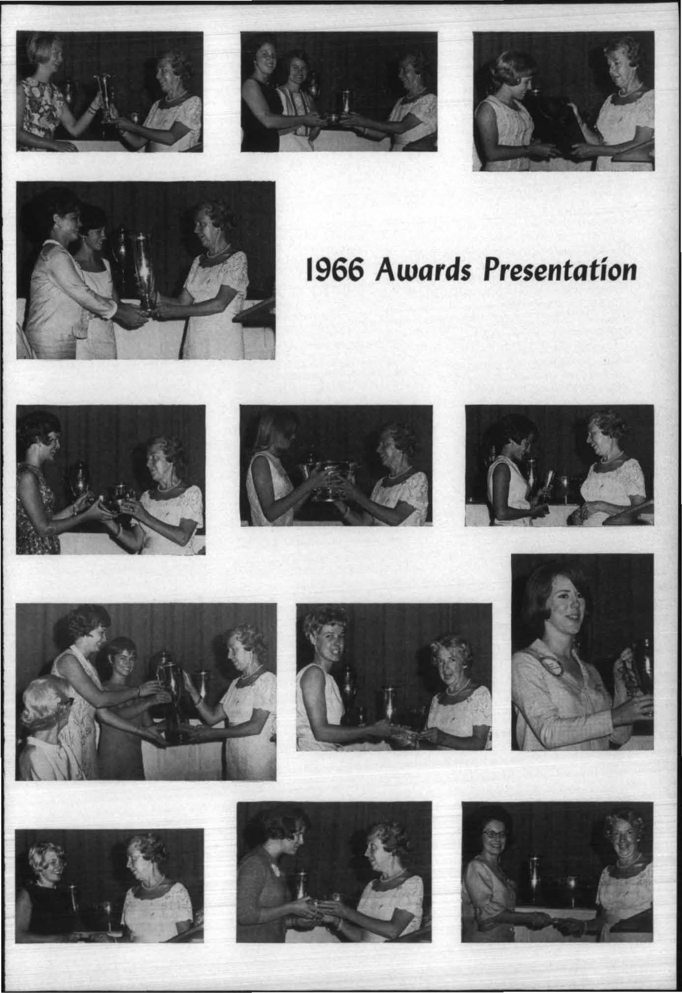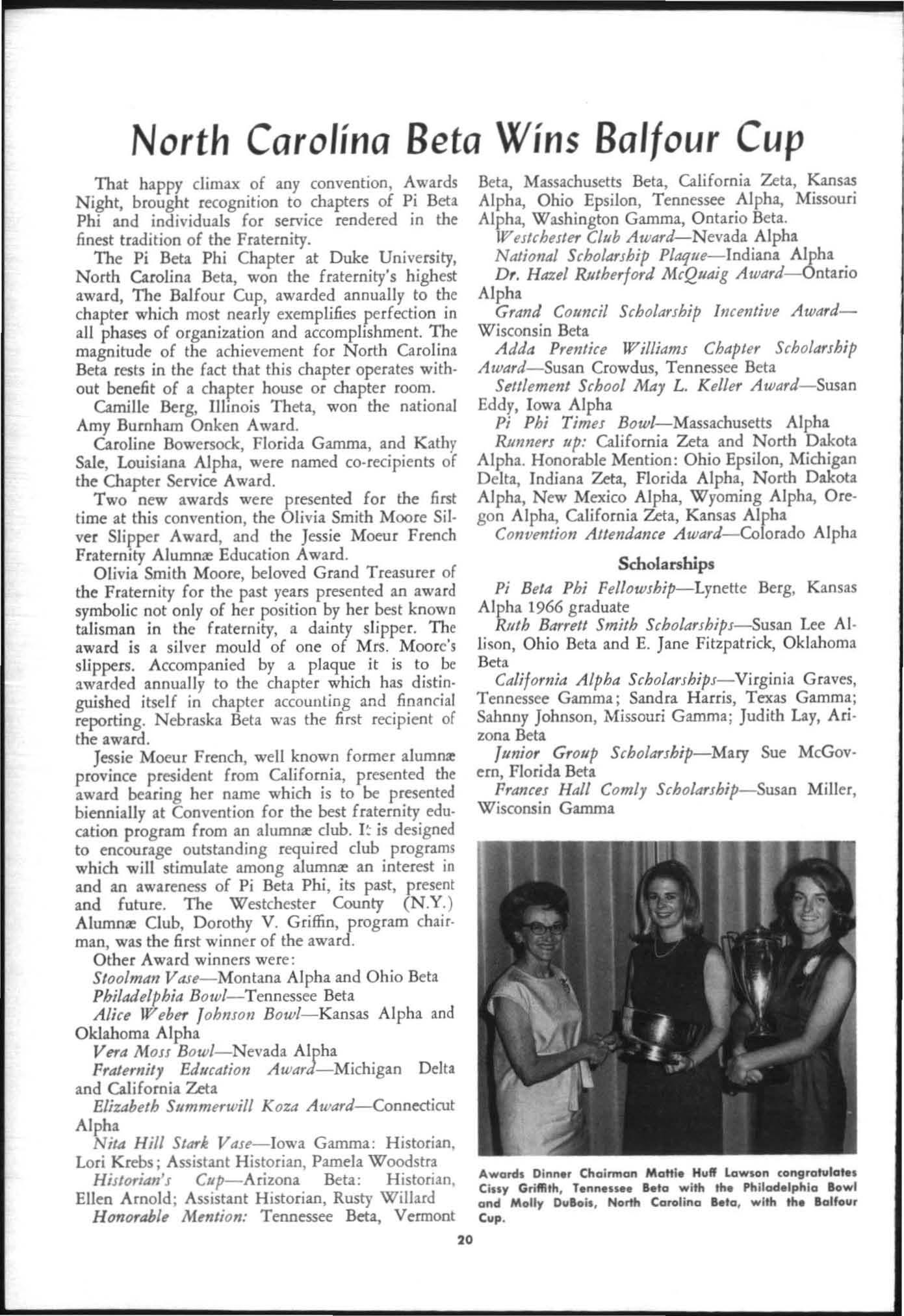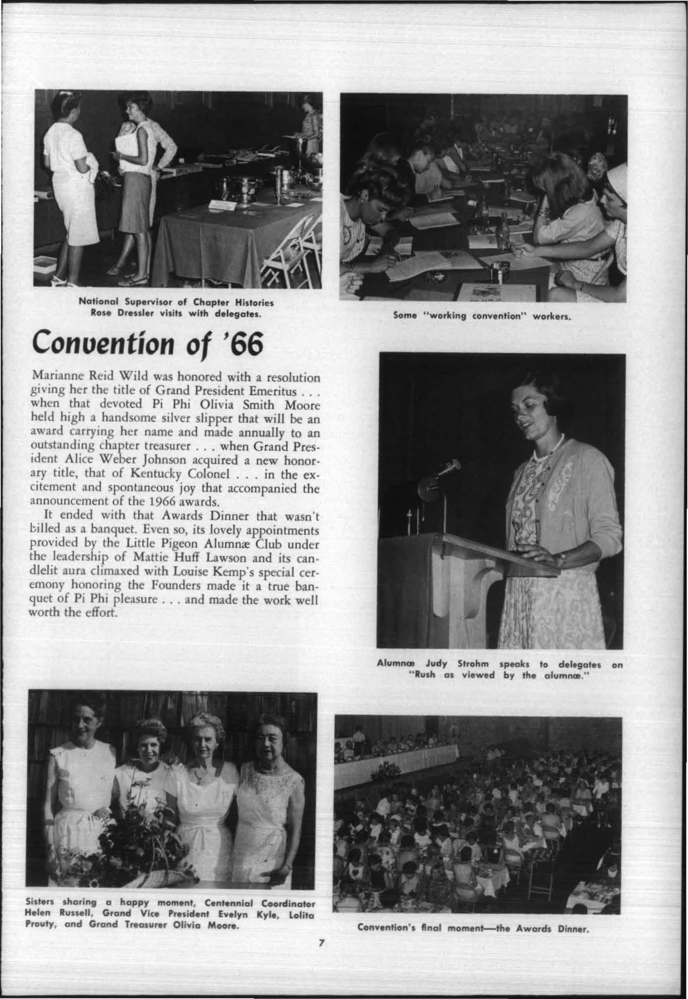 Mariann e Reid Wild was honored with a resolution g iving he r th e tit le o f Grand President Emeritus . wh e n that devoted Pi Phi Olivia Smith Moore held high a h a ndsome silver slippe r that will be an awa rd ca rry ing he r name and made annually to an outstanding chapter treas ure r . when Grand President Ali ce Weber Johnson acquired a new honora ry tit le, that of K e ntu cky Co lonel .. . in the excite ment and spo ntan eo us joy that accompanied the announ cement of th e 1966 awards.