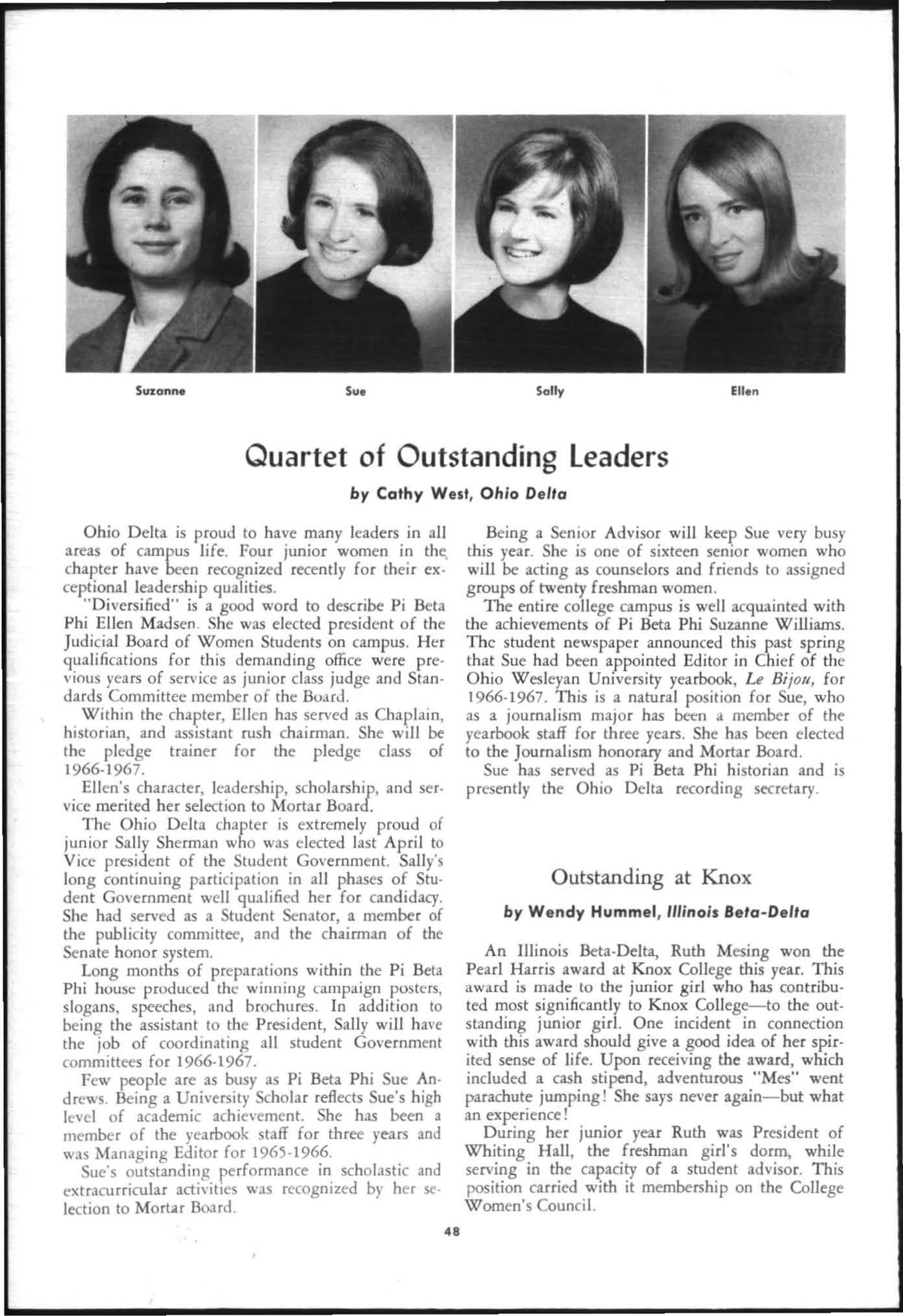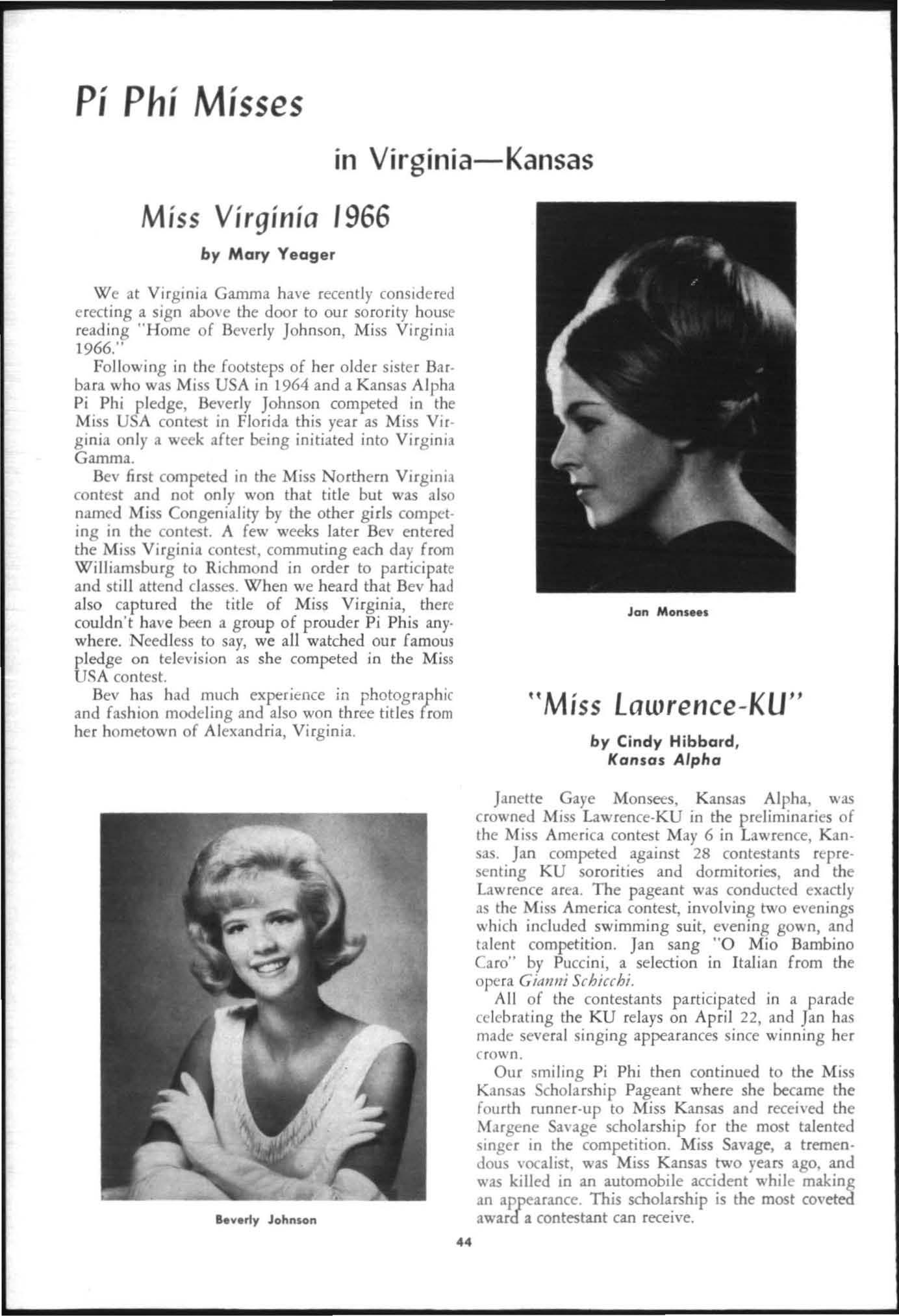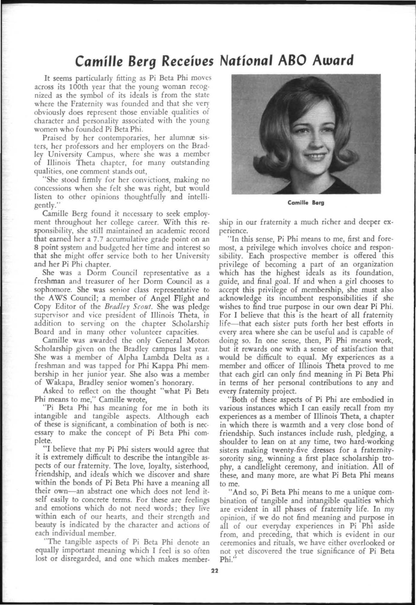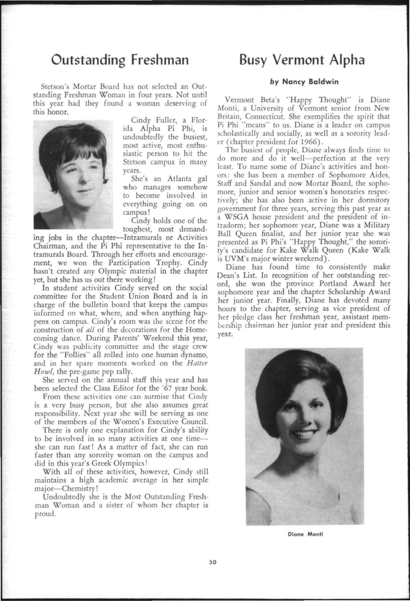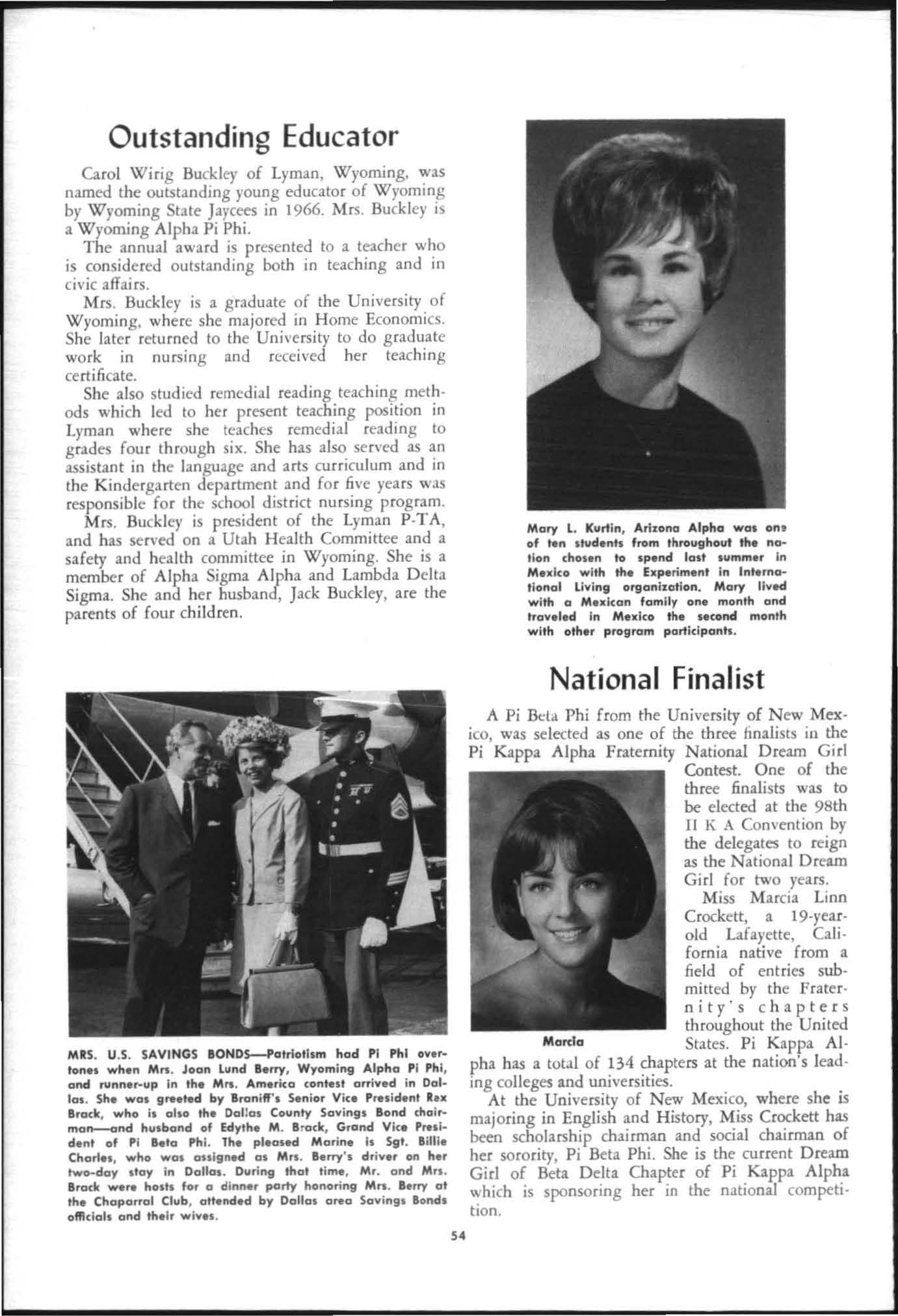 Mariann e Reid Wild was honored with a resolution g iving he r th e tit le o f Grand President Emeritus . wh e n that devoted Pi Phi Olivia Smith Moore held high a h a ndsome silver slippe r that will be an awa rd ca rry ing he r name and made annually to an outstanding chapter treas ure r . when Grand President Ali ce Weber Johnson acquired a new honora ry tit le, that of K e ntu cky Co lonel .. . in the excite ment and spo ntan eo us joy that accompanied the announ cement of th e 1966 awards.