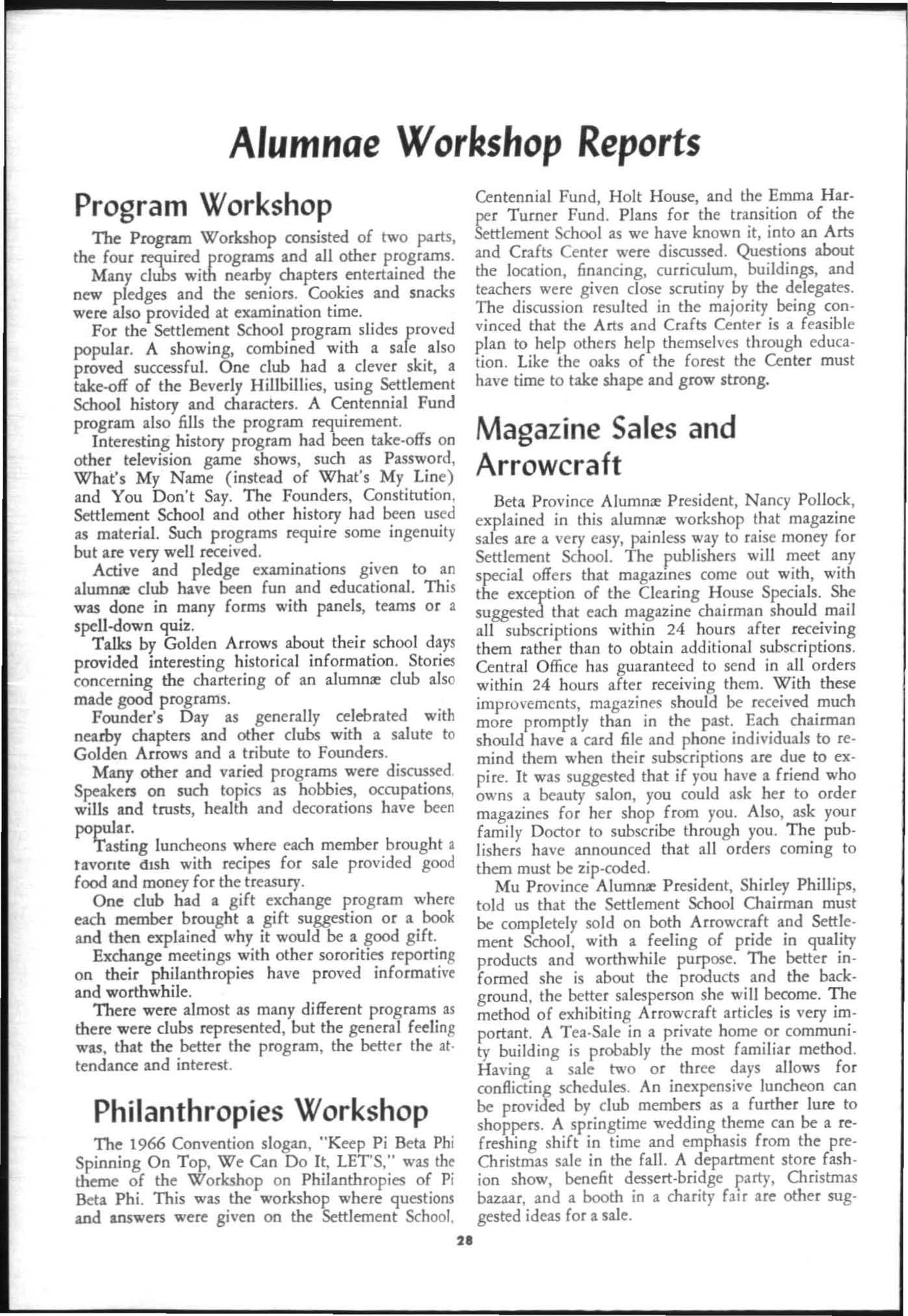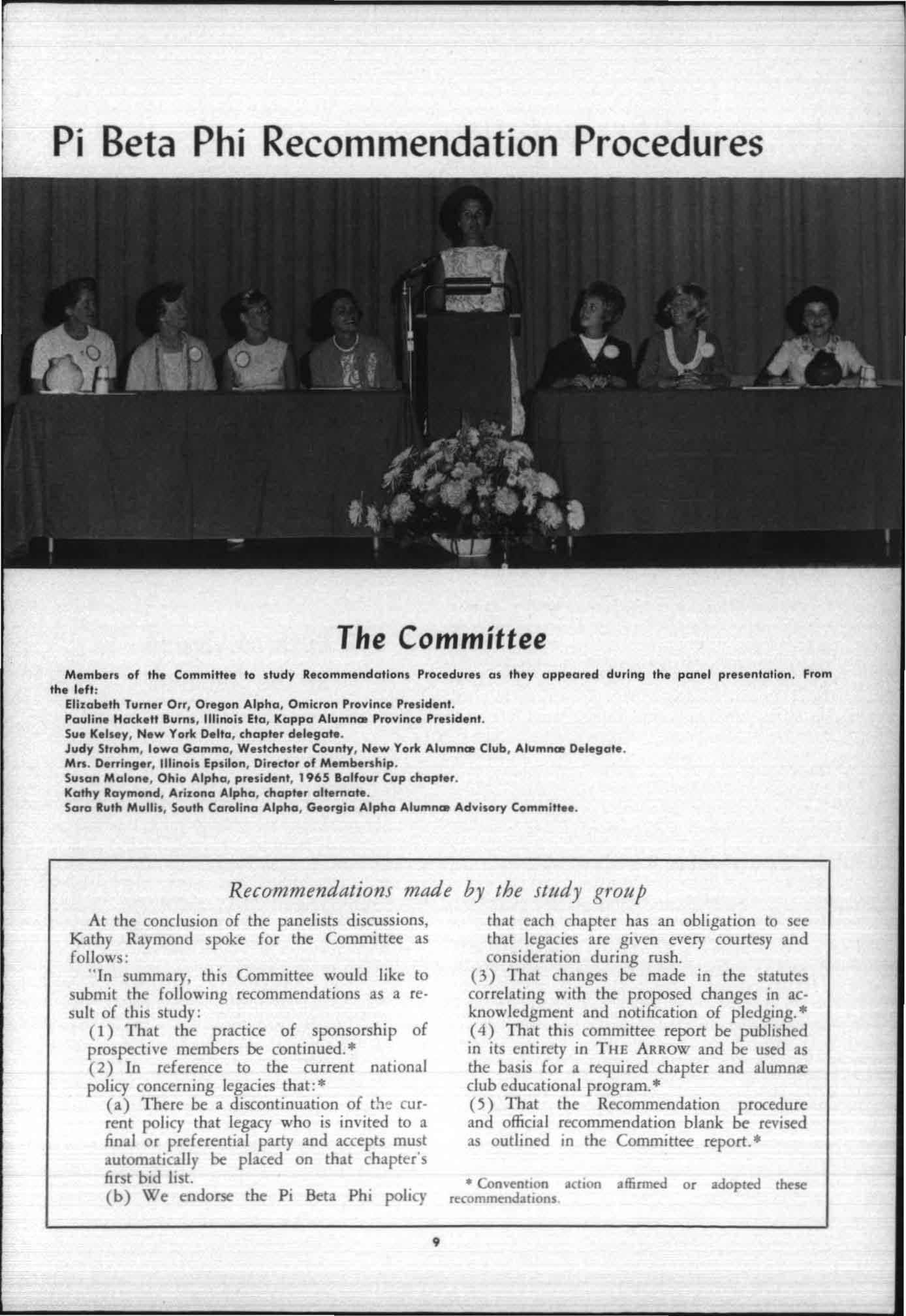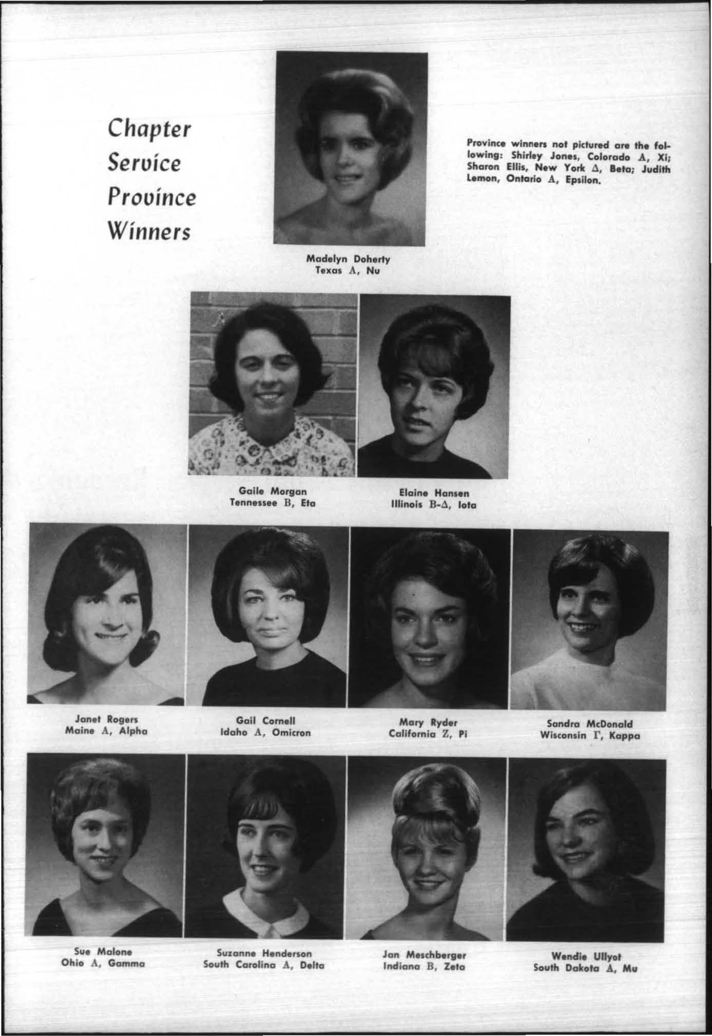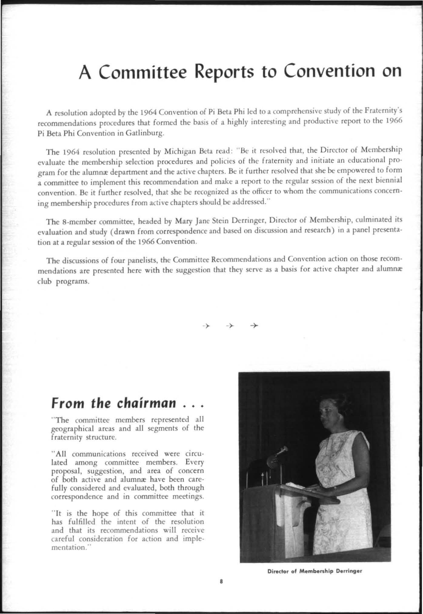 Mu ch was accom p li sh ed in t h t wo rki ng sessiulls f rom th e p resenta tion of t h e pane l of t h e Commi tt ee to St udy Recom mendations P rocedures guided so ab ly by Di rector of Membership Mary J ane D e rr inger in t h e sp lendid works hop on standards led by Un ive rSIty of Okla homa Dean of Women, Dorot h y Truex ... in th e h elpful workshop sessions conducted by de lega tes and officers. T h e Convention also voted to recommend to th e 1967 conve ntion two nominees for Grand Council. Dorot h y Weave r M o rgan, nominee for Grand President and Louise Rosser K emp nominee for Grand Treasurer