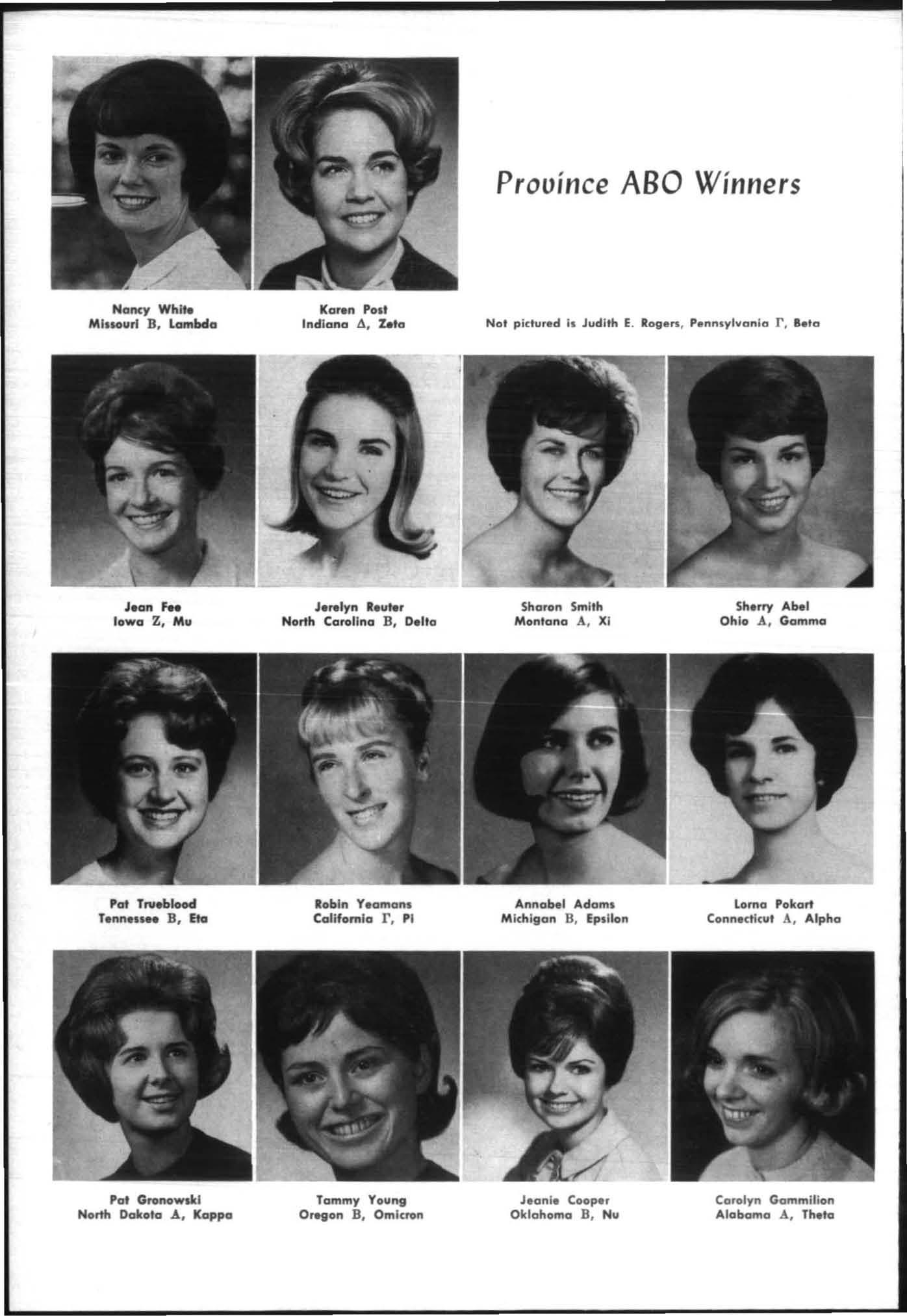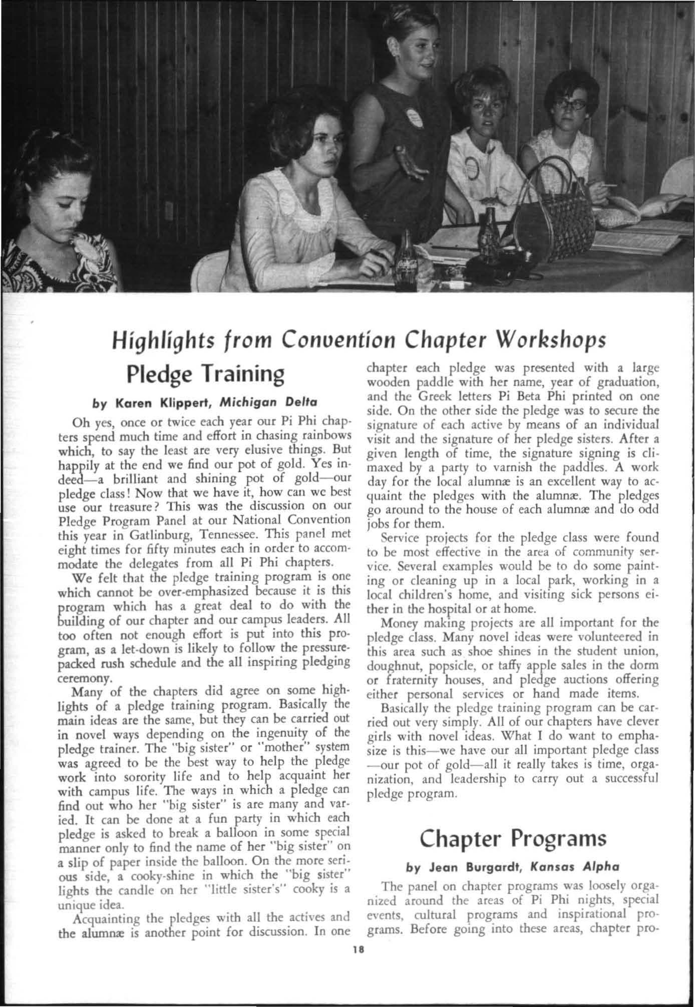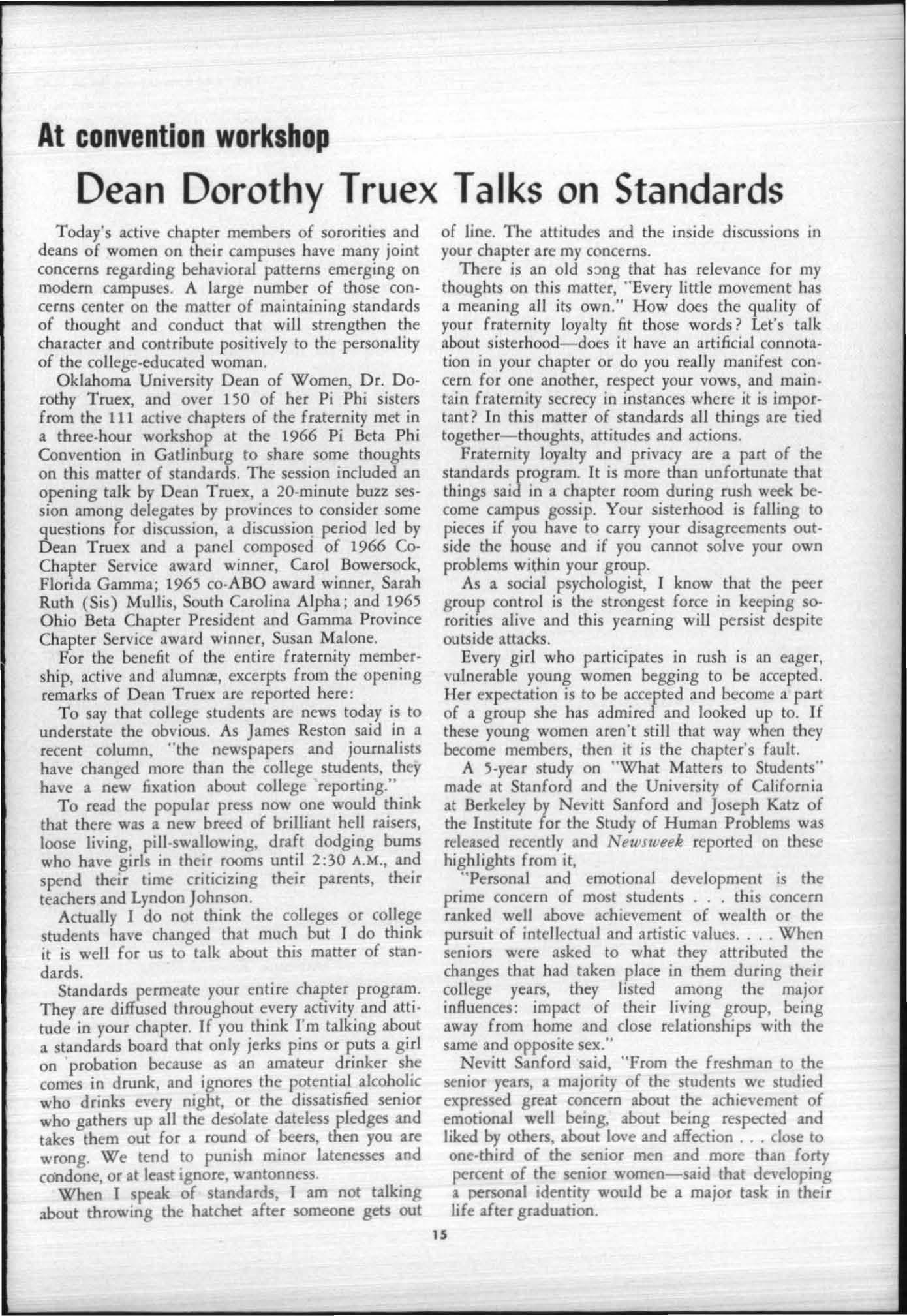 Mu ch was accom p li sh ed in t h t wo rki ng sessiulls f rom th e p resenta tion of t h e pane l of t h e Commi tt ee to St udy Recom mendations P rocedures guided so ab ly by Di rector of Membership Mary J ane D e rr inger in t h e sp lendid works hop on standards led by Un ive rSIty of Okla homa Dean of Women, Dorot h y Truex ... in th e h elpful workshop sessions conducted by de lega tes and officers. T h e Convention also voted to recommend to th e 1967 conve ntion two nominees for Grand Council. Dorot h y Weave r M o rgan, nominee for Grand President and Louise Rosser K emp nominee for Grand Treasurer