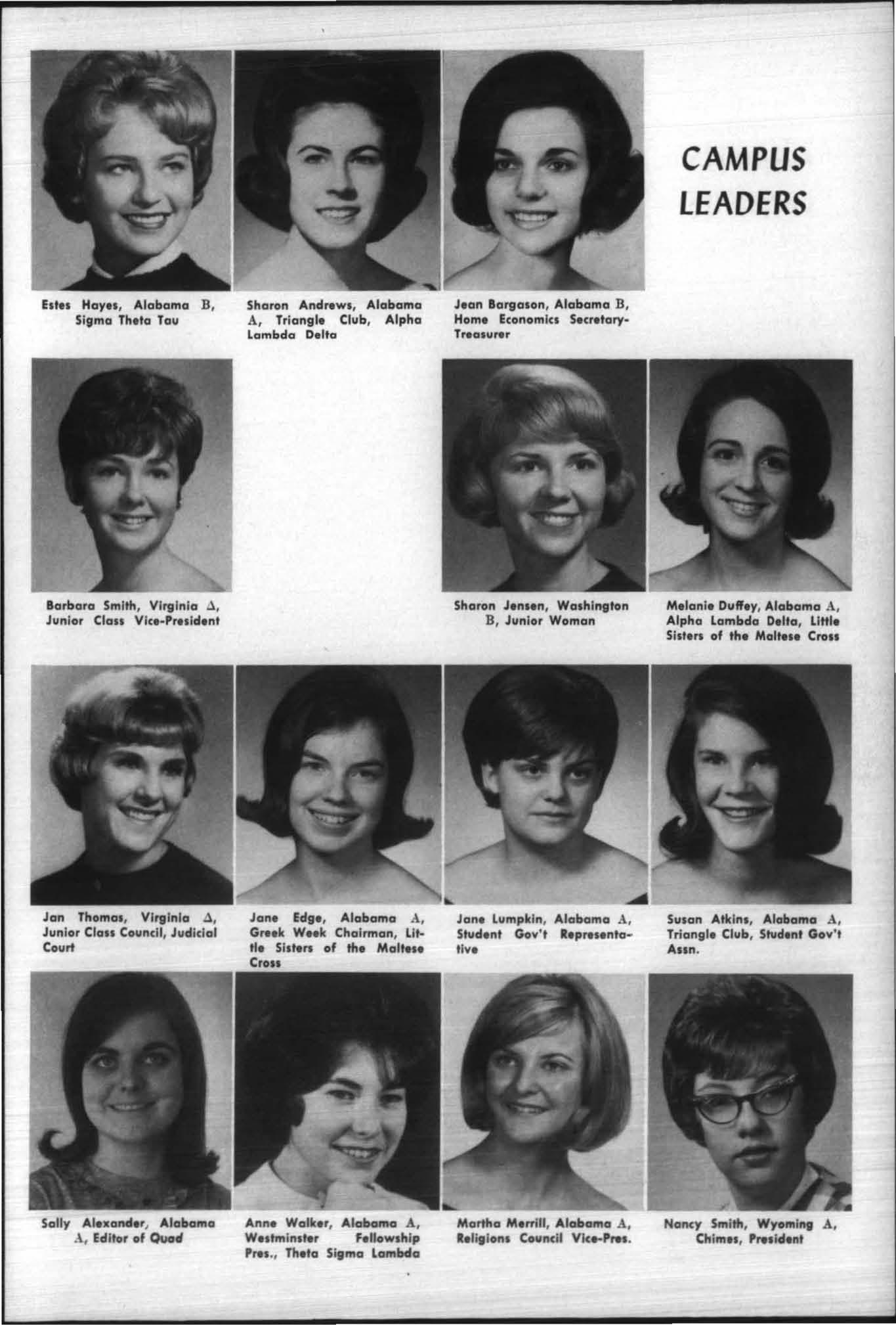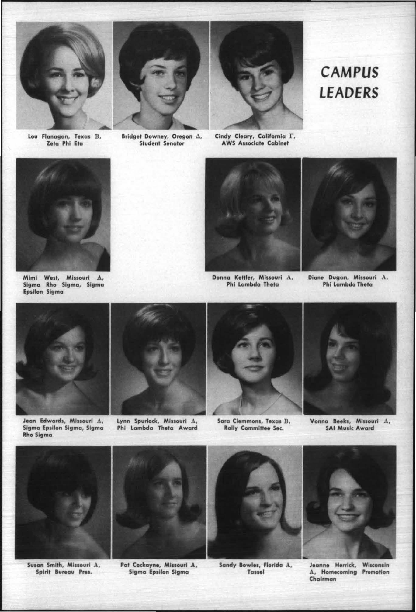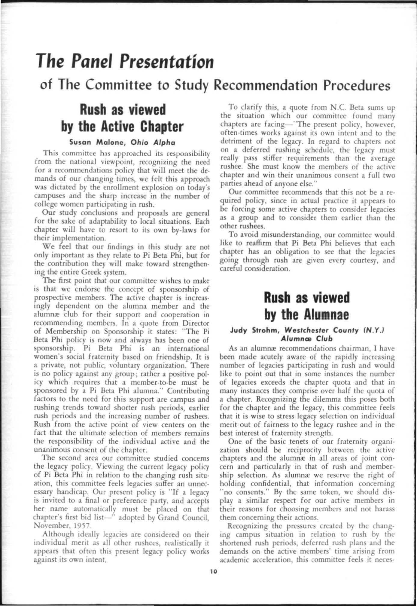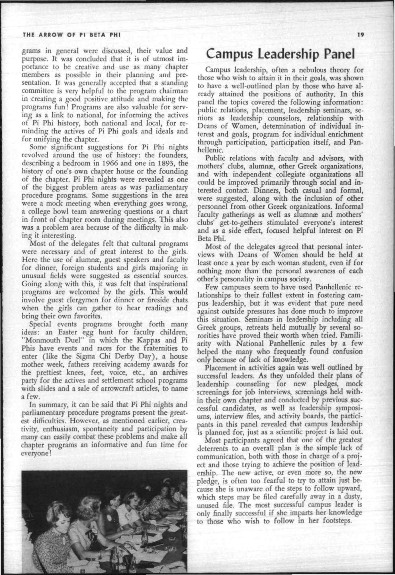 Mu ch was accom p li sh ed in t h t wo rki ng sessiulls f rom th e p resenta tion of t h e pane l of t h e Commi tt ee to St udy Recom mendations P rocedures guided so ab ly by Di rector of Membership Mary J ane D e rr inger in t h e sp lendid works hop on standards led by Un ive rSIty of Okla homa Dean of Women, Dorot h y Truex ... in th e h elpful workshop sessions conducted by de lega tes and officers. T h e Convention also voted to recommend to th e 1967 conve ntion two nominees for Grand Council. Dorot h y Weave r M o rgan, nominee for Grand President and Louise Rosser K emp nominee for Grand Treasurer
