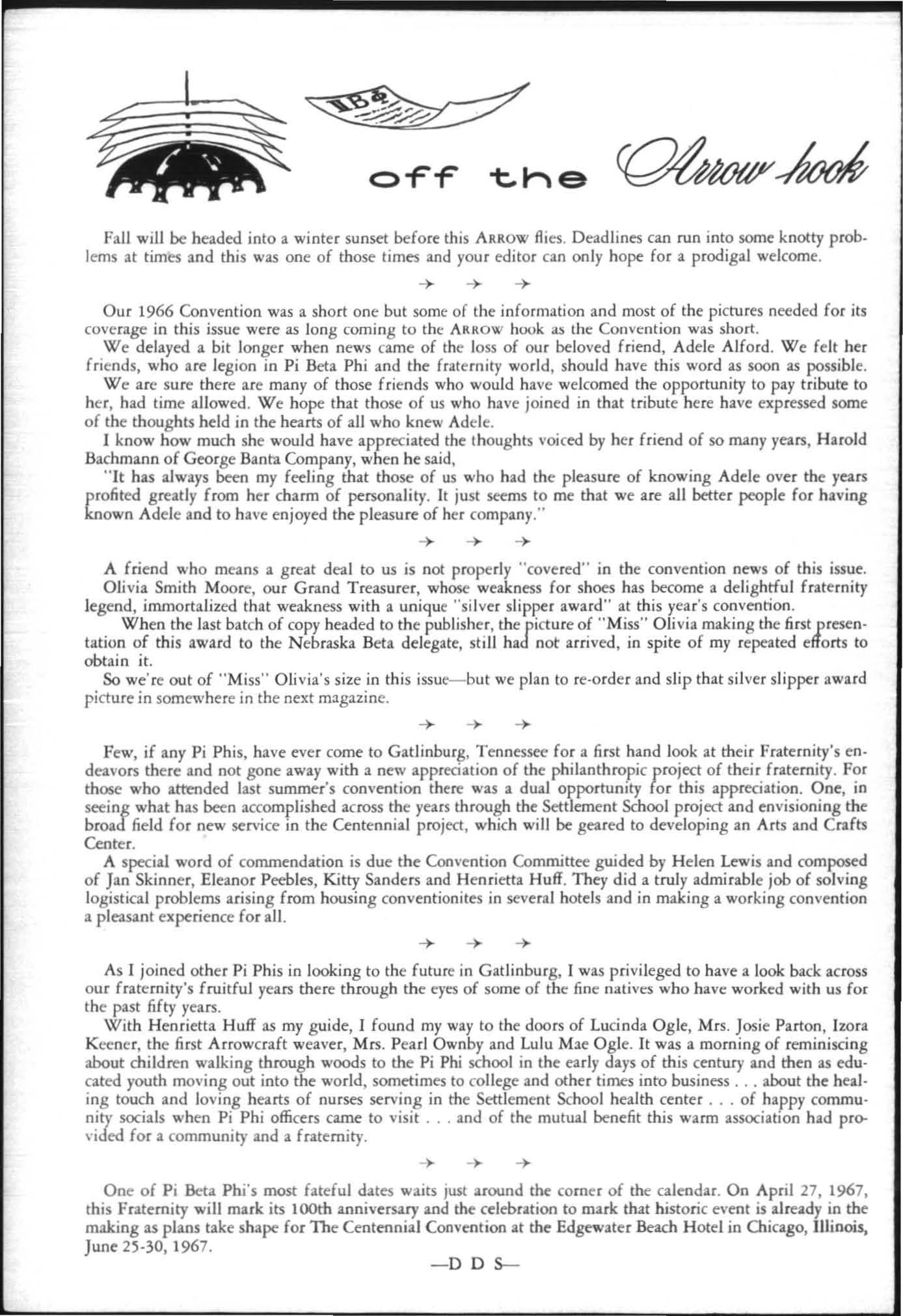 Over h alf of Adele Alford's fifty years of active service in Pi Beta Phi were spent as edito r of THE ARROW, an ollice she filled with capabi lity and dedication from 1934 until 1960. Twenty·four of those )ears s he was a member of the Pi Beta Phi Grand Cou ncil and in this capacity had a wise voice and strong hand in shaping fraternity policy in an important period of g rowth and expansion.