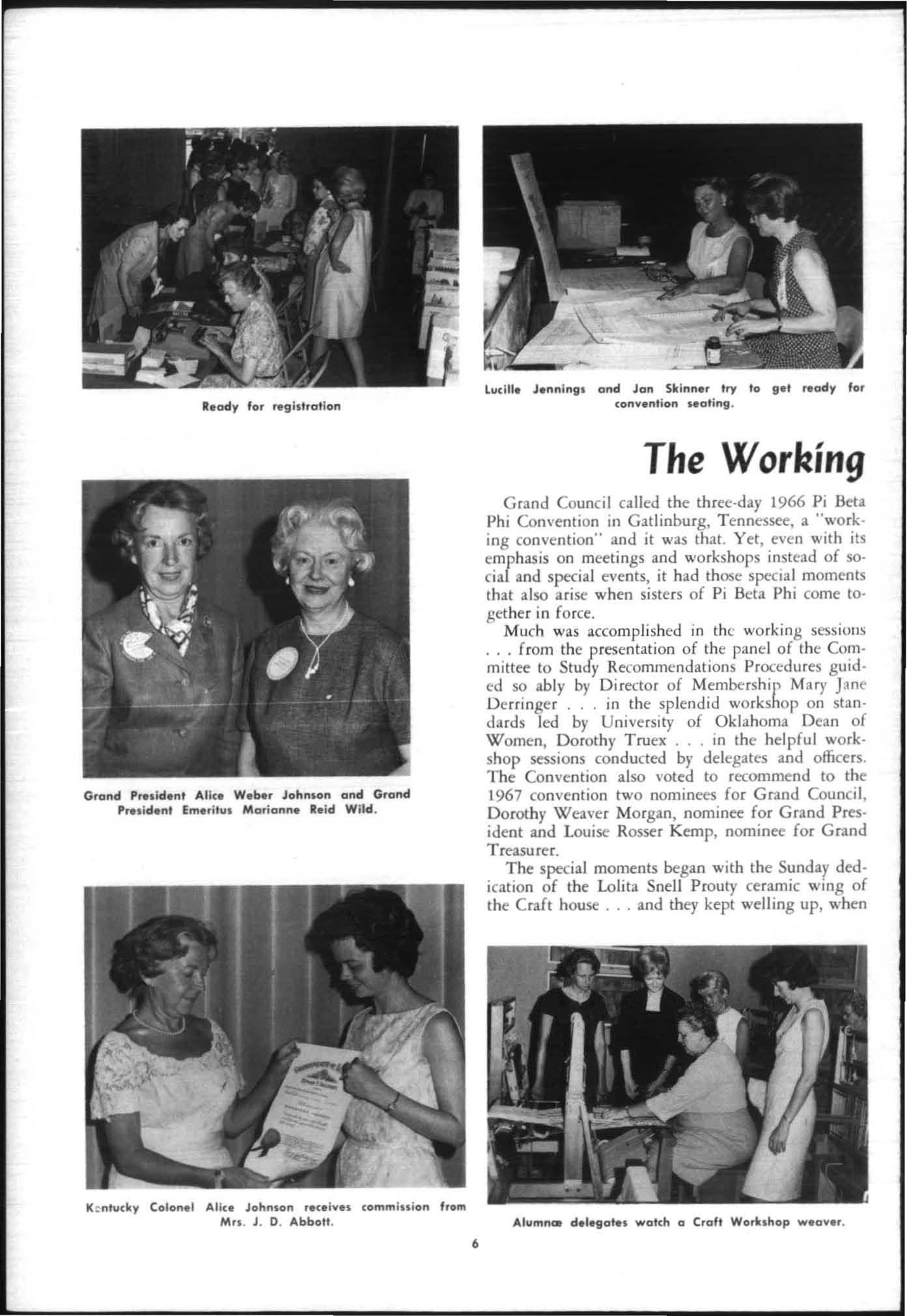 Grand Council called the three-day t966 Pi Beta Ph i Convention in Gatlinburg, Tennessee, a "working convention" and it was that . Yet, even with its emph asis on meetings and wo rks h ops instead of socia l and specia l events, it h ad those specia l moments t h at a lso arise w h en siste rs of P i Beta Ph i come toget he r in fo rce.
