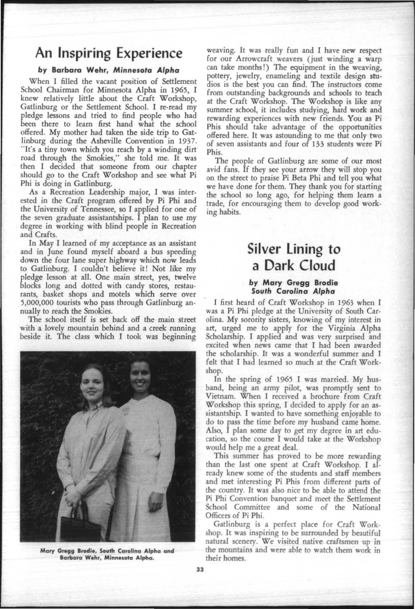 With Henrietta Huff as my guide. I found my way to the doors of Lucinda Ogle Mrs. Josie Parton. Izora K ee ne r, the first Arrowcraft weaver, Mrs . Pearl Ownby and Lulu Mae Ogle . It was a morning of reminiscing about children walking through woods to the Pi Phi school in the early days of this century and tnen as edu· cated youth moving out into the world, sometimes to co llege and other times into business . about the heal· ing touch and loving h ea rts of nurses serving in tne Settlement School health center of happy commu· nity socials when P i Phi officers came to visit . and of the mutual benefit this warm association had provided for a community and a fraternity