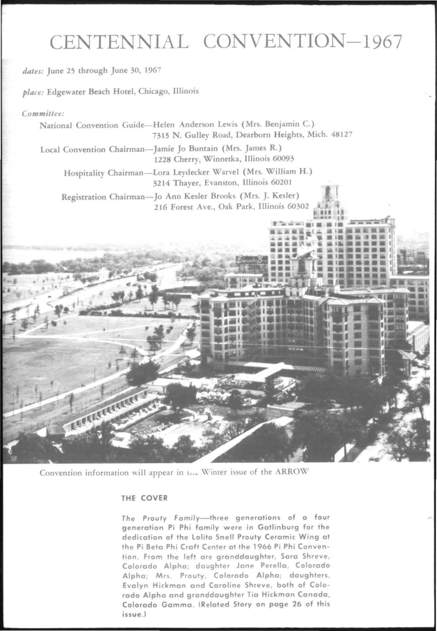 On e of Pi Beta Phi s most fateful dates waits just around the comer of the calendar. On April 27. 1967. this Fraternity will mark its tOOth anniversary and the celebration to mark that histori c event is already in the making as plans take shape for The Centennial Convention at the Edgewater Beach Hotel in Chicago, JlJinois. June 2S·30 1967