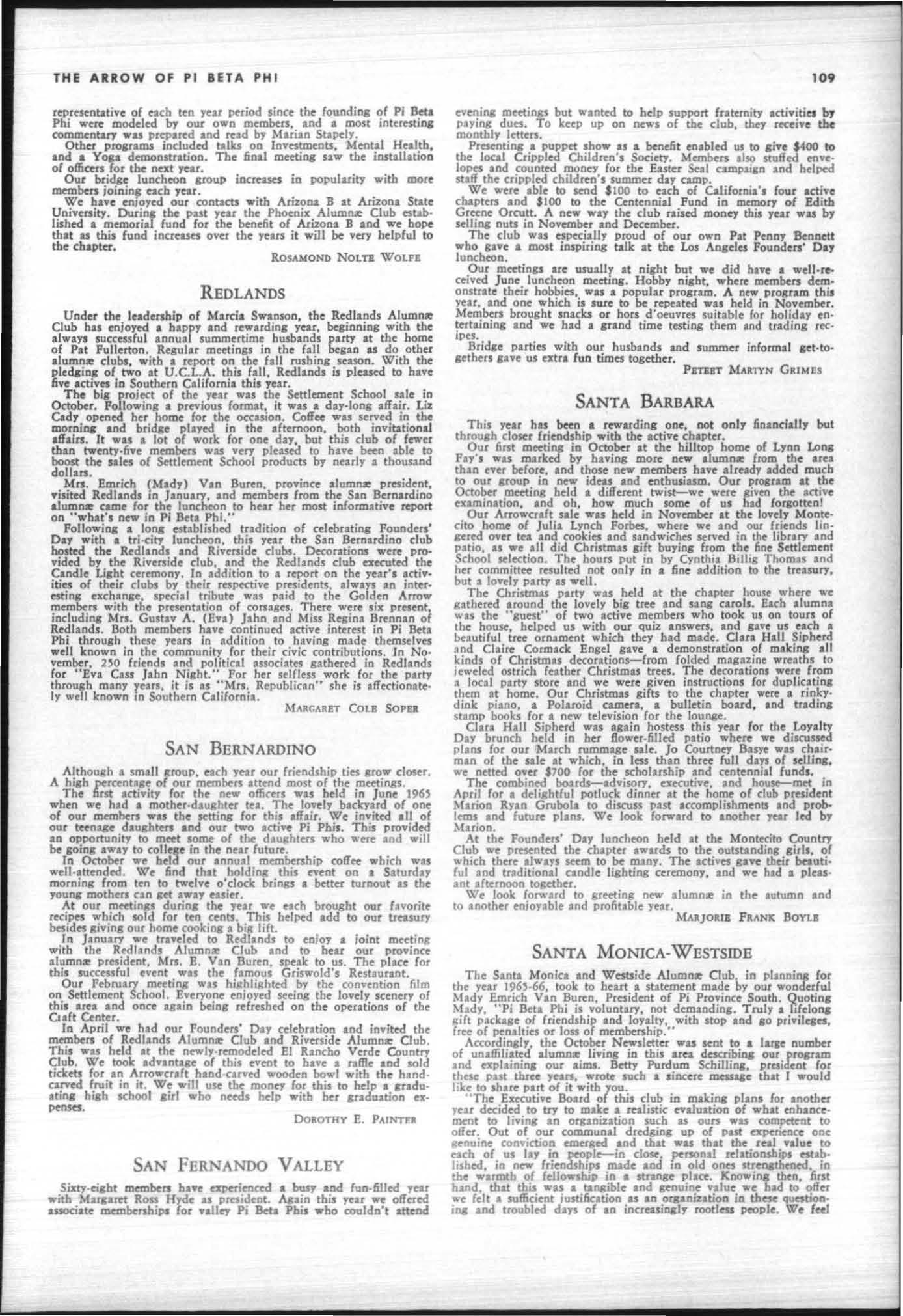 Following her hu sband's death, she h ad settled in California, and had twice served as president of the San Diego Alumna: Club. In the lat e r yearS of her se rvi ce she aided in the chartering of an alumnae club in La Joll a, which was named in he r honor .