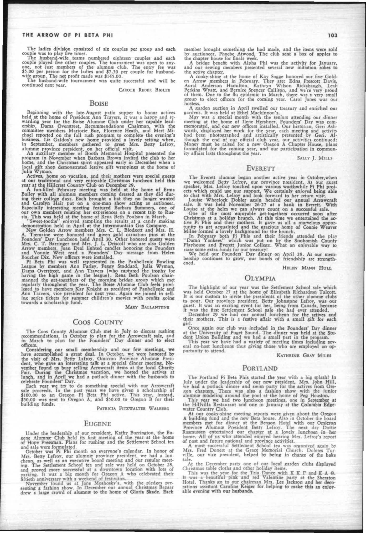 It ended with that Awards Dinner that wasn 't hi ll ed as a banquet. 'Even so, its lovely appointments provided by the Little Pigeon Alumn", C lub und e r the leaders hip of M att ie Huff Lawson and its candlelit aura climaxed with louise Kemp's special ceremony honoring the Founders made it a true banquet of Pi Phi pleasure and made the work well worth the effort.