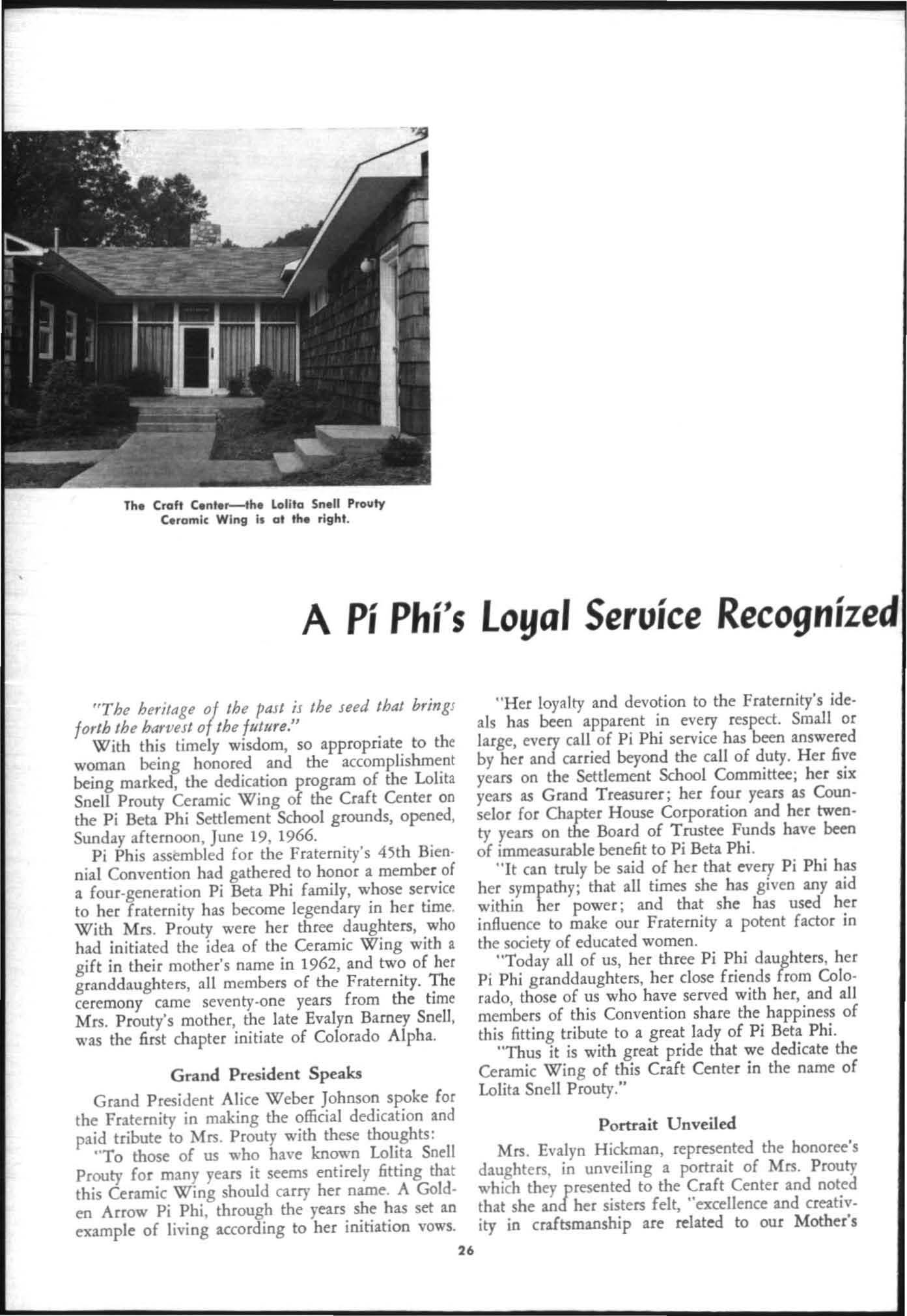 The Prou'y Family-three generations of a four generation Pi Phi family were in Gatlinburg for the dedication of the lolita Snell Prouty Ceramic Wing at the Pi Beta Phi Craft Center at ttle 1966 Pi Phi Convention From the left are granddaughter , Sara Shreve , Colorado Alpha , daughter Jane Perella Colorado Alpha , Mrs Prouty , Colorado Alpha , daughters , Evalyn Hickman and Coraline Shreve , both of Colorado Alpha and granddaughter Tia Hickman Canada , Colorado Gamma (Related Story on poge 26 of this issue.)