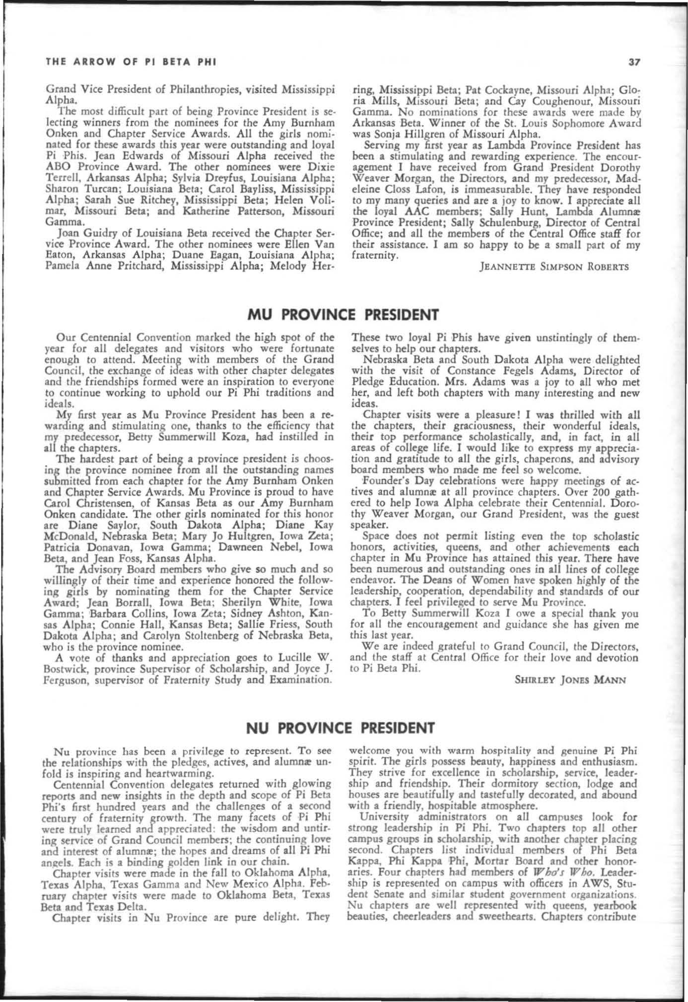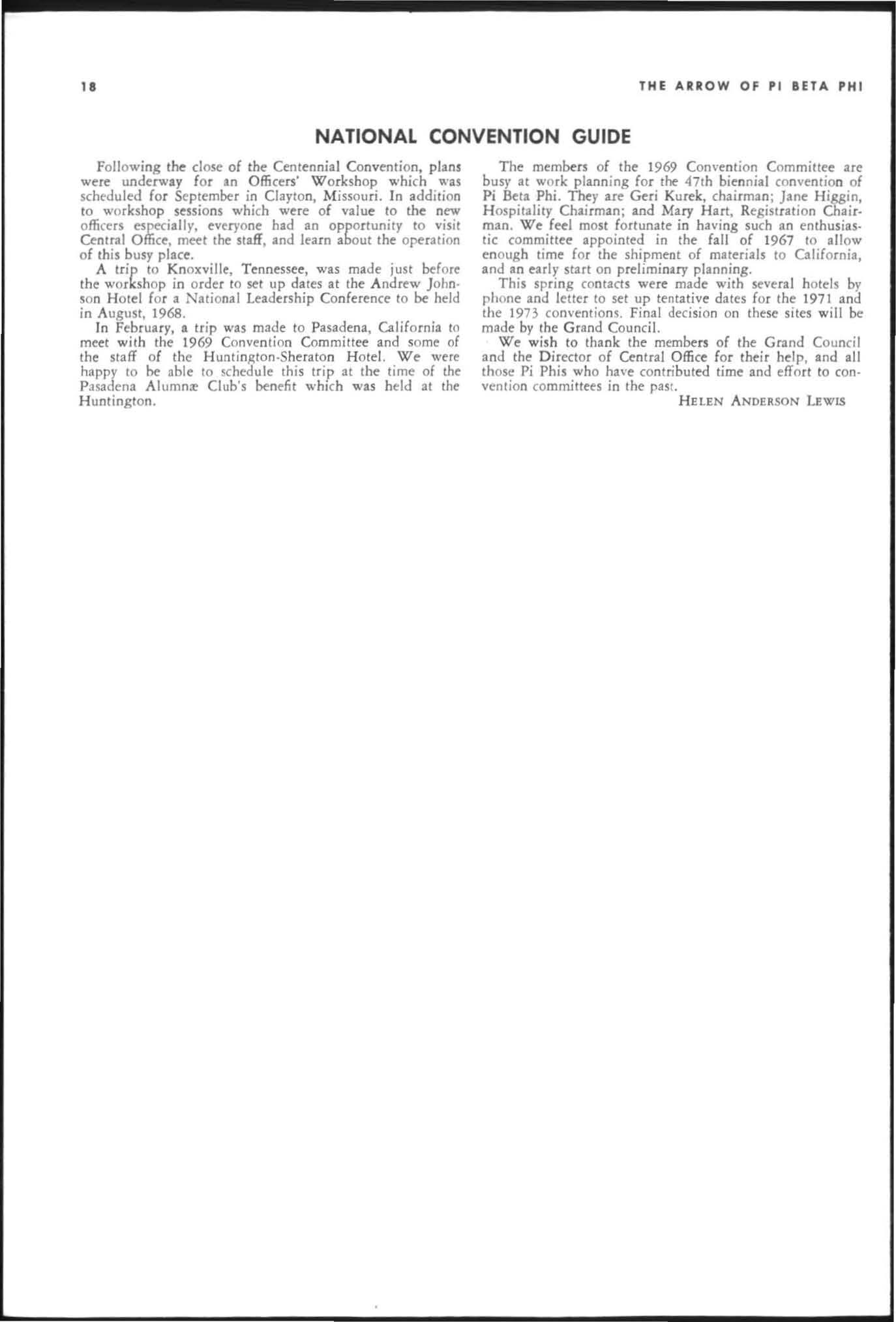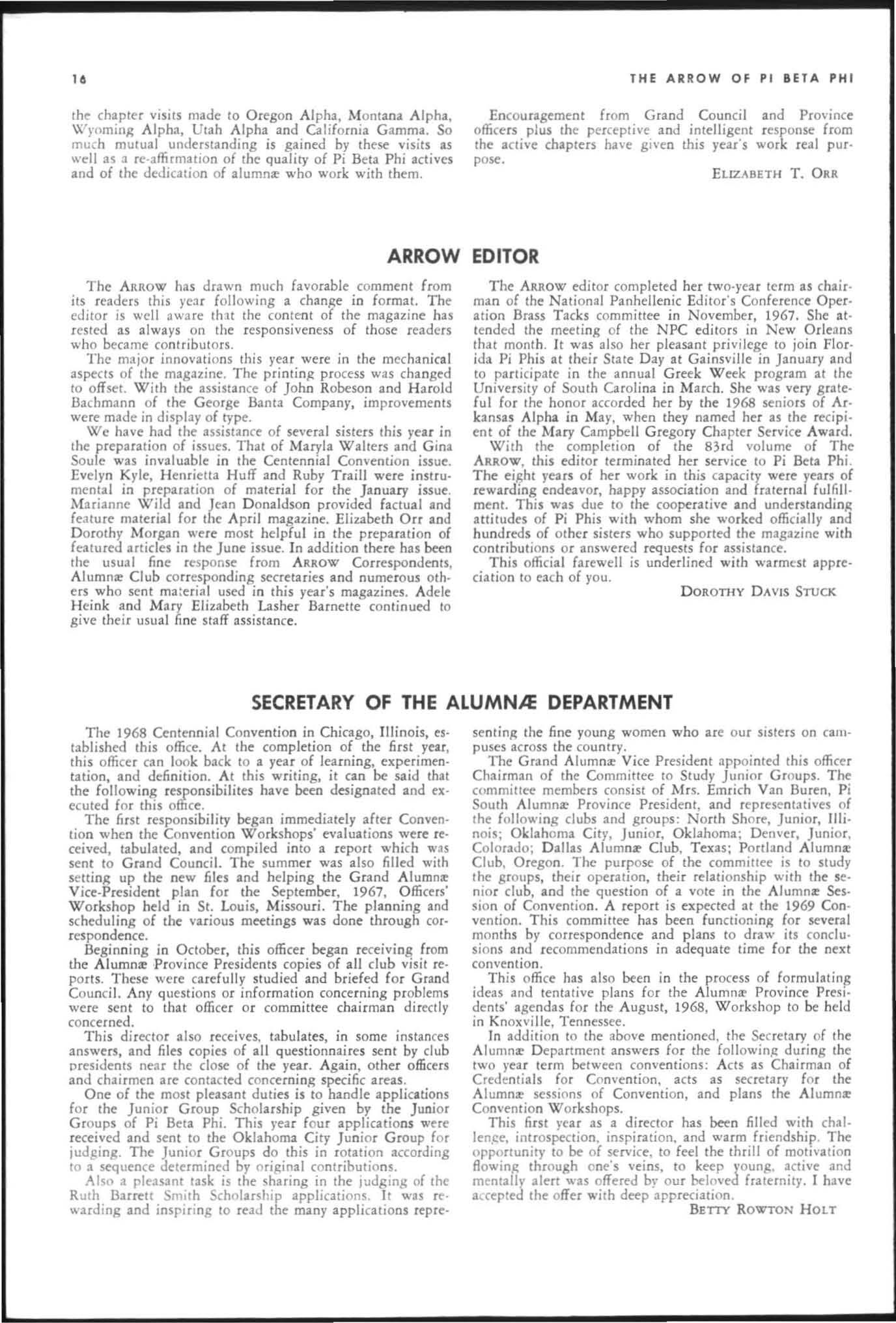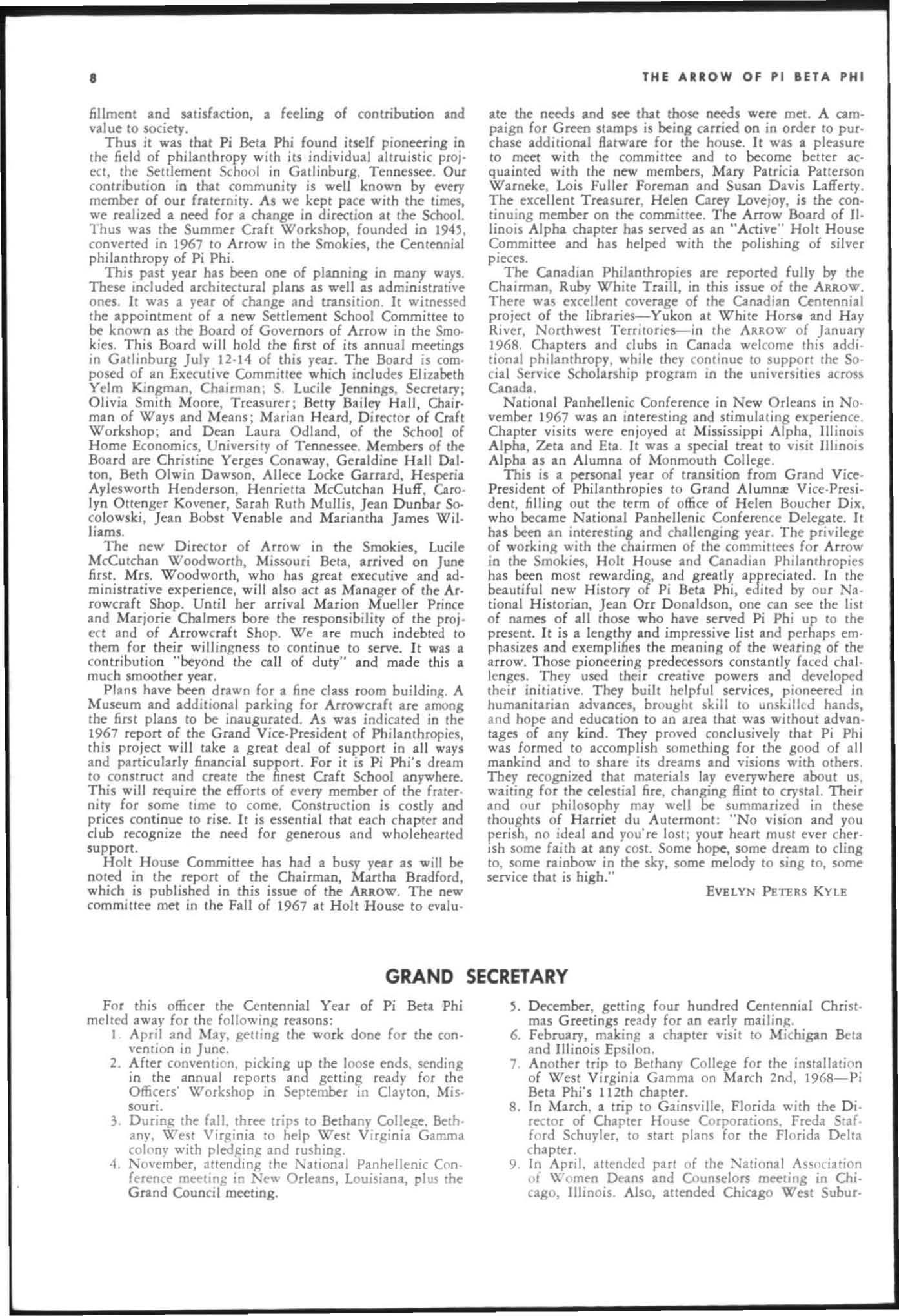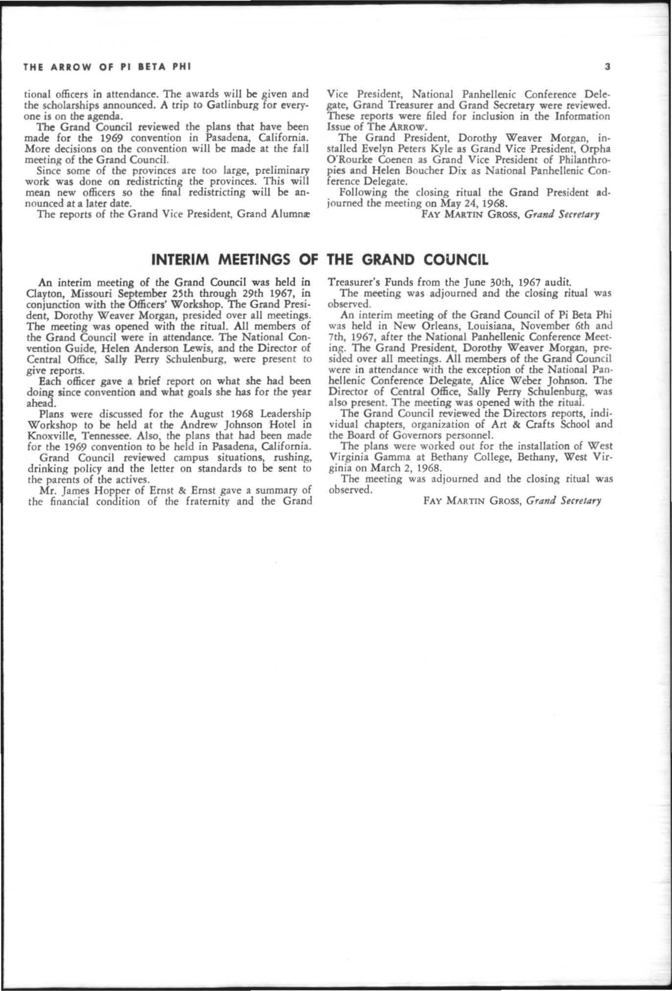 The annual of the Grand Council was h e ld in EI Pa so, T exas begin n ing M ay 19. 1968. The cou ncil meet· i ngs were re cessed M ay 21st through the 23rd fo r the 0.rectors' meetings. The Grand P res id wt, D o rothy Weaver M org :m. presided over all meetings. 'l1le meeting was with the ril ual. All members were p resent exccpt the G rand Vi ce President, Sarah/ane Paulson and the Grand Alumn:e Vice President, H elen Boucher Dix, who a rr ived on June 21st and were in attendance fo r the remainder of the meetings. Their proxy v Oles were filed with the Grand President. The incoming Grand Vi ce Presi dent of Philanthropies, Orpha O'Rourke and the D irector of Central Office, Sally Perry Schulenburg, were present for all the meetings. on annual repo r ts and r l!'{om mendati ons the Grand Counci l is privileged to announce the schob rships and awards: