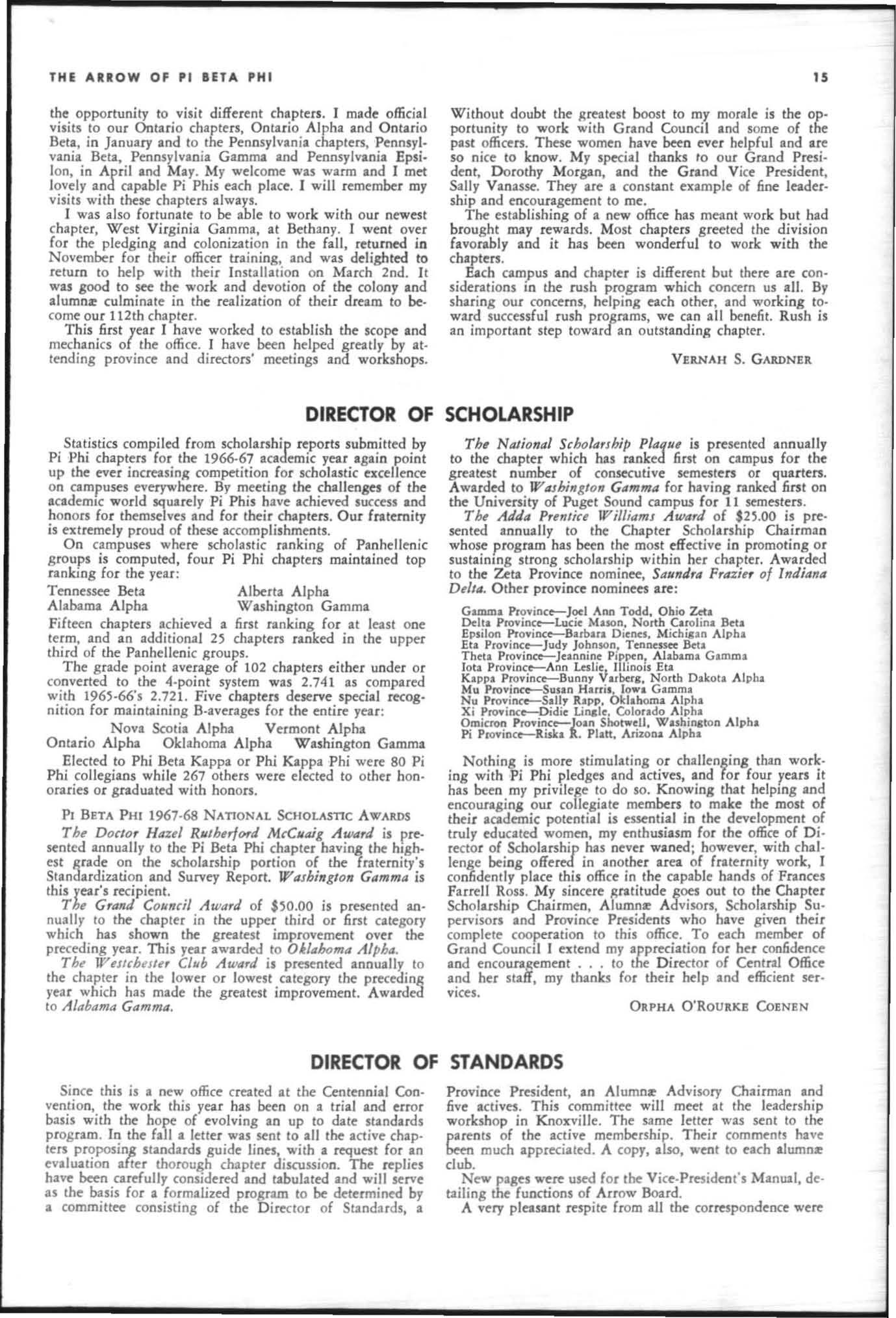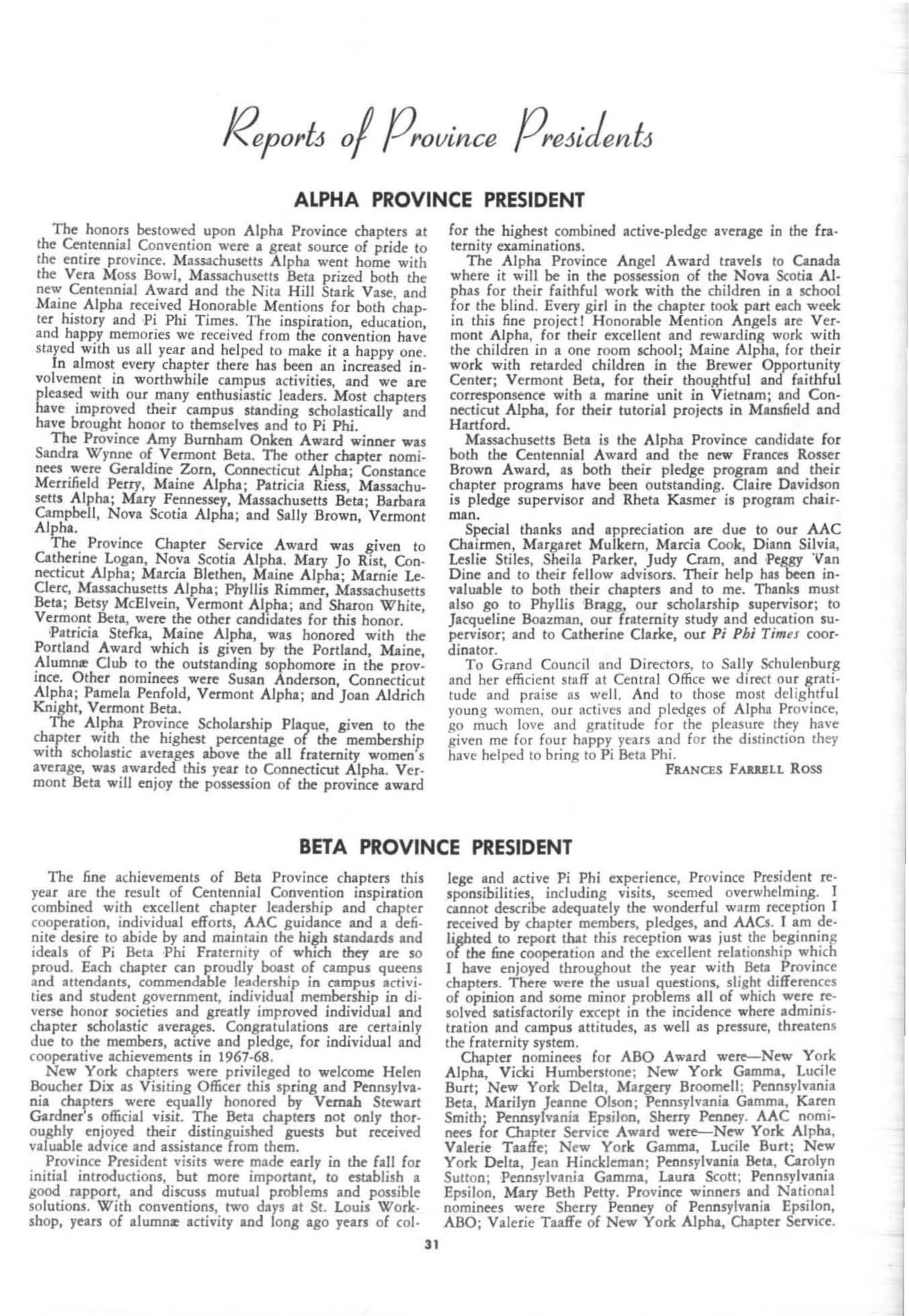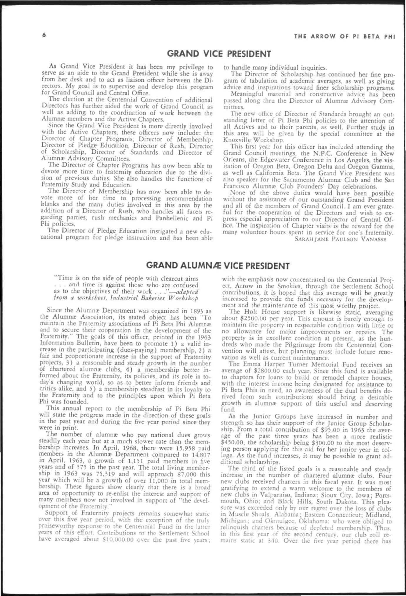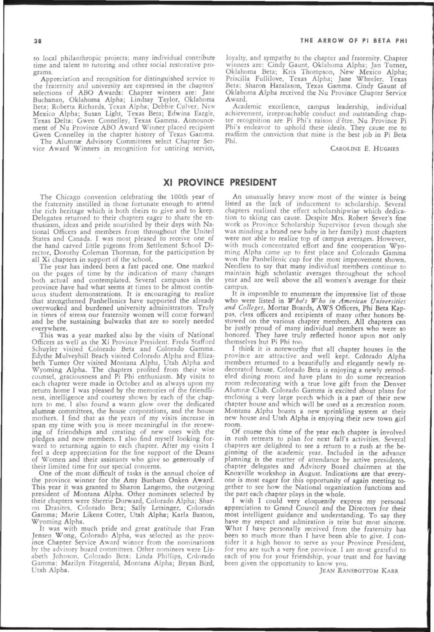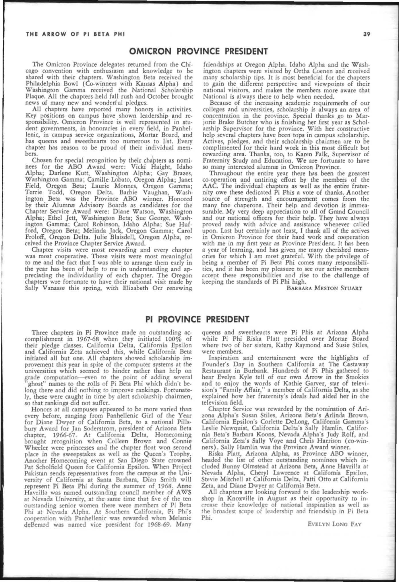 The annual of the Grand Council was h e ld in EI Pa so, T exas begin n ing M ay 19. 1968. The cou ncil meet· i ngs were re cessed M ay 21st through the 23rd fo r the 0.rectors' meetings. The Grand P res id wt, D o rothy Weaver M org :m. presided over all meetings. 'l1le meeting was with the ril ual. All members were p resent exccpt the G rand Vi ce President, Sarah/ane Paulson and the Grand Alumn:e Vice President, H elen Boucher Dix, who a rr ived on June 21st and were in attendance fo r the remainder of the meetings. Their proxy v Oles were filed with the Grand President. The incoming Grand Vi ce Presi dent of Philanthropies, Orpha O'Rourke and the D irector of Central Office, Sally Perry Schulenburg, were present for all the meetings. on annual repo r ts and r l!'{om mendati ons the Grand Counci l is privileged to announce the schob rships and awards:
