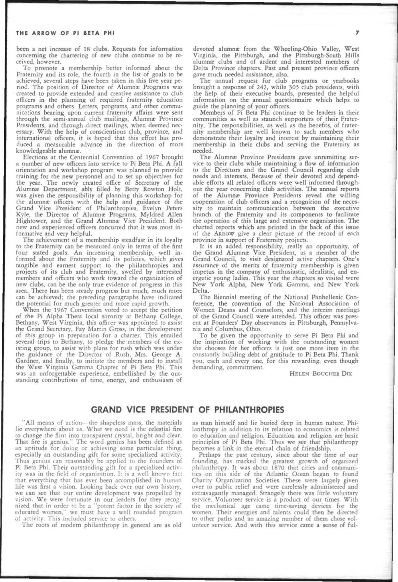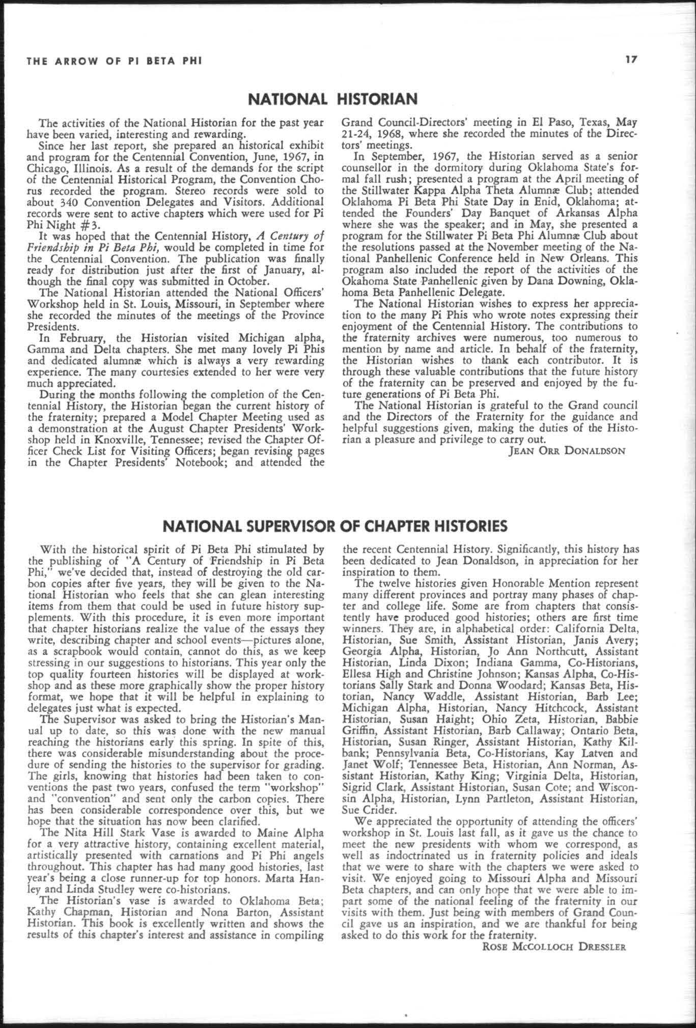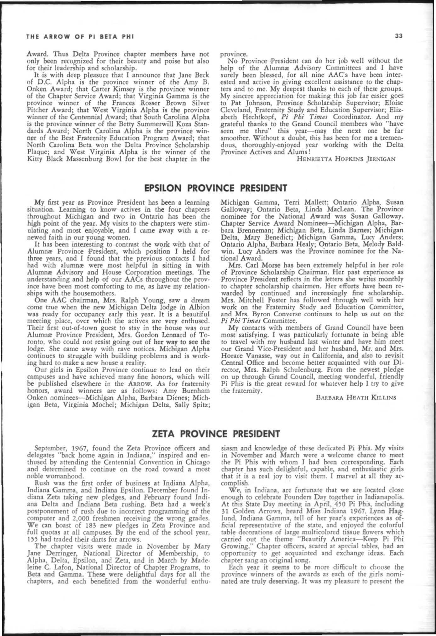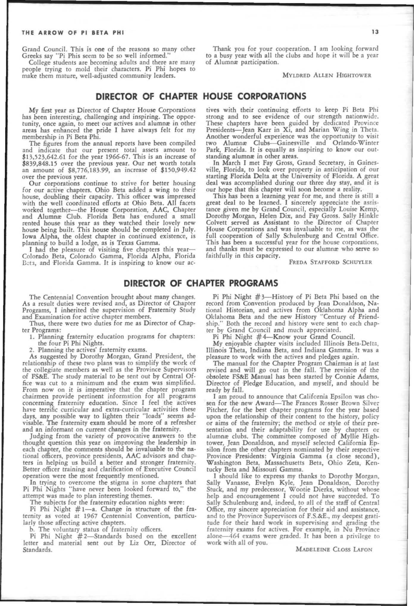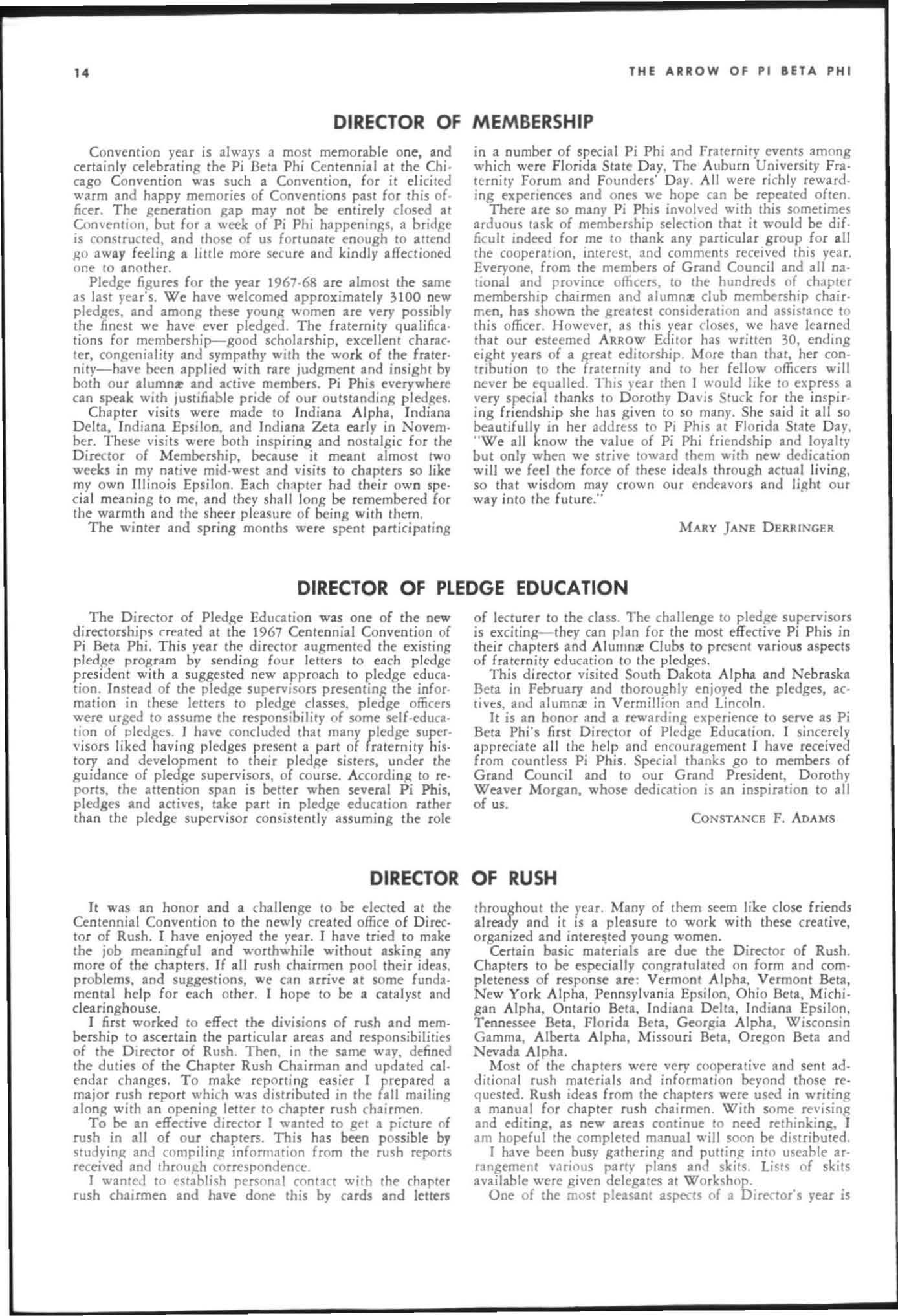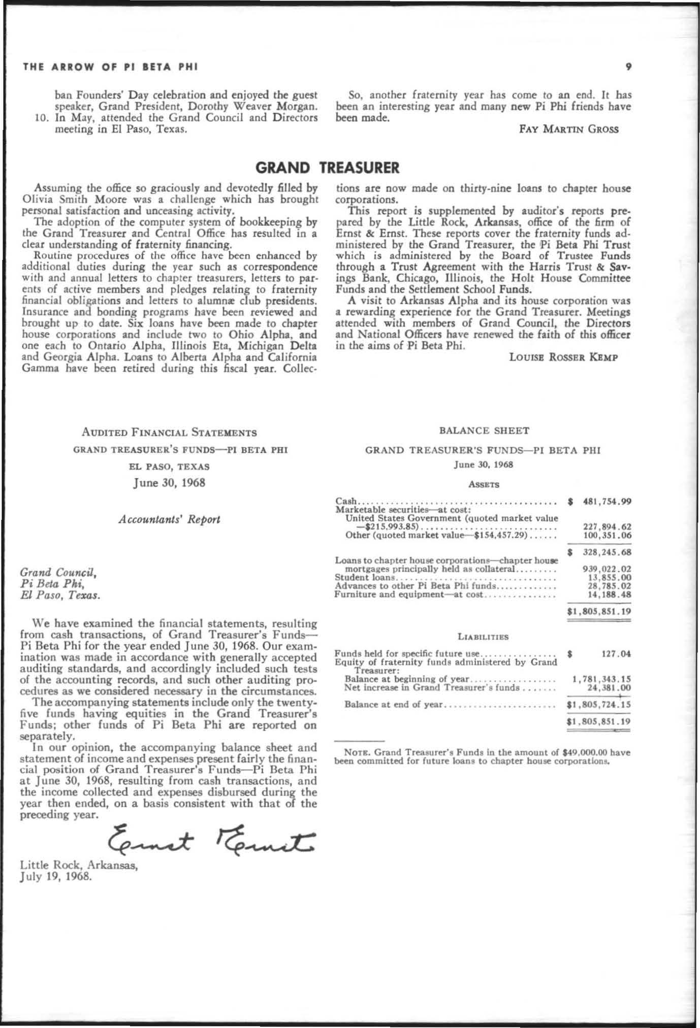 The annual of the Grand Council was h e ld in EI Pa so, T exas begin n ing M ay 19. 1968. The cou ncil meet· i ngs were re cessed M ay 21st through the 23rd fo r the 0.rectors' meetings. The Grand P res id wt, D o rothy Weaver M org :m. presided over all meetings. 'l1le meeting was with the ril ual. All members were p resent exccpt the G rand Vi ce President, Sarah/ane Paulson and the Grand Alumn:e Vice President, H elen Boucher Dix, who a rr ived on June 21st and were in attendance fo r the remainder of the meetings. Their proxy v Oles were filed with the Grand President. The incoming Grand Vi ce Presi dent of Philanthropies, Orpha O'Rourke and the D irector of Central Office, Sally Perry Schulenburg, were present for all the meetings. on annual repo r ts and r l!'{om mendati ons the Grand Counci l is privileged to announce the schob rships and awards: