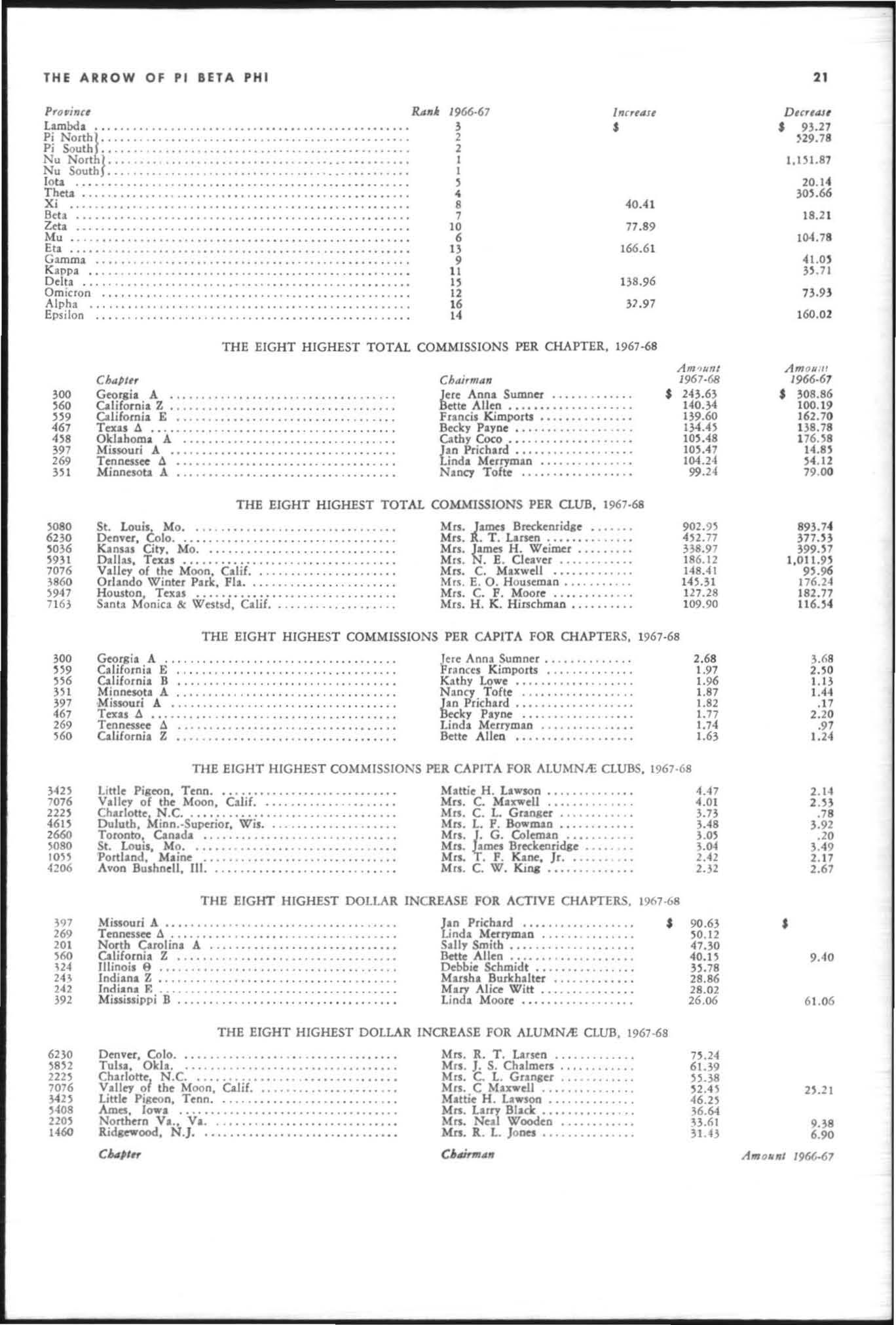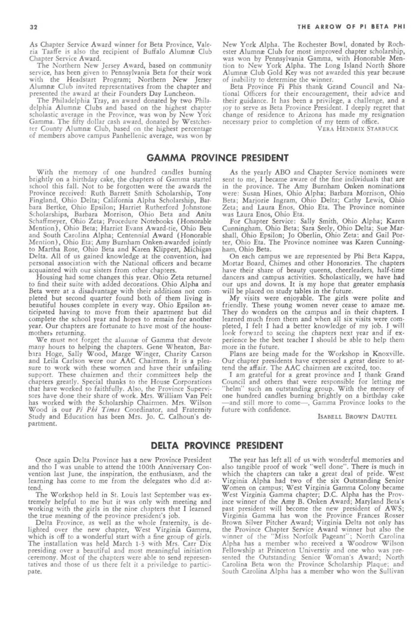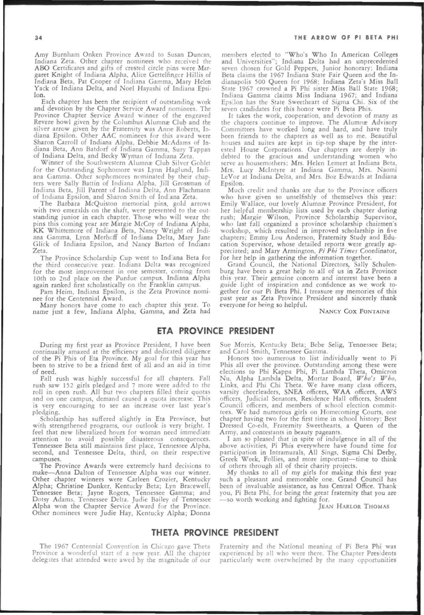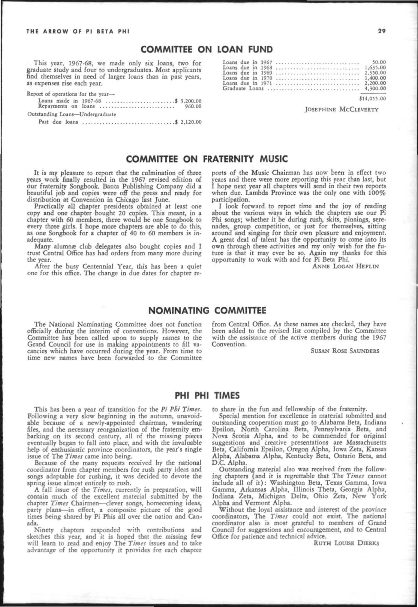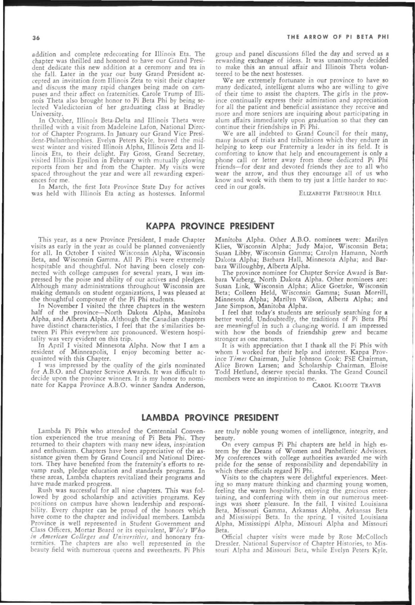 The annual of the Grand Council was h e ld in EI Pa so, T exas begin n ing M ay 19. 1968. The cou ncil meet· i ngs were re cessed M ay 21st through the 23rd fo r the 0.rectors' meetings. The Grand P res id wt, D o rothy Weaver M org :m. presided over all meetings. 'l1le meeting was with the ril ual. All members were p resent exccpt the G rand Vi ce President, Sarah/ane Paulson and the Grand Alumn:e Vice President, H elen Boucher Dix, who a rr ived on June 21st and were in attendance fo r the remainder of the meetings. Their proxy v Oles were filed with the Grand President. The incoming Grand Vi ce Presi dent of Philanthropies, Orpha O'Rourke and the D irector of Central Office, Sally Perry Schulenburg, were present for all the meetings. on annual repo r ts and r l!'{om mendati ons the Grand Counci l is privileged to announce the schob rships and awards: