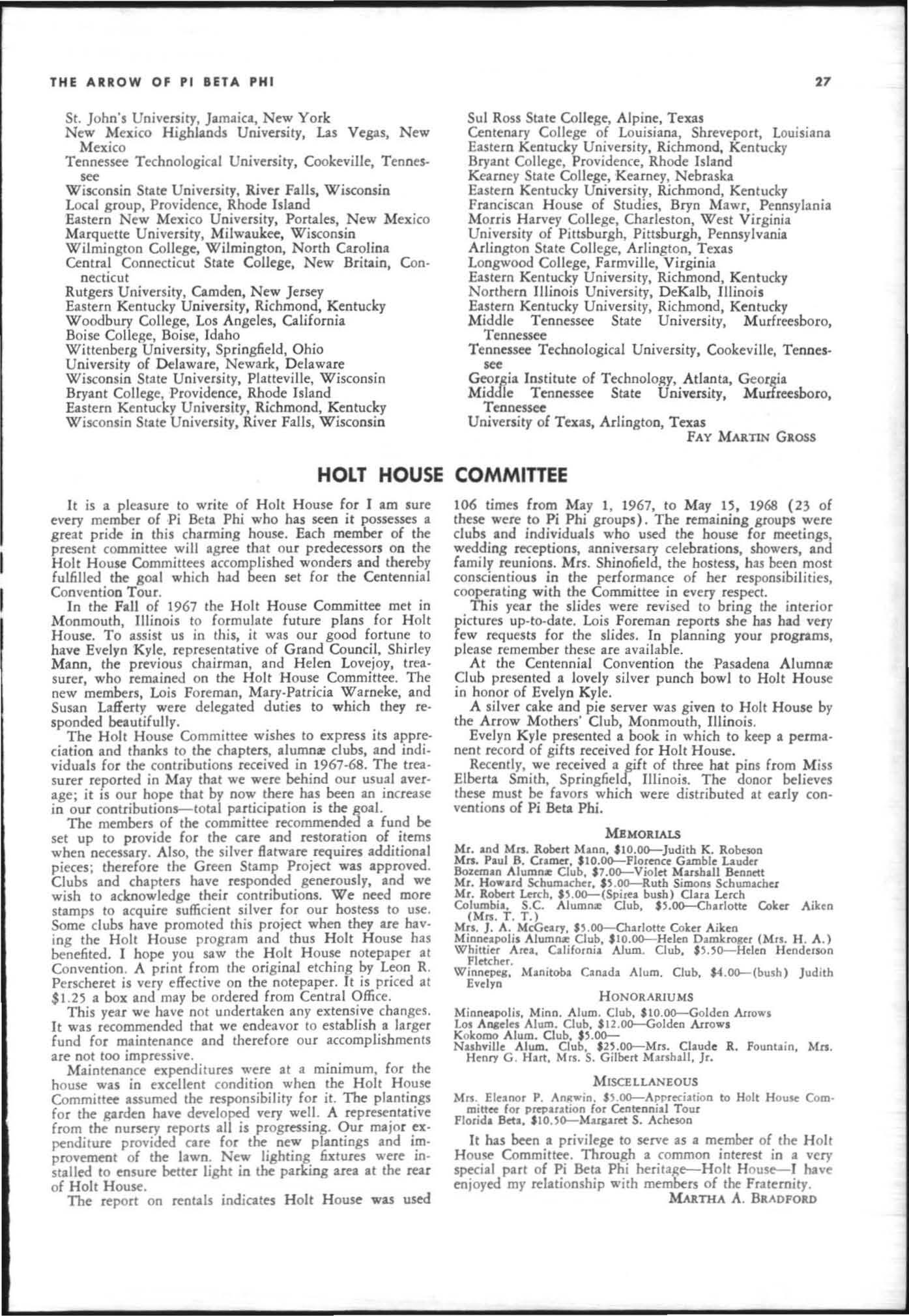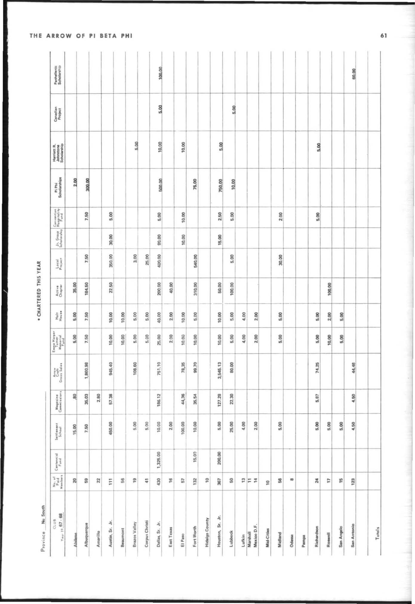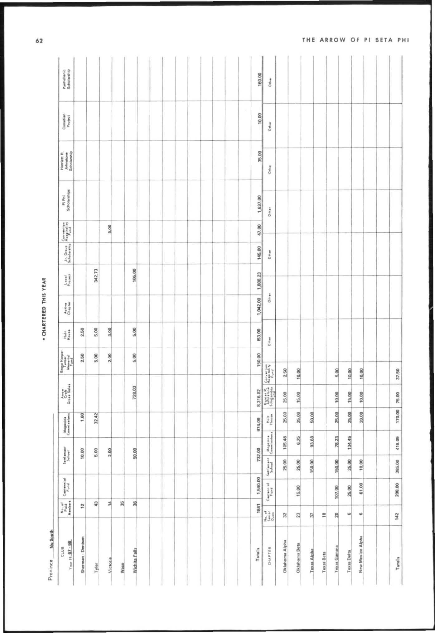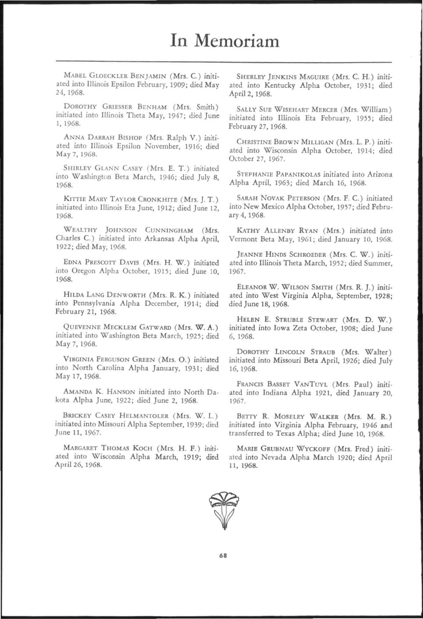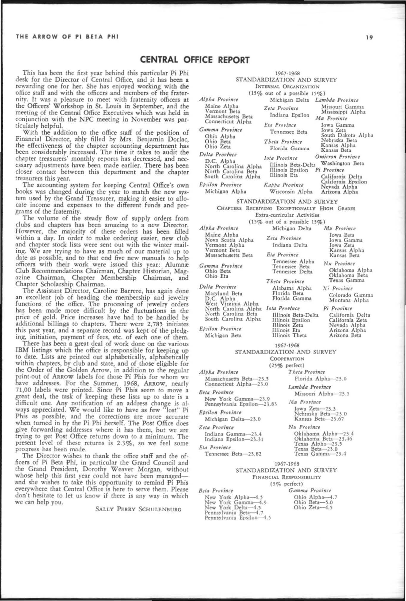 The annual of the Grand Council was h e ld in EI Pa so, T exas begin n ing M ay 19. 1968. The cou ncil meet· i ngs were re cessed M ay 21st through the 23rd fo r the 0.rectors' meetings. The Grand P res id wt, D o rothy Weaver M org :m. presided over all meetings. 'l1le meeting was with the ril ual. All members were p resent exccpt the G rand Vi ce President, Sarah/ane Paulson and the Grand Alumn:e Vice President, H elen Boucher Dix, who a rr ived on June 21st and were in attendance fo r the remainder of the meetings. Their proxy v Oles were filed with the Grand President. The incoming Grand Vi ce Presi dent of Philanthropies, Orpha O'Rourke and the D irector of Central Office, Sally Perry Schulenburg, were present for all the meetings. on annual repo r ts and r l!'{om mendati ons the Grand Counci l is privileged to announce the schob rships and awards: