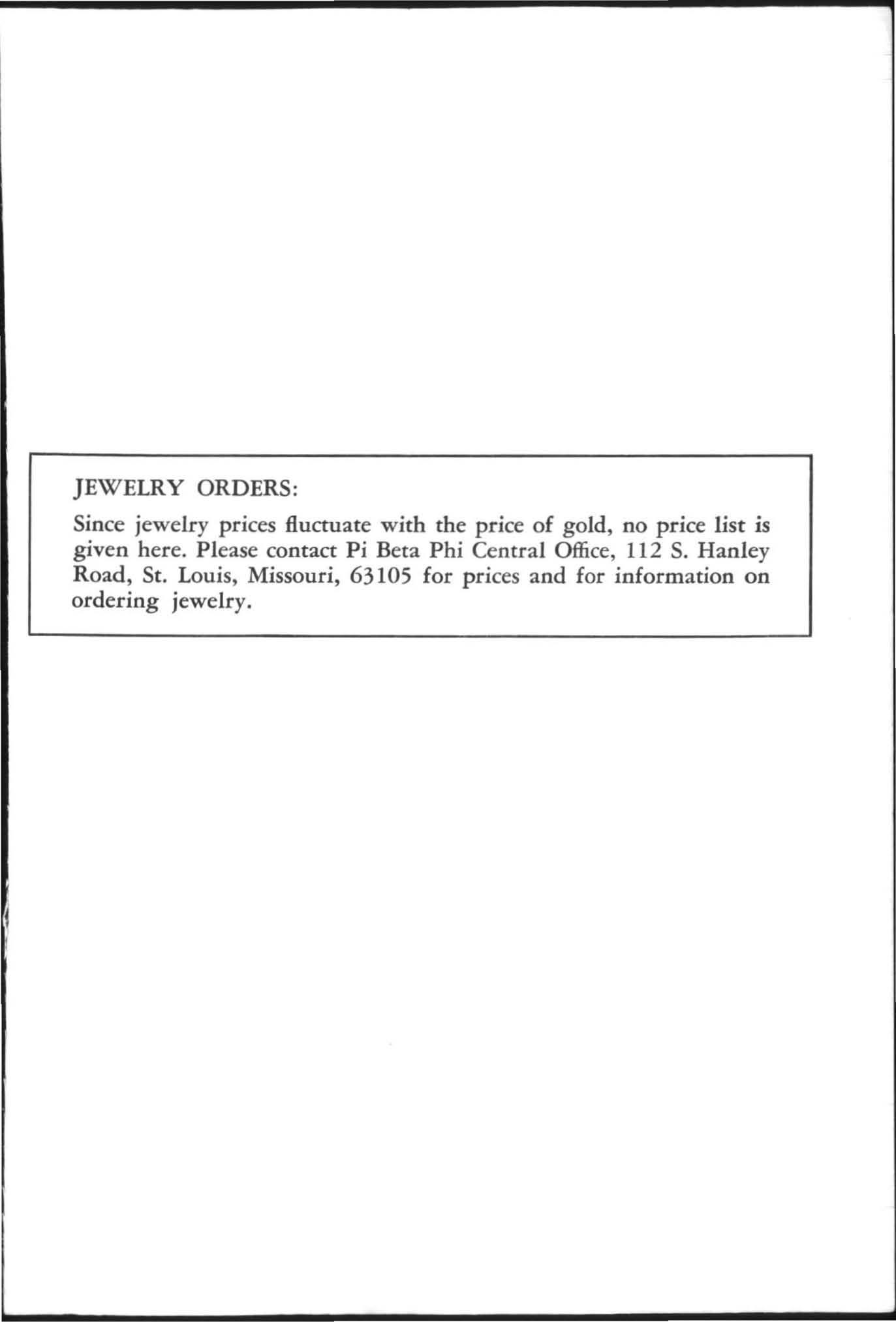 Since jewelry prices fluctuate with the price of gold, no price list is given here. Please contact Pi Beta Phi Central Office, 112 S. Hanley Road, St. Louis, Missouri, 63105 for prices and for information on ordering jewelry.