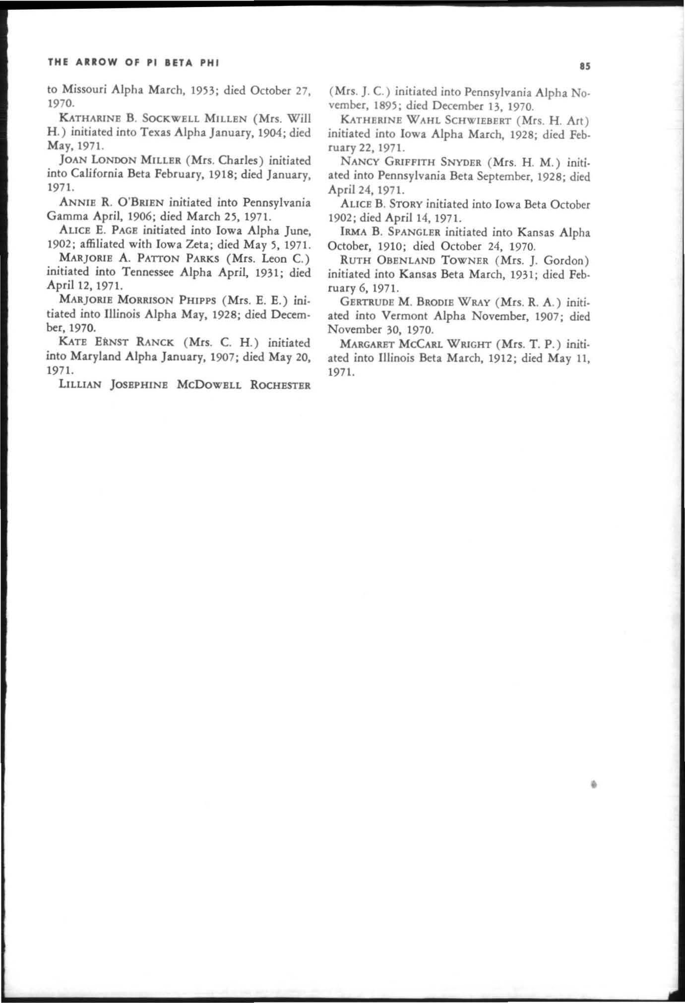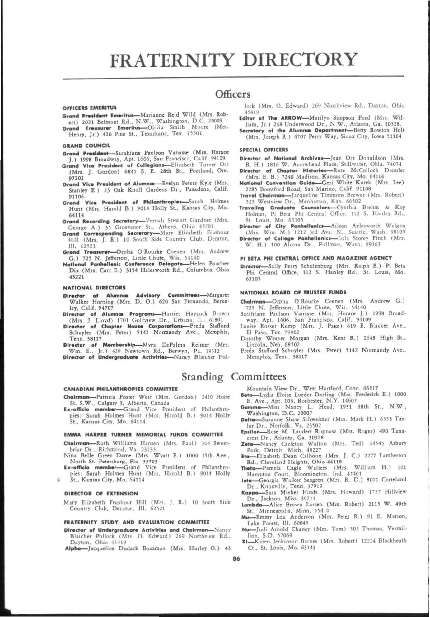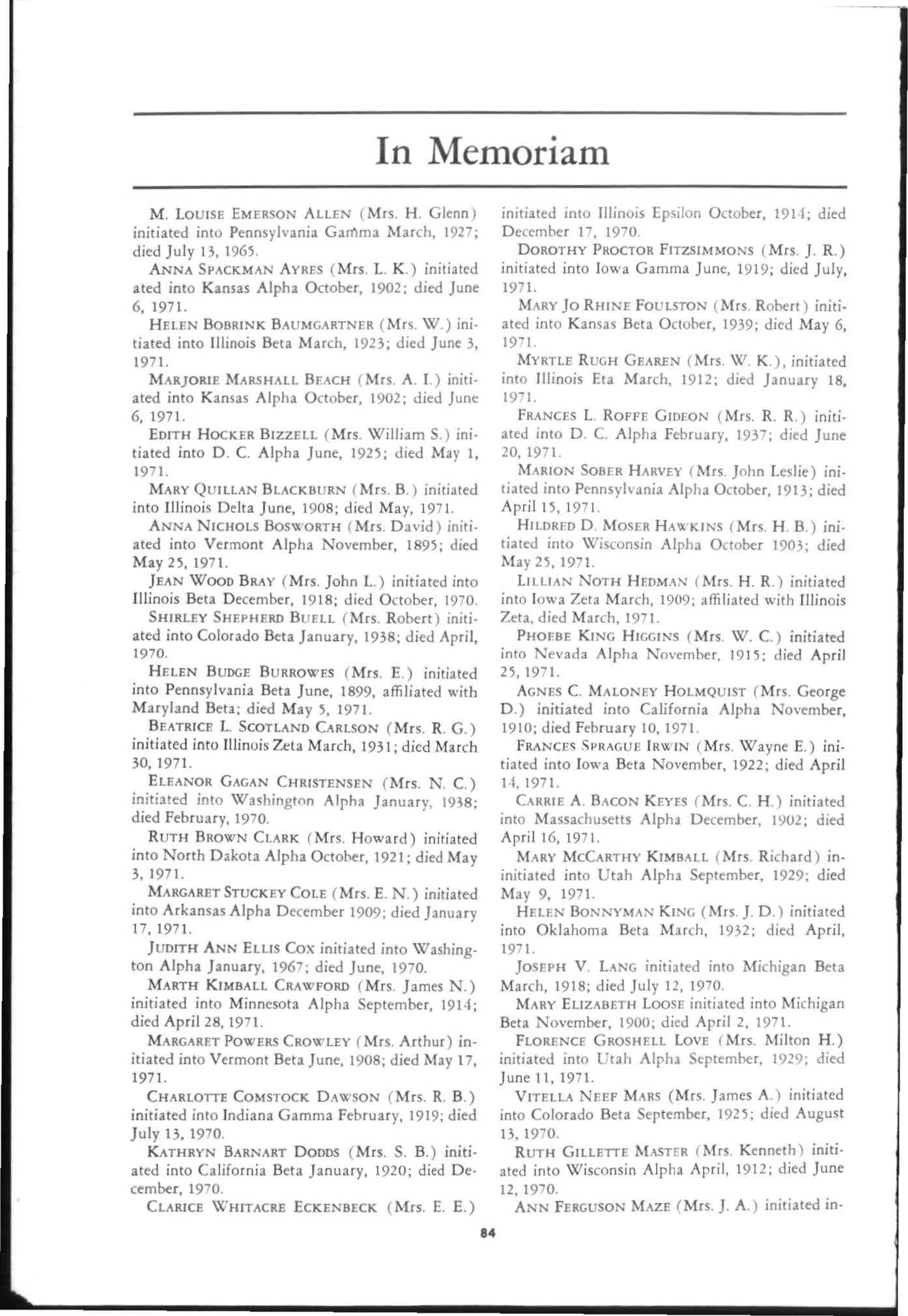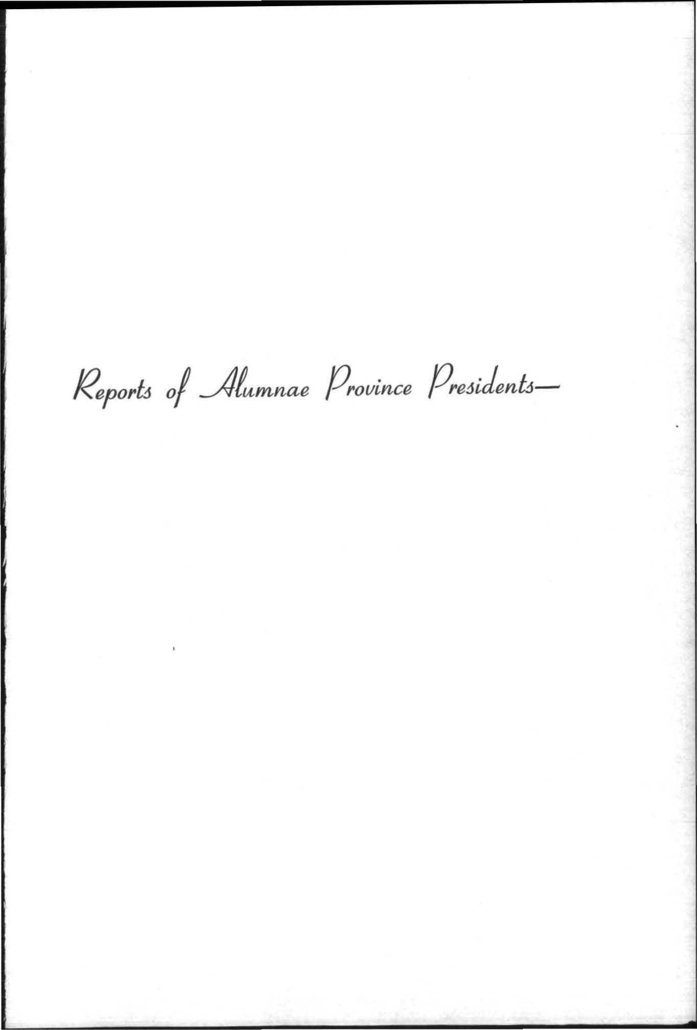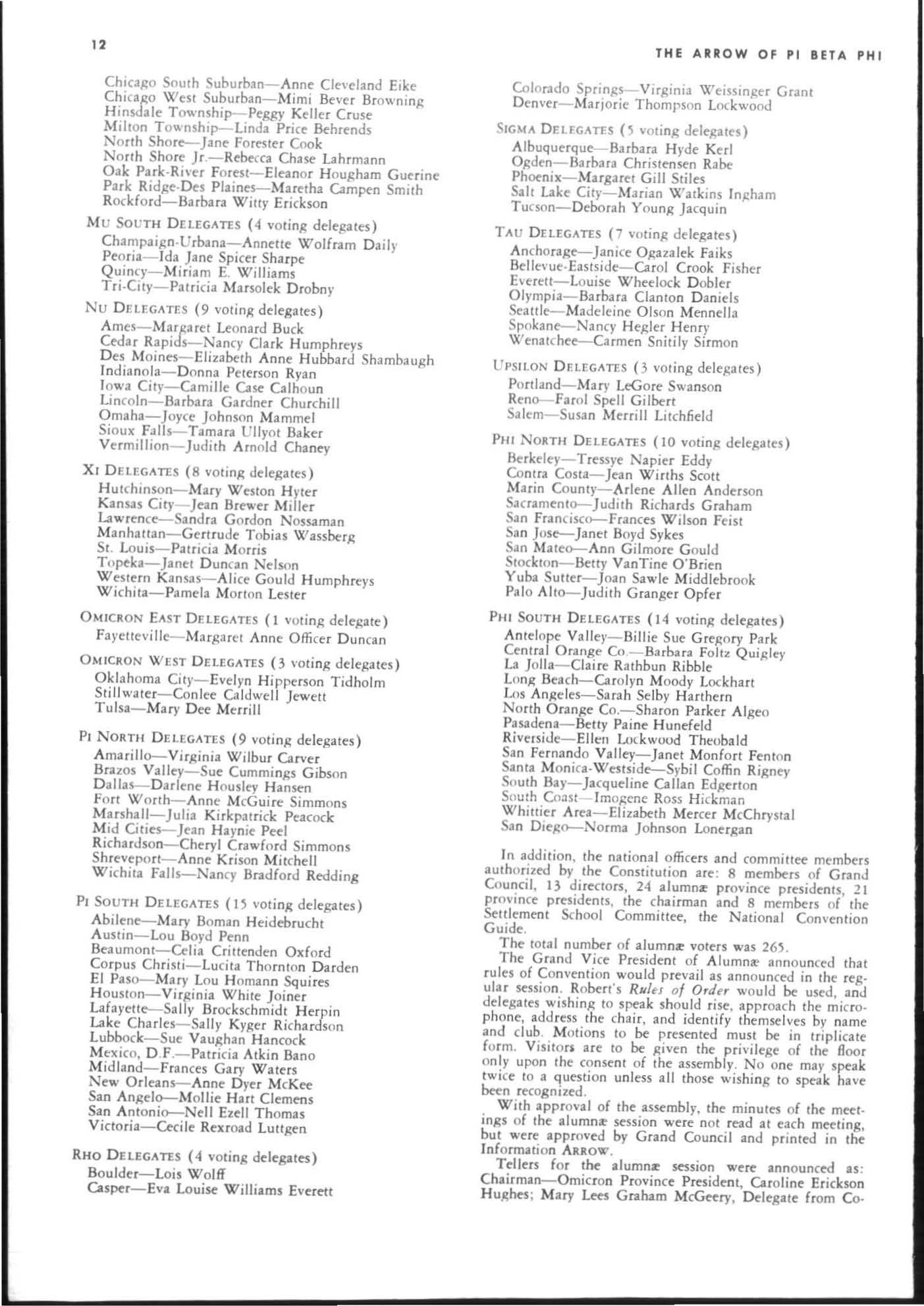 The Grand Presi dent made the following introductions : Grand Pres ident Emeritus, M arianne Reid Wild ; Grand Treasurer Emeritus, Olivia Smith M oore; Put Gntnd Presidents , A li ce Weber Johns o n and Doro thy Weaver Past Grand Co u ncil members Edythe Mul veyhill Brack and He len An derson LewIS, se r ving as Elections Coordinator ; the Assistant to the Secretary of the Alumnz Department , Gladys Ph illips Bon ; and the Di rec· tor of Operation Greek, Caryl Lenahan.