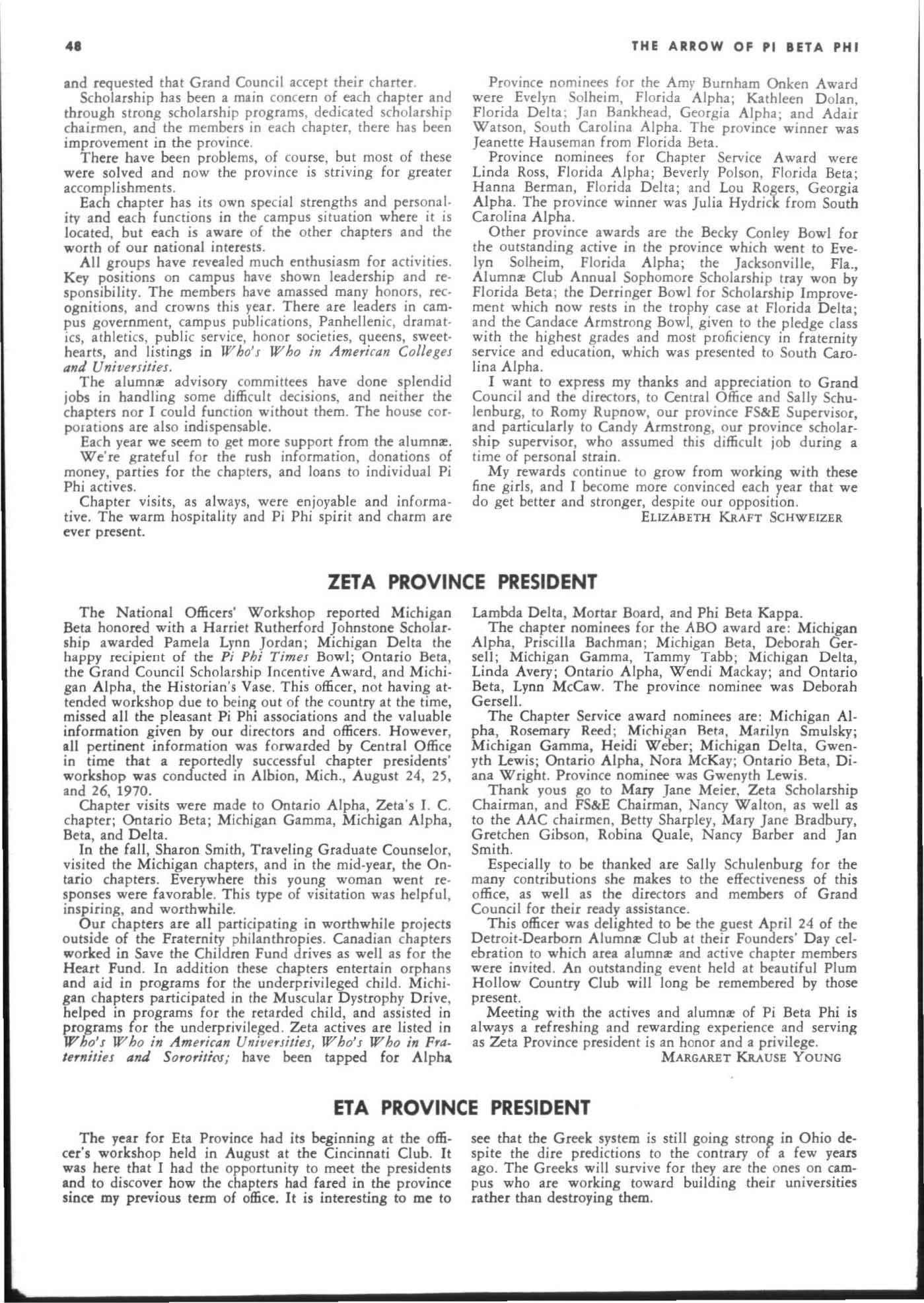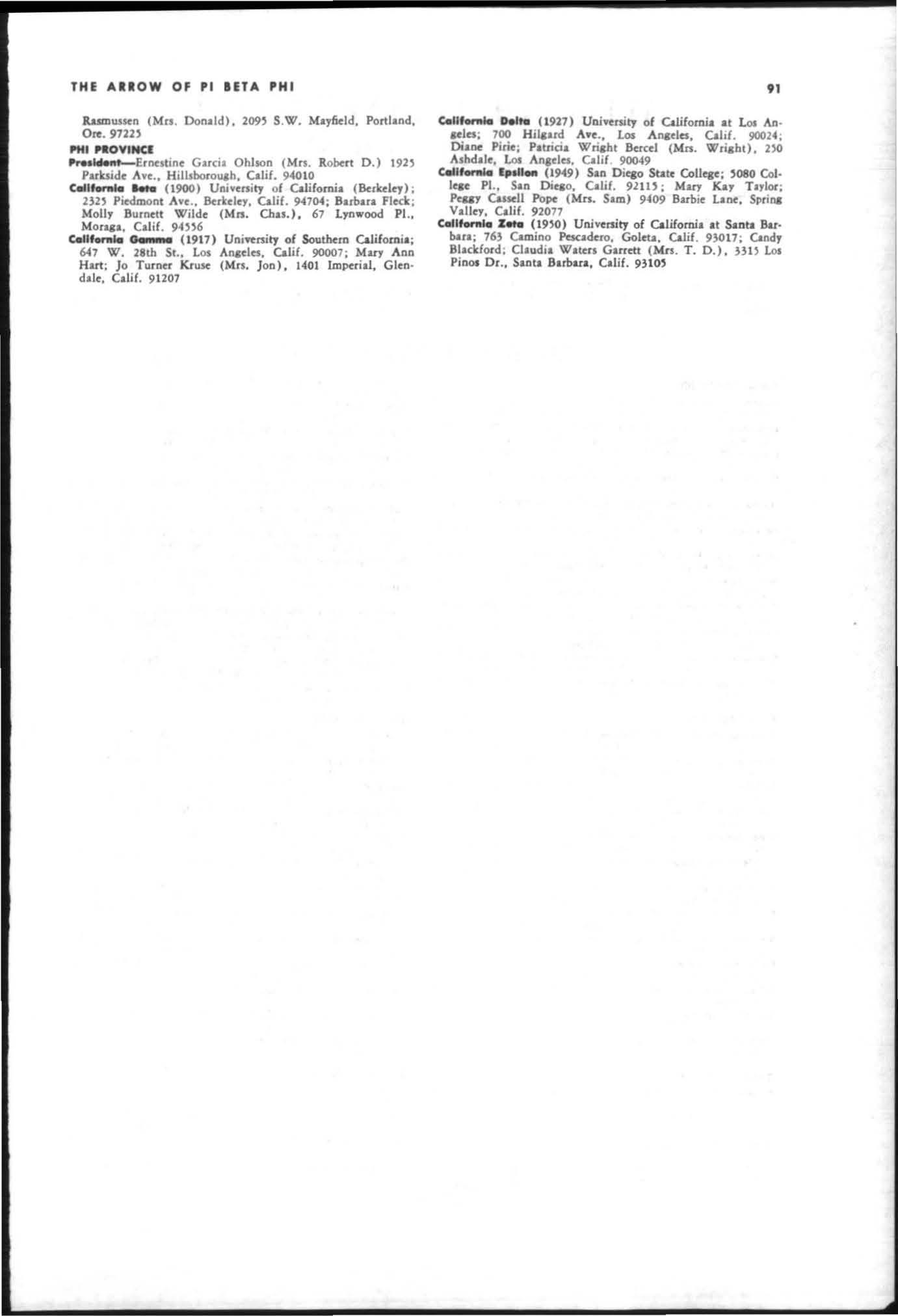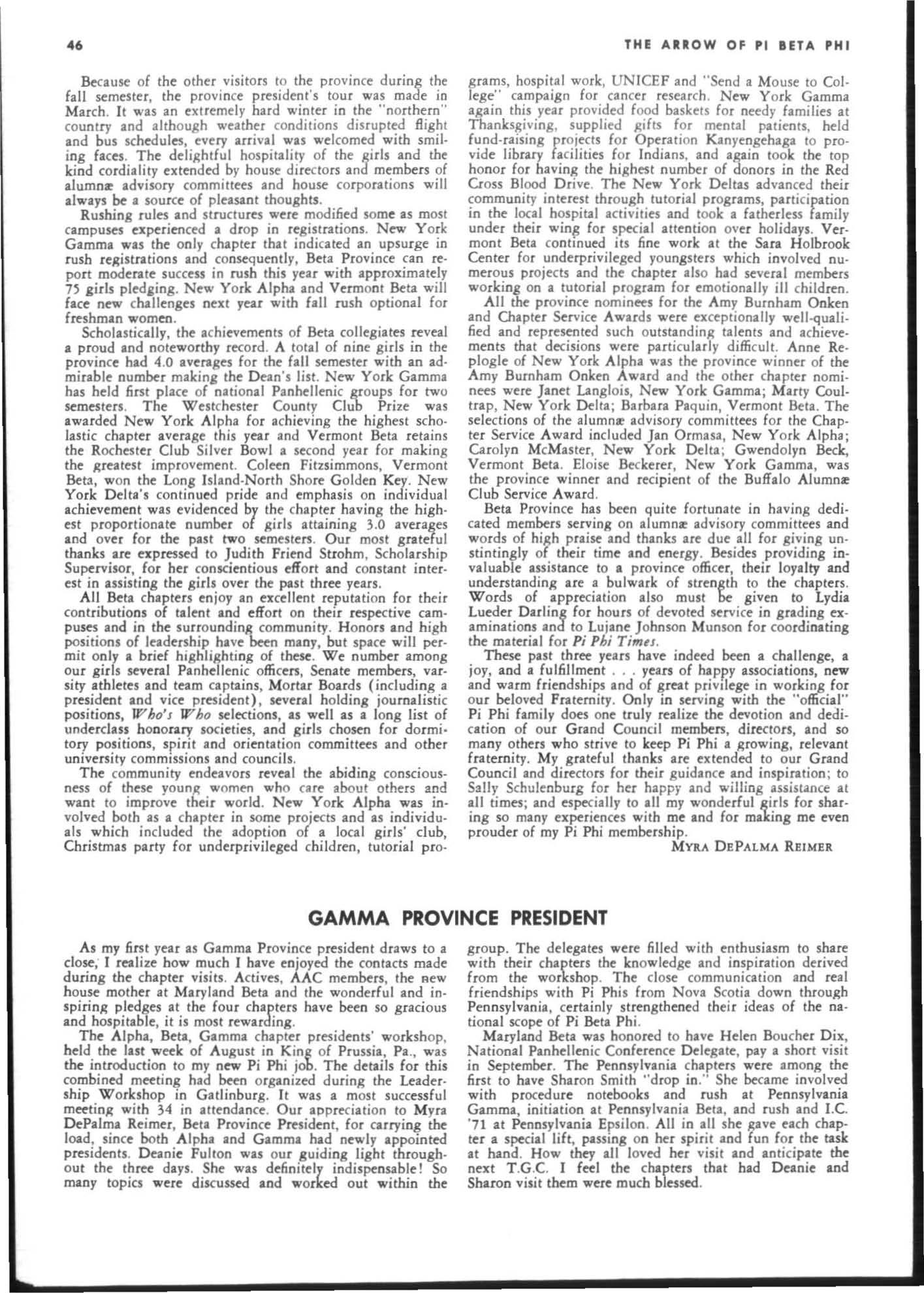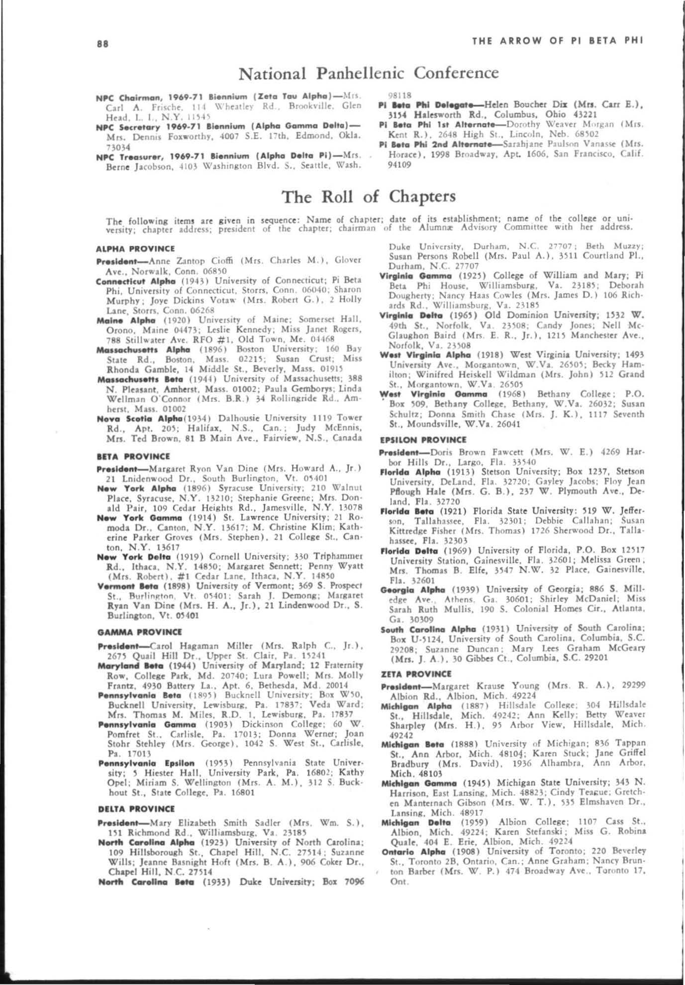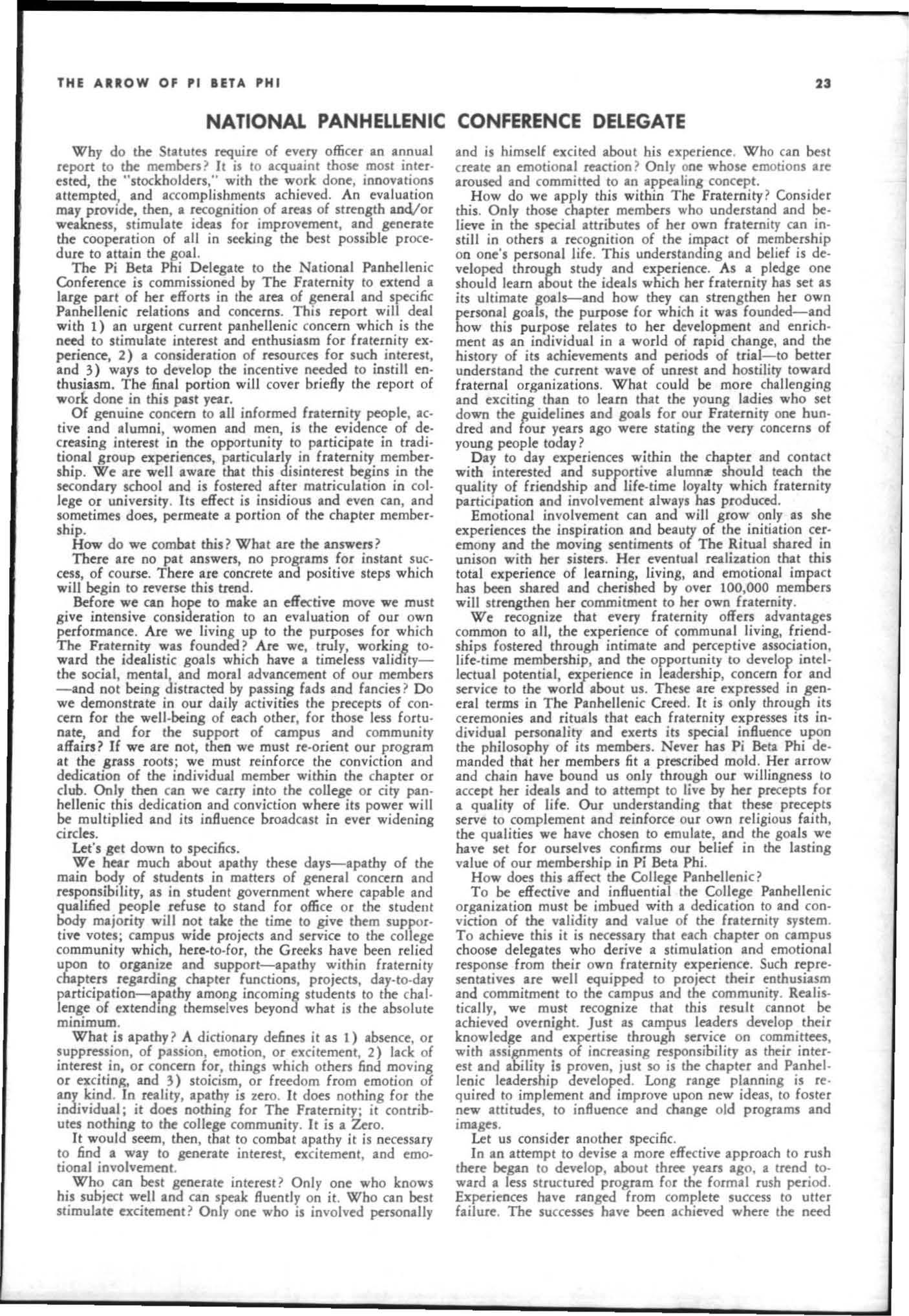 The Grand Presi dent made the following introductions : Grand Pres ident Emeritus, M arianne Reid Wild ; Grand Treasurer Emeritus, Olivia Smith M oore; Put Gntnd Presidents , A li ce Weber Johns o n and Doro thy Weaver Past Grand Co u ncil members Edythe Mul veyhill Brack and He len An derson LewIS, se r ving as Elections Coordinator ; the Assistant to the Secretary of the Alumnz Department , Gladys Ph illips Bon ; and the Di rec· tor of Operation Greek, Caryl Lenahan.
