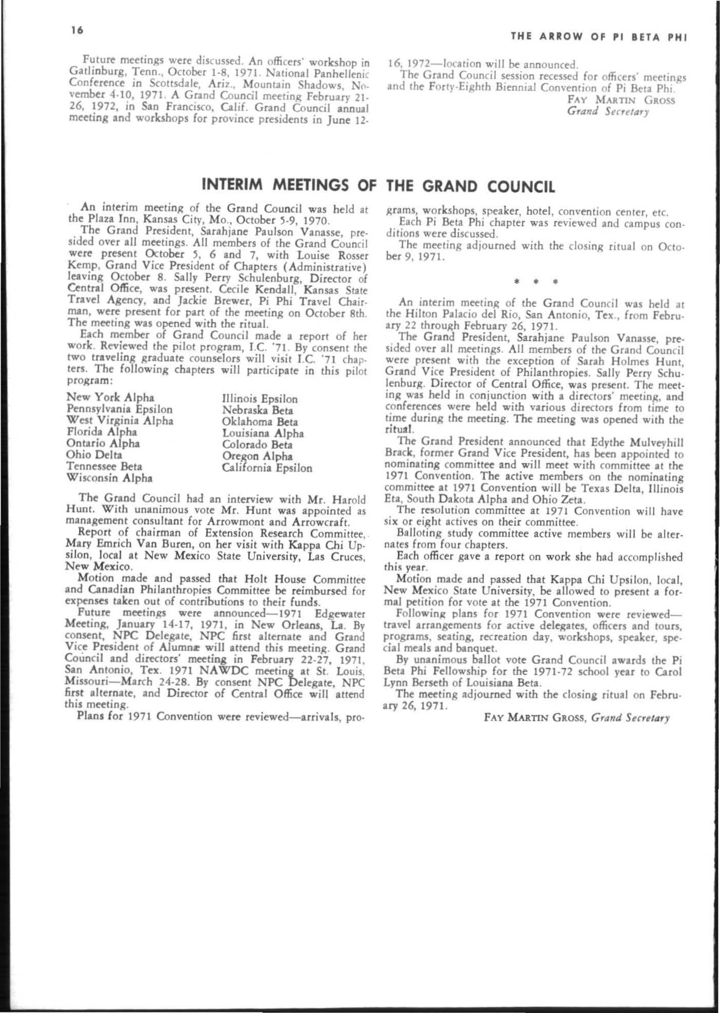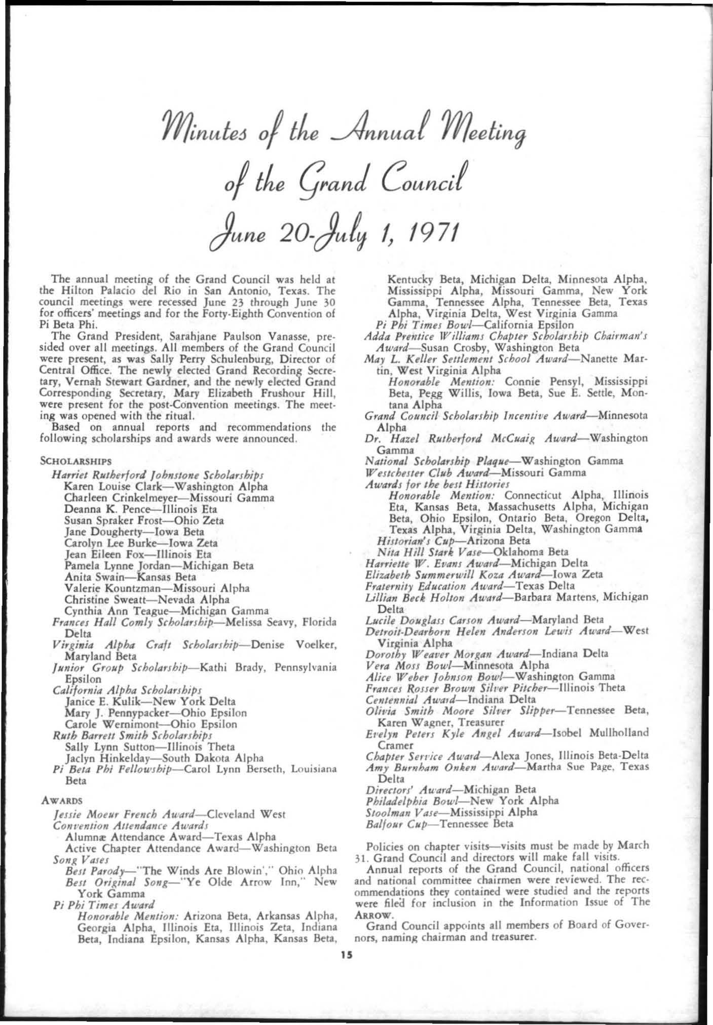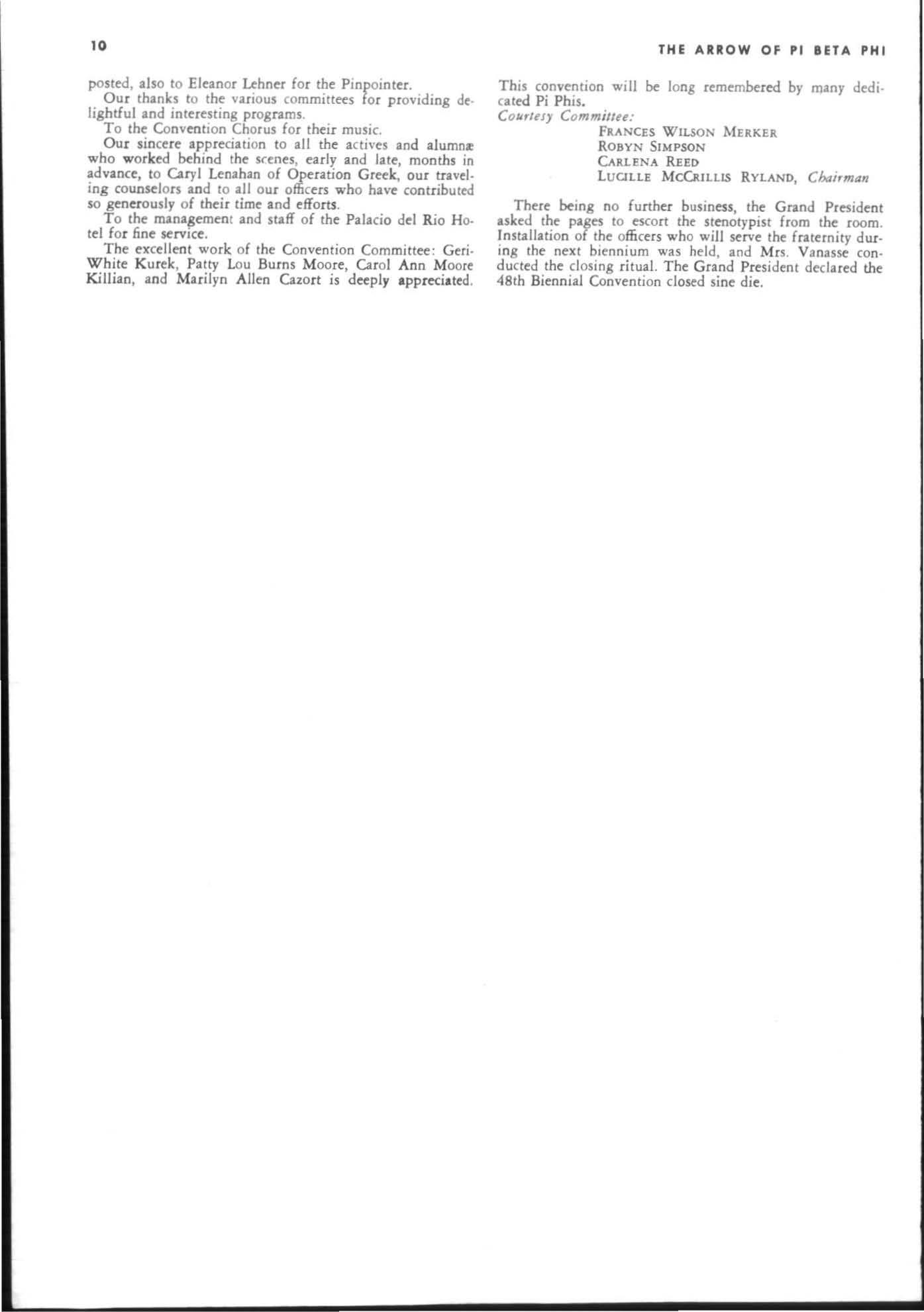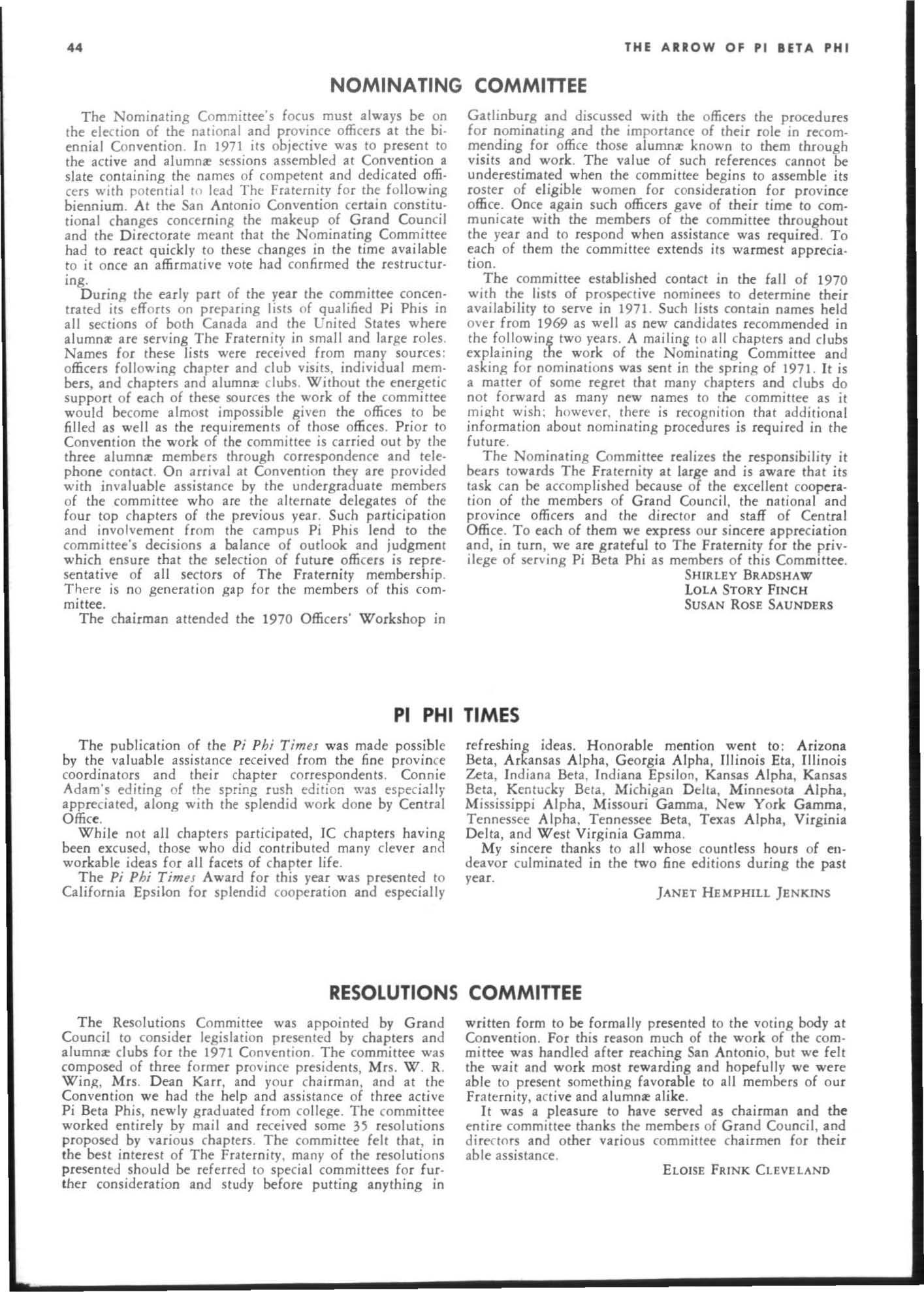 The G rand President made following introductions : Th e Convention Committee : National Convent io n Guide, Geri White Kur ek; Convention Committee Chairman, Pa uy Lou Burns M oore; H ospita li ty Chairman, Carol Ann M oore Killian ; Regis trati o n Chairman , Mar i lyn Allen Cazort-the members of Grand Council, the Directors , the Special Offi · cen-National Publi c Reiui on s Chairman, Eleanor Bush· nell Lehner; the Traveling Graduate Counselors f o r the 19 70 71 year, Dean ie Fulto n and Sharon Smith; Travel· Graduate Cou nsel ors f o r the 19 71·72 yea r , Cyndy Brehm and Ka y H olmes; Graduate Cou nsel o r for the 1970· 71 year, Janet Daacke; Dir«tor nr vnlral Offi ce , Sally Perry Schulenburg; Cenual Offi ce Financial Directo r , D o ro thy Mayne Campbell- The Board o f G ove rn ors o f Arr ow · mont, Chairman , Hesperia Ayleswort h Henderson ; Secrt· lary , Carolyn Kovener: Treasurer Olivia Smith !kIt)' Bailey H all ; D irector of Arrowmont School of Arts and Crafts, Mar ian G H eard; S Lucile Jennin!s ; Elizabeth Yelm Kingman ; Sarah Ruth Mull is; Dean of the College of H ome Economics, U niversit y oC Tennessee, Dr Lura Odland; Jean D unba r Socolowslci; Executive Coord i· nat o r, Lu cile M cCutc han Woodworth-the Ball oting Study Committee ; Chairman , D o ro thy Jones Birdwell; Evelyn Long Fay ; Barbara H e3th Kill ins- Chairman o f the (a. nadian Phil an thr opies Committee, Patricia Foster WeirChairman of the Extensi o n Committee, M ary Emri ch Van Buren- Chairman of the H o lt H o use Com