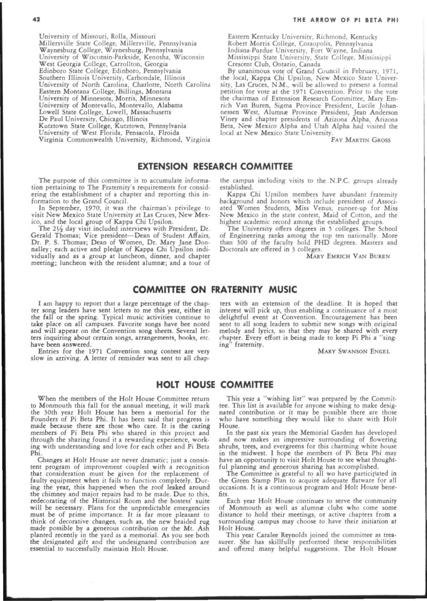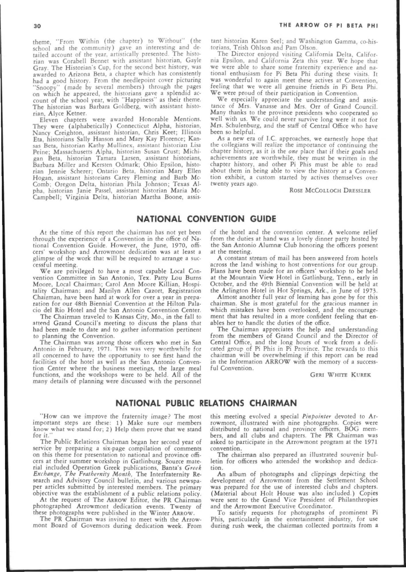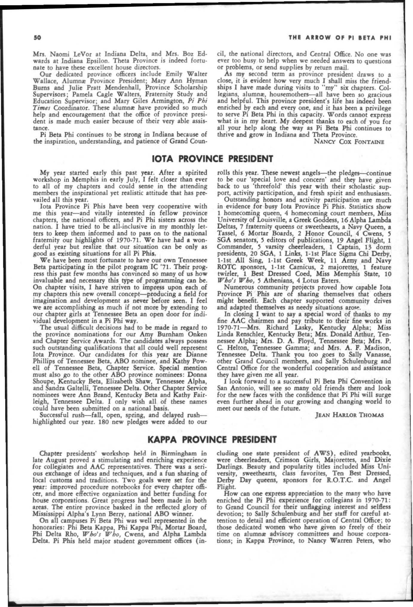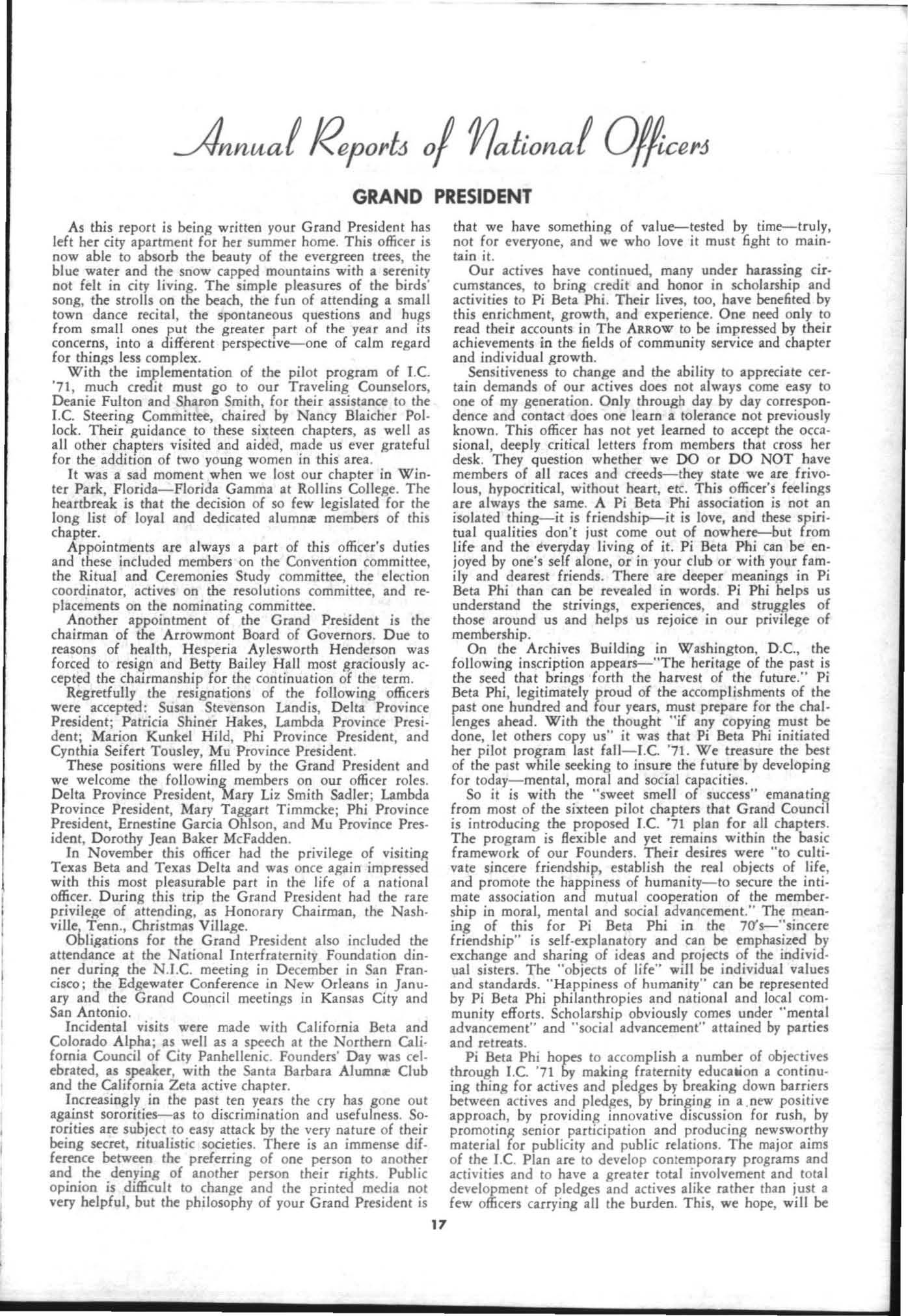The G rand President made following introductions : Th e Convention Committee : National Convent io n Guide, Geri White Kur ek; Convention Committee Chairman, Pa uy Lou Burns M oore; H ospita li ty Chairman, Carol Ann M oore Killian ; Regis trati o n Chairman , Mar i lyn Allen Cazort-the members of Grand Council, the Directors , the Special Offi · cen-National Publi c Reiui on s Chairman, Eleanor Bush· nell Lehner; the Traveling Graduate Counselors f o r the 19 70 71 year, Dean ie Fulto n and Sharon Smith; Travel· Graduate Cou nsel ors f o r the 19 71·72 yea r , Cyndy Brehm and Ka y H olmes; Graduate Cou nsel o r for the 1970· 71 year, Janet Daacke; Dir«tor nr vnlral Offi ce , Sally Perry Schulenburg; Cenual Offi ce Financial Directo r , D o ro thy Mayne Campbell- The Board o f G ove rn ors o f Arr ow · mont, Chairman , Hesperia Ayleswort h Henderson ; Secrt· lary , Carolyn Kovener: Treasurer Olivia Smith !kIt)' Bailey H all ; D irector of Arrowmont School of Arts and Crafts, Mar ian G H eard; S Lucile Jennin!s ; Elizabeth Yelm Kingman ; Sarah Ruth Mull is; Dean of the College of H ome Economics, U niversit y oC Tennessee, Dr Lura Odland; Jean D unba r Socolowslci; Executive Coord i· nat o r, Lu cile M cCutc han Woodworth-the Ball oting Study Committee ; Chairman , D o ro thy Jones Birdwell; Evelyn Long Fay ; Barbara H e3th Kill ins- Chairman o f the (a. nadian Phil an thr opies Committee, Patricia Foster WeirChairman of the Extensi o n Committee, M ary Emri ch Van Buren- Chairman of the H o lt H o use Com