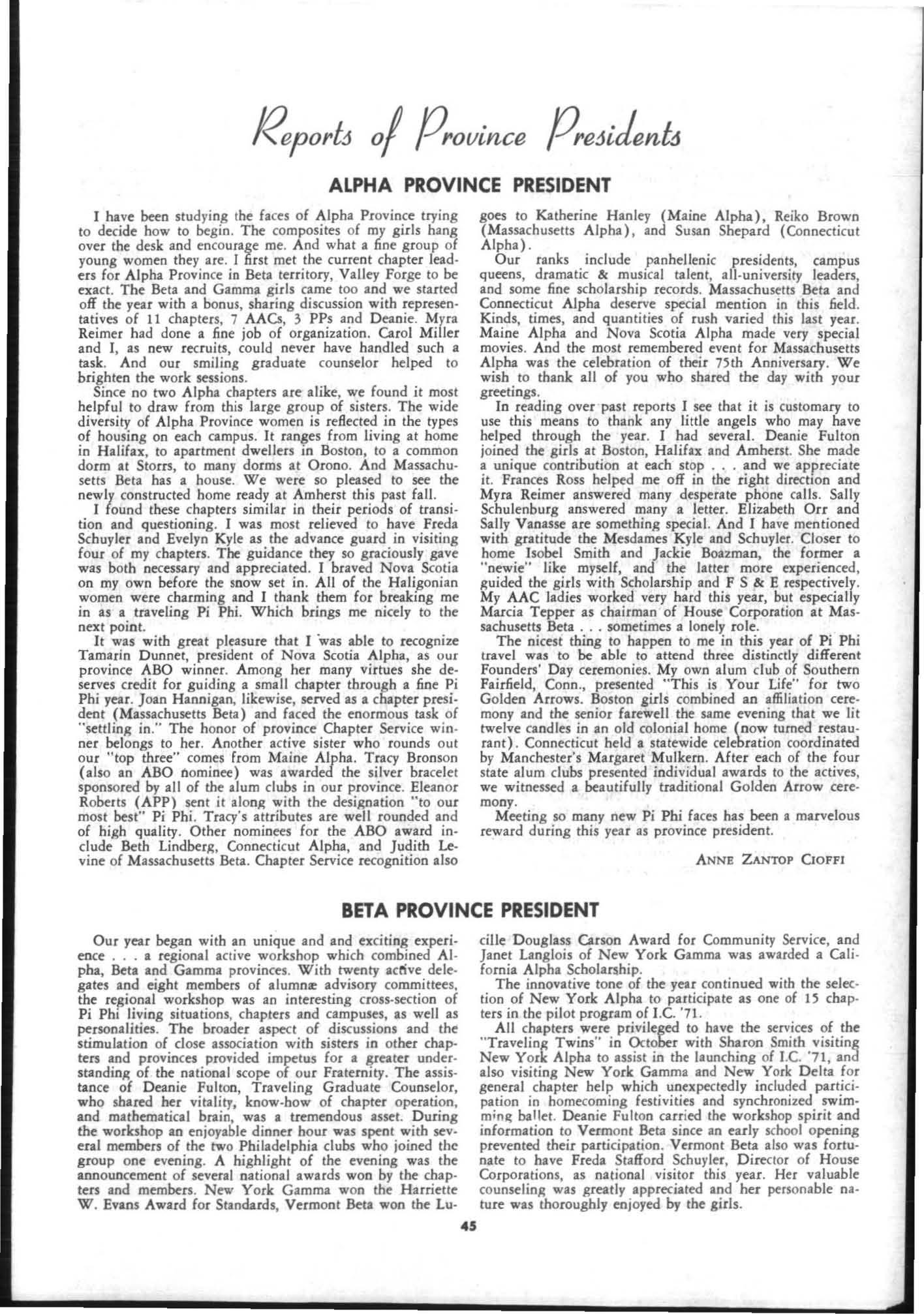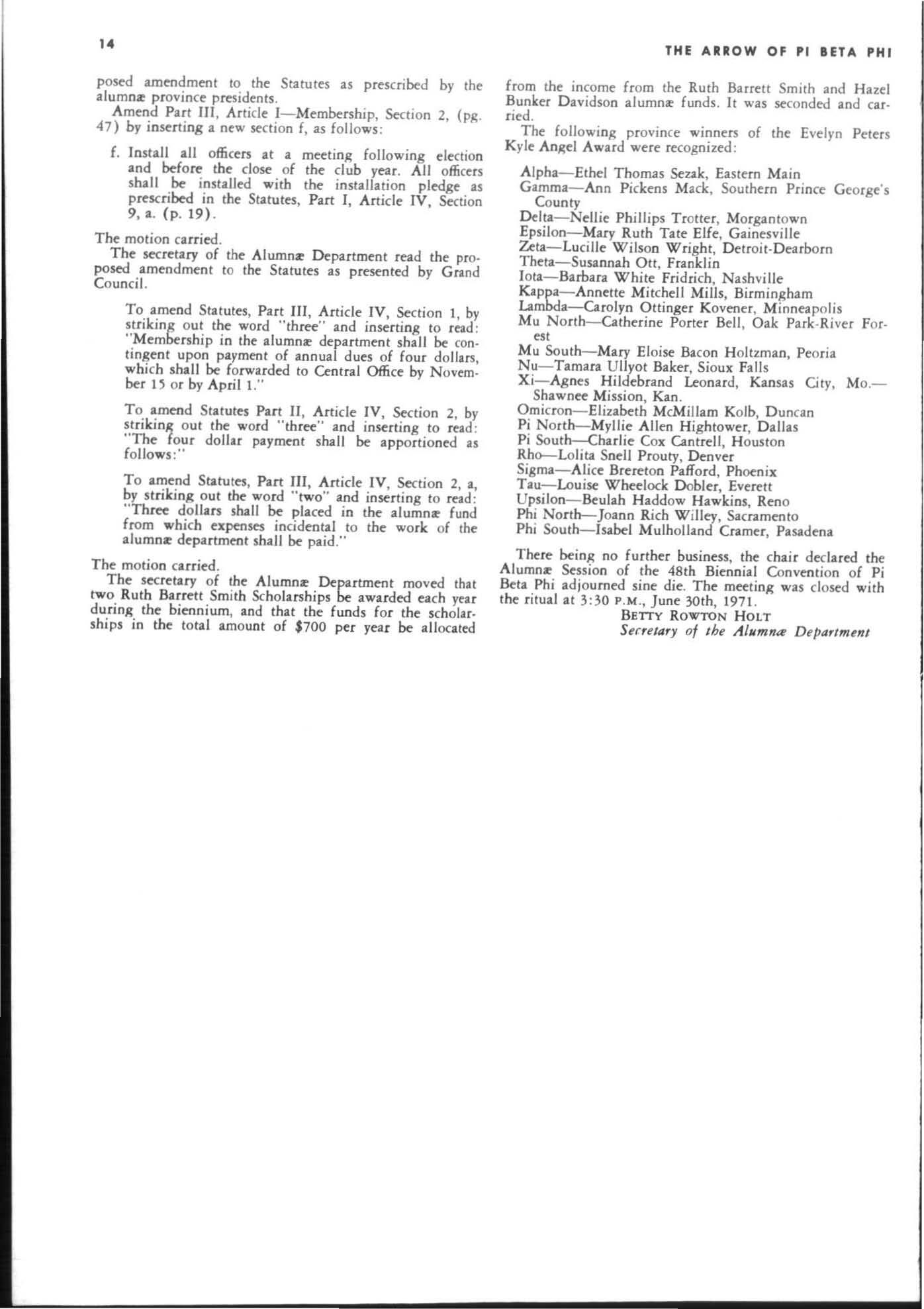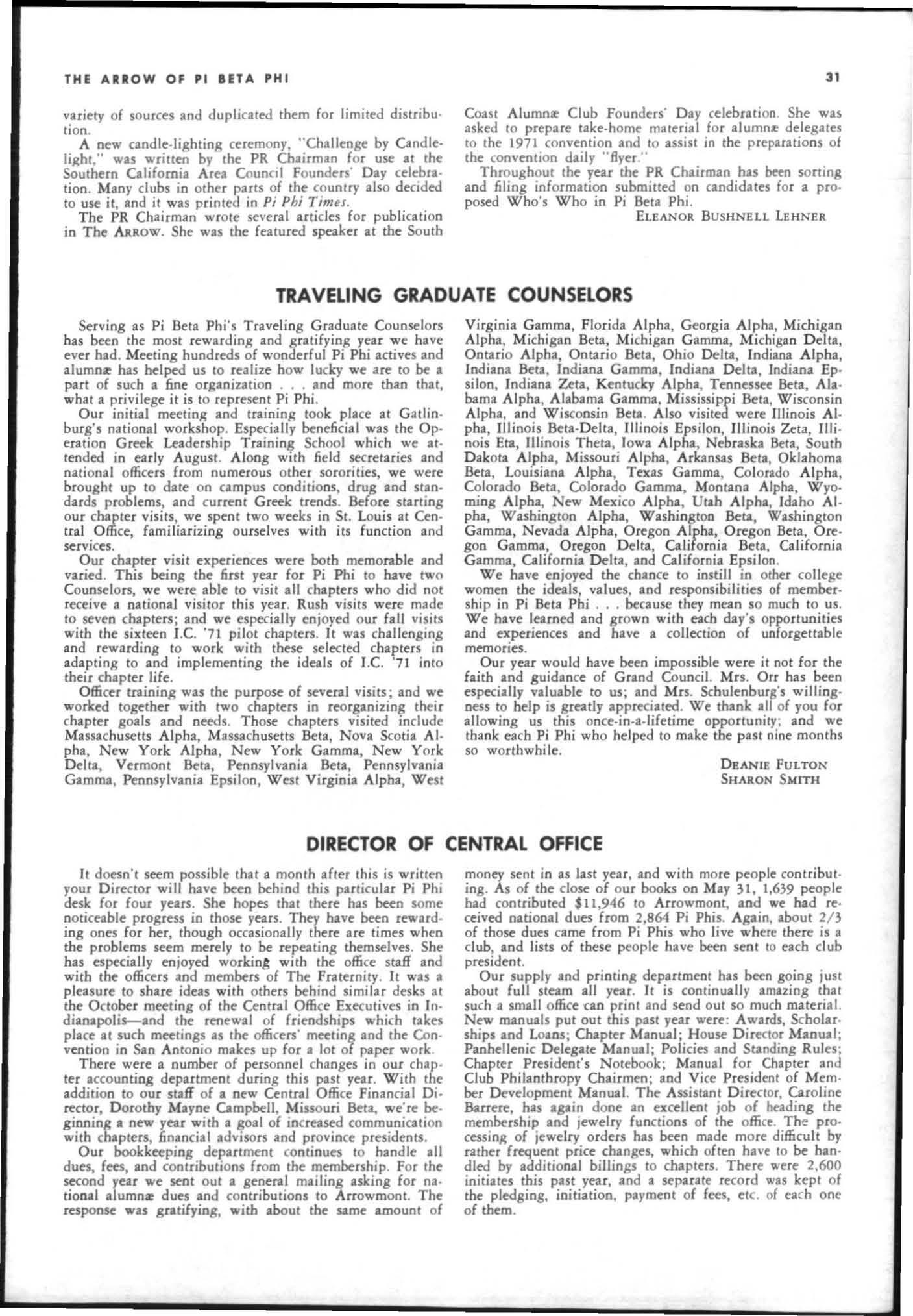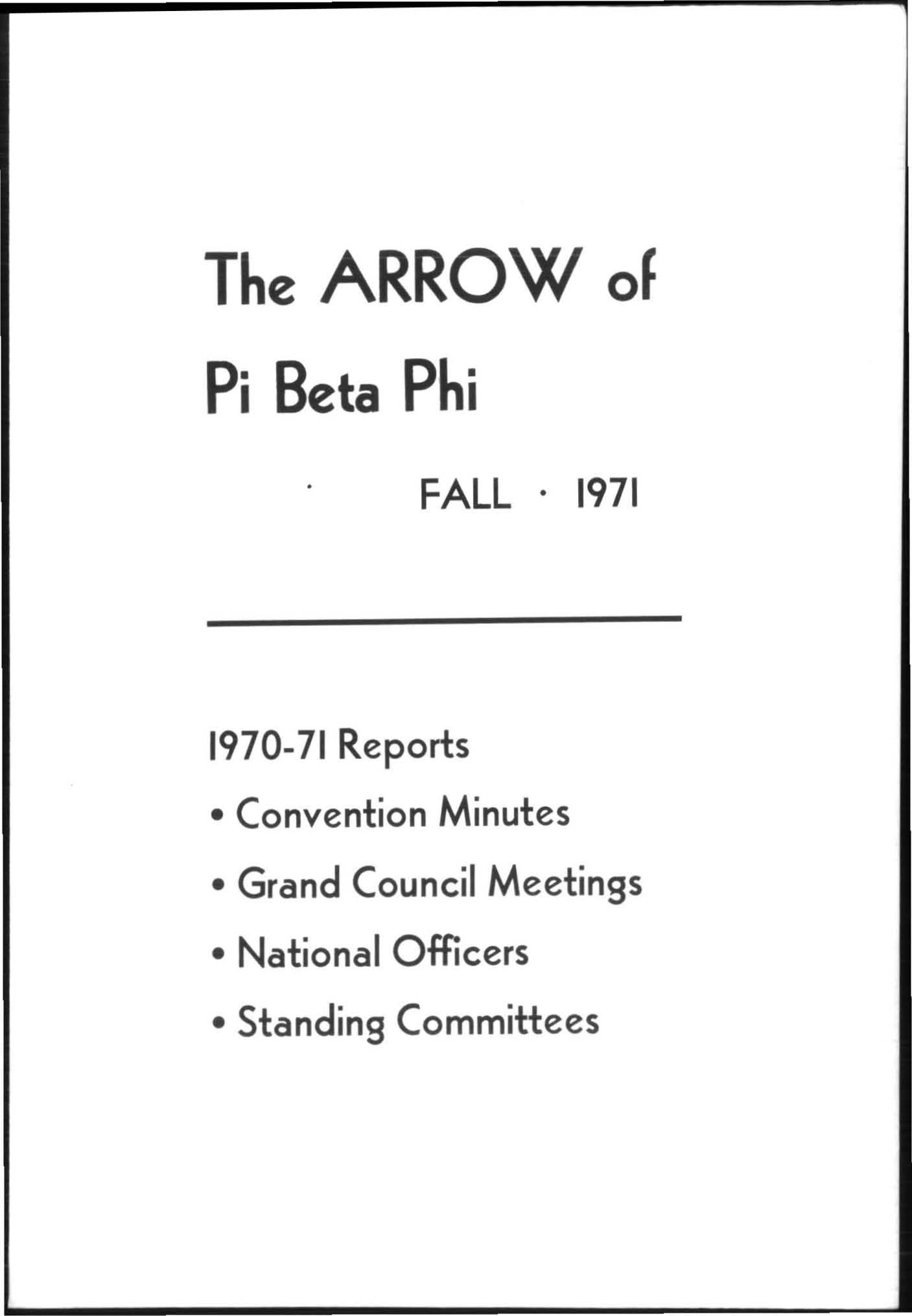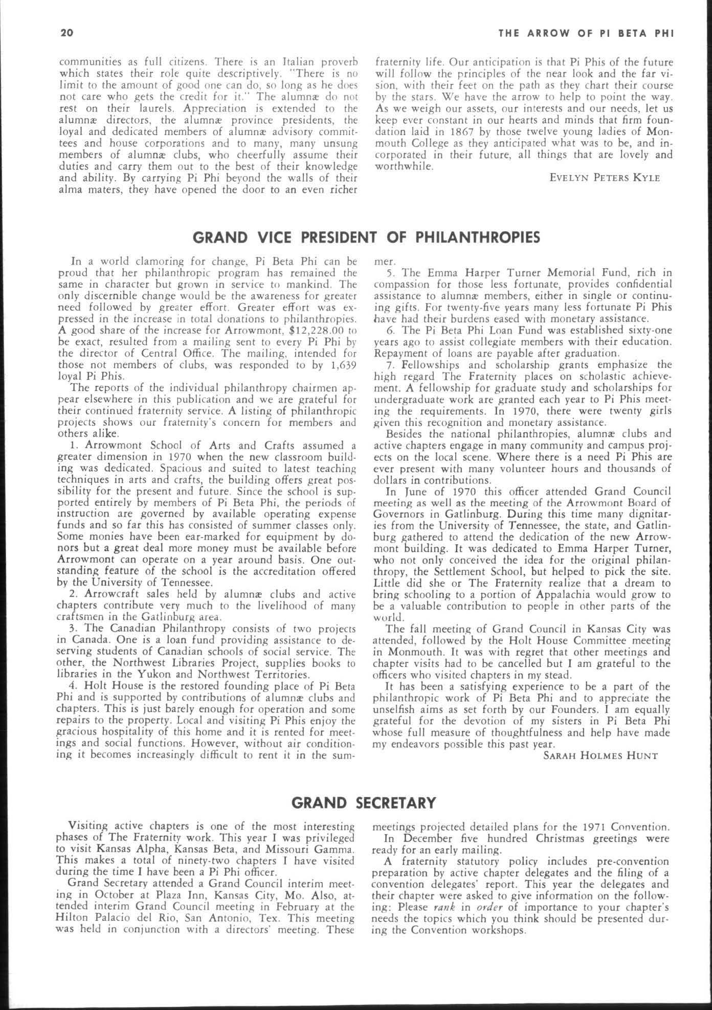 The G rand President made following introductions : Th e Convention Committee : National Convent io n Guide, Geri White Kur ek; Convention Committee Chairman, Pa uy Lou Burns M oore; H ospita li ty Chairman, Carol Ann M oore Killian ; Regis trati o n Chairman , Mar i lyn Allen Cazort-the members of Grand Council, the Directors , the Special Offi · cen-National Publi c Reiui on s Chairman, Eleanor Bush· nell Lehner; the Traveling Graduate Counselors f o r the 19 70 71 year, Dean ie Fulto n and Sharon Smith; Travel· Graduate Cou nsel ors f o r the 19 71·72 yea r , Cyndy Brehm and Ka y H olmes; Graduate Cou nsel o r for the 1970· 71 year, Janet Daacke; Dir«tor nr vnlral Offi ce , Sally Perry Schulenburg; Cenual Offi ce Financial Directo r , D o ro thy Mayne Campbell- The Board o f G ove rn ors o f Arr ow · mont, Chairman , Hesperia Ayleswort h Henderson ; Secrt· lary , Carolyn Kovener: Treasurer Olivia Smith !kIt)' Bailey H all ; D irector of Arrowmont School of Arts and Crafts, Mar ian G H eard; S Lucile Jennin!s ; Elizabeth Yelm Kingman ; Sarah Ruth Mull is; Dean of the College of H ome Economics, U niversit y oC Tennessee, Dr Lura Odland; Jean D unba r Socolowslci; Executive Coord i· nat o r, Lu cile M cCutc han Woodworth-the Ball oting Study Committee ; Chairman , D o ro thy Jones Birdwell; Evelyn Long Fay ; Barbara H e3th Kill ins- Chairman o f the (a. nadian Phil an thr opies Committee, Patricia Foster WeirChairman of the Extensi o n Committee, M ary Emri ch Van Buren- Chairman of the H o lt H o use Com