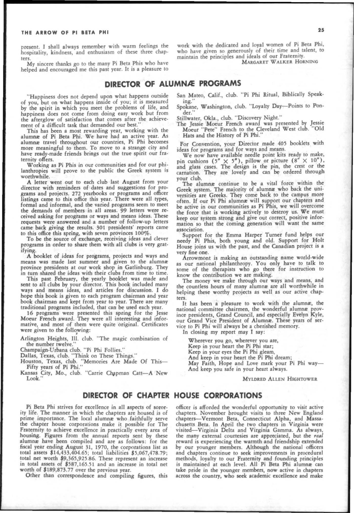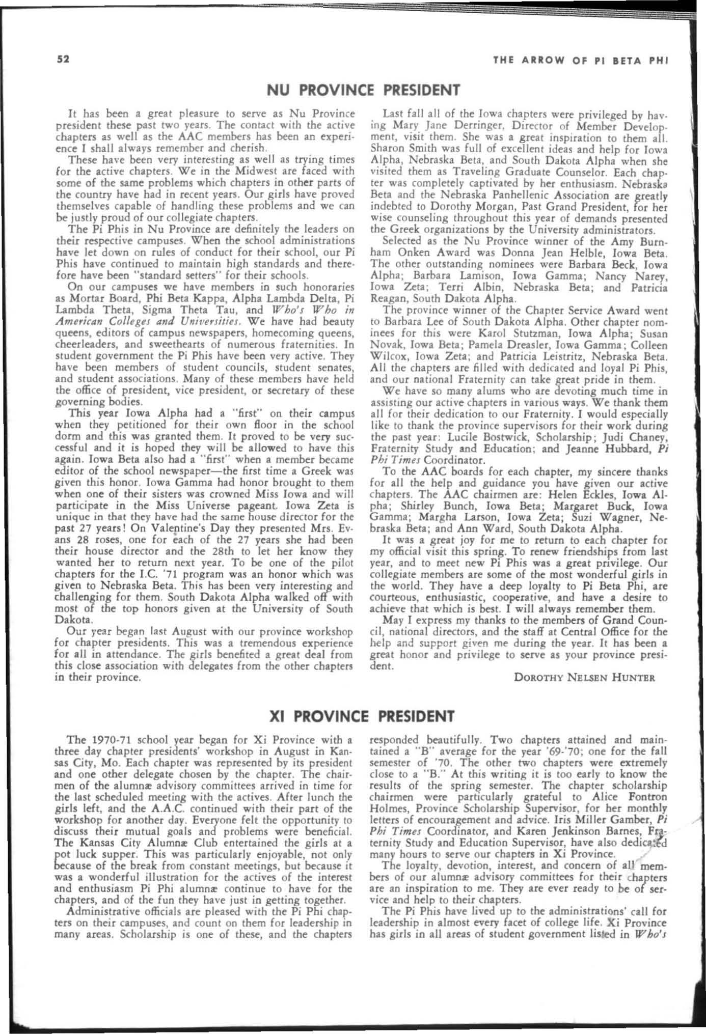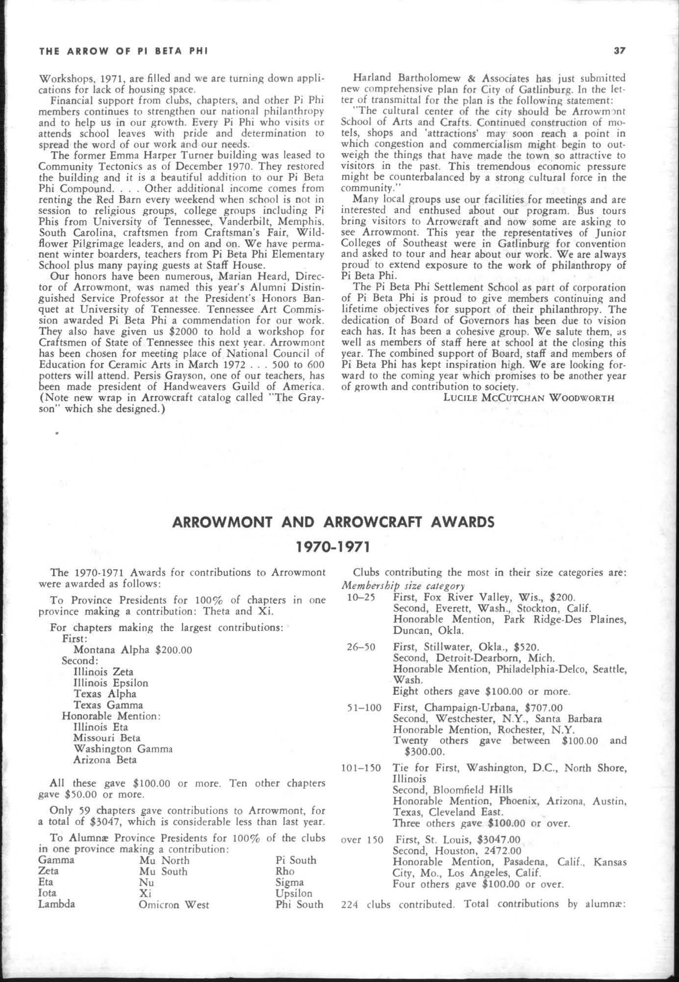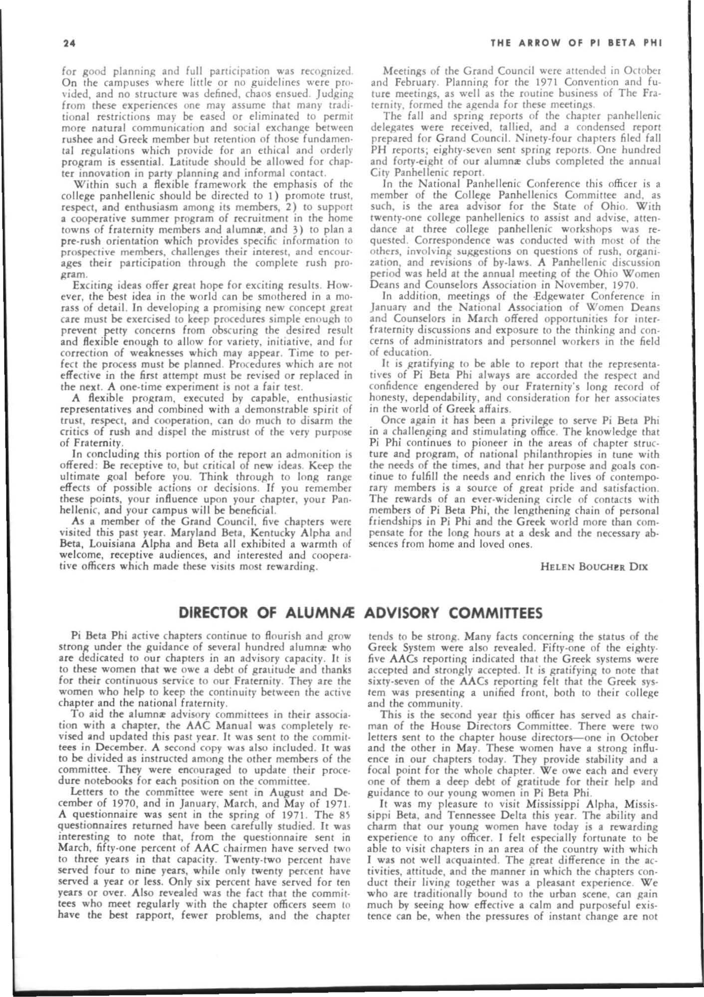 The G rand President made following introductions : Th e Convention Committee : National Convent io n Guide, Geri White Kur ek; Convention Committee Chairman, Pa uy Lou Burns M oore; H ospita li ty Chairman, Carol Ann M oore Killian ; Regis trati o n Chairman , Mar i lyn Allen Cazort-the members of Grand Council, the Directors , the Special Offi · cen-National Publi c Reiui on s Chairman, Eleanor Bush· nell Lehner; the Traveling Graduate Counselors f o r the 19 70 71 year, Dean ie Fulto n and Sharon Smith; Travel· Graduate Cou nsel ors f o r the 19 71·72 yea r , Cyndy Brehm and Ka y H olmes; Graduate Cou nsel o r for the 1970· 71 year, Janet Daacke; Dir«tor nr vnlral Offi ce , Sally Perry Schulenburg; Cenual Offi ce Financial Directo r , D o ro thy Mayne Campbell- The Board o f G ove rn ors o f Arr ow · mont, Chairman , Hesperia Ayleswort h Henderson ; Secrt· lary , Carolyn Kovener: Treasurer Olivia Smith !kIt)' Bailey H all ; D irector of Arrowmont School of Arts and Crafts, Mar ian G H eard; S Lucile Jennin!s ; Elizabeth Yelm Kingman ; Sarah Ruth Mull is; Dean of the College of H ome Economics, U niversit y oC Tennessee, Dr Lura Odland; Jean D unba r Socolowslci; Executive Coord i· nat o r, Lu cile M cCutc han Woodworth-the Ball oting Study Committee ; Chairman , D o ro thy Jones Birdwell; Evelyn Long Fay ; Barbara H e3th Kill ins- Chairman o f the (a. nadian Phil an thr opies Committee, Patricia Foster WeirChairman of the Extensi o n Committee, M ary Emri ch Van Buren- Chairman of the H o lt H o use Com