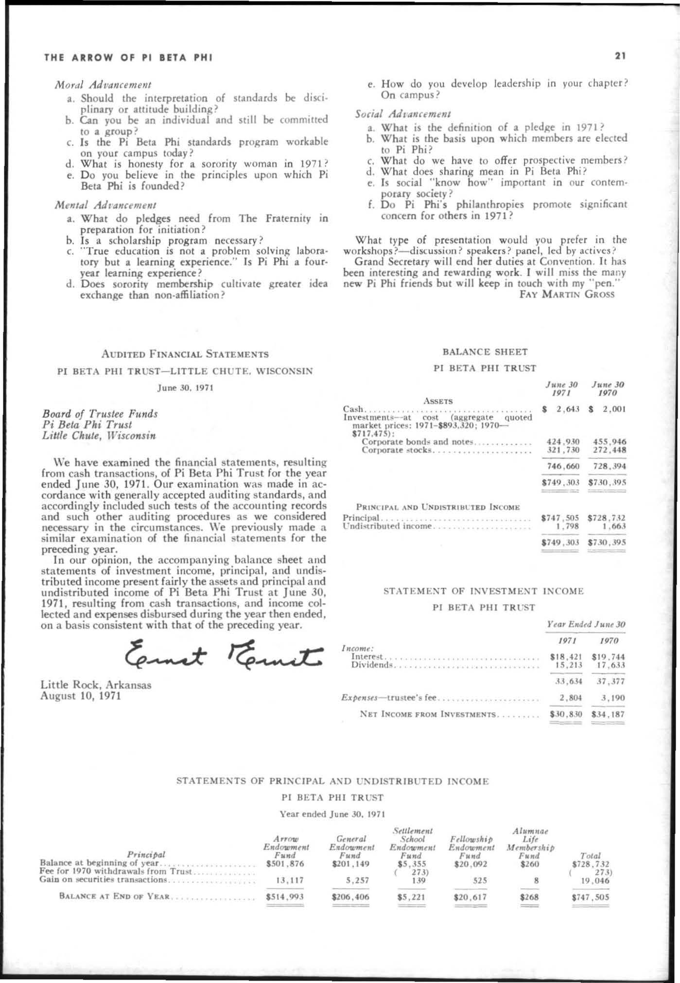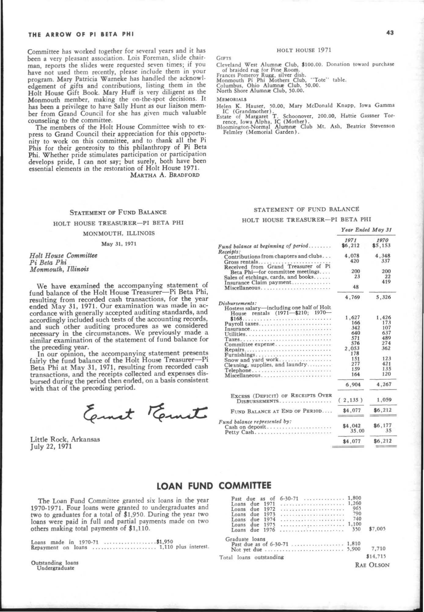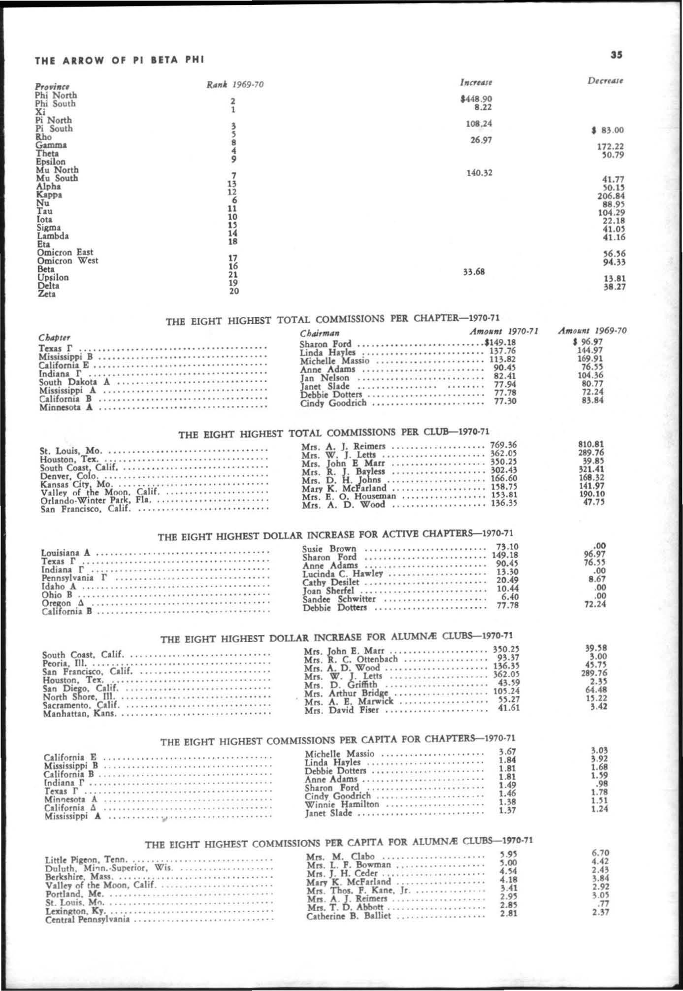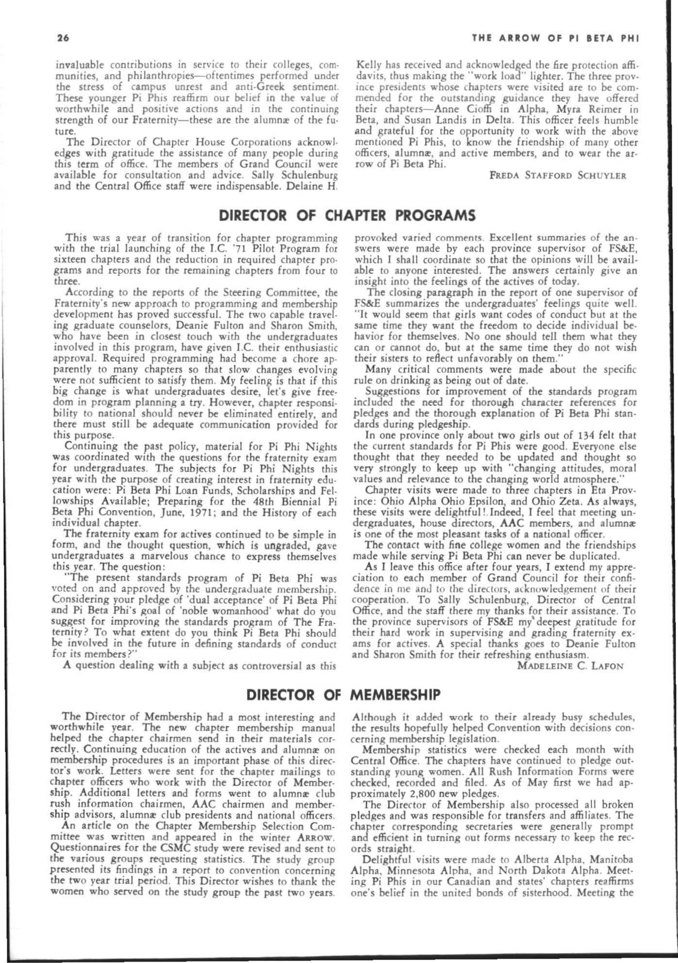 The G rand President made following introductions : Th e Convention Committee : National Convent io n Guide, Geri White Kur ek; Convention Committee Chairman, Pa uy Lou Burns M oore; H ospita li ty Chairman, Carol Ann M oore Killian ; Regis trati o n Chairman , Mar i lyn Allen Cazort-the members of Grand Council, the Directors , the Special Offi · cen-National Publi c Reiui on s Chairman, Eleanor Bush· nell Lehner; the Traveling Graduate Counselors f o r the 19 70 71 year, Dean ie Fulto n and Sharon Smith; Travel· Graduate Cou nsel ors f o r the 19 71·72 yea r , Cyndy Brehm and Ka y H olmes; Graduate Cou nsel o r for the 1970· 71 year, Janet Daacke; Dir«tor nr vnlral Offi ce , Sally Perry Schulenburg; Cenual Offi ce Financial Directo r , D o ro thy Mayne Campbell- The Board o f G ove rn ors o f Arr ow · mont, Chairman , Hesperia Ayleswort h Henderson ; Secrt· lary , Carolyn Kovener: Treasurer Olivia Smith !kIt)' Bailey H all ; D irector of Arrowmont School of Arts and Crafts, Mar ian G H eard; S Lucile Jennin!s ; Elizabeth Yelm Kingman ; Sarah Ruth Mull is; Dean of the College of H ome Economics, U niversit y oC Tennessee, Dr Lura Odland; Jean D unba r Socolowslci; Executive Coord i· nat o r, Lu cile M cCutc han Woodworth-the Ball oting Study Committee ; Chairman , D o ro thy Jones Birdwell; Evelyn Long Fay ; Barbara H e3th Kill ins- Chairman o f the (a. nadian Phil an thr opies Committee, Patricia Foster WeirChairman of the Extensi o n Committee, M ary Emri ch Van Buren- Chairman of the H o lt H o use Com