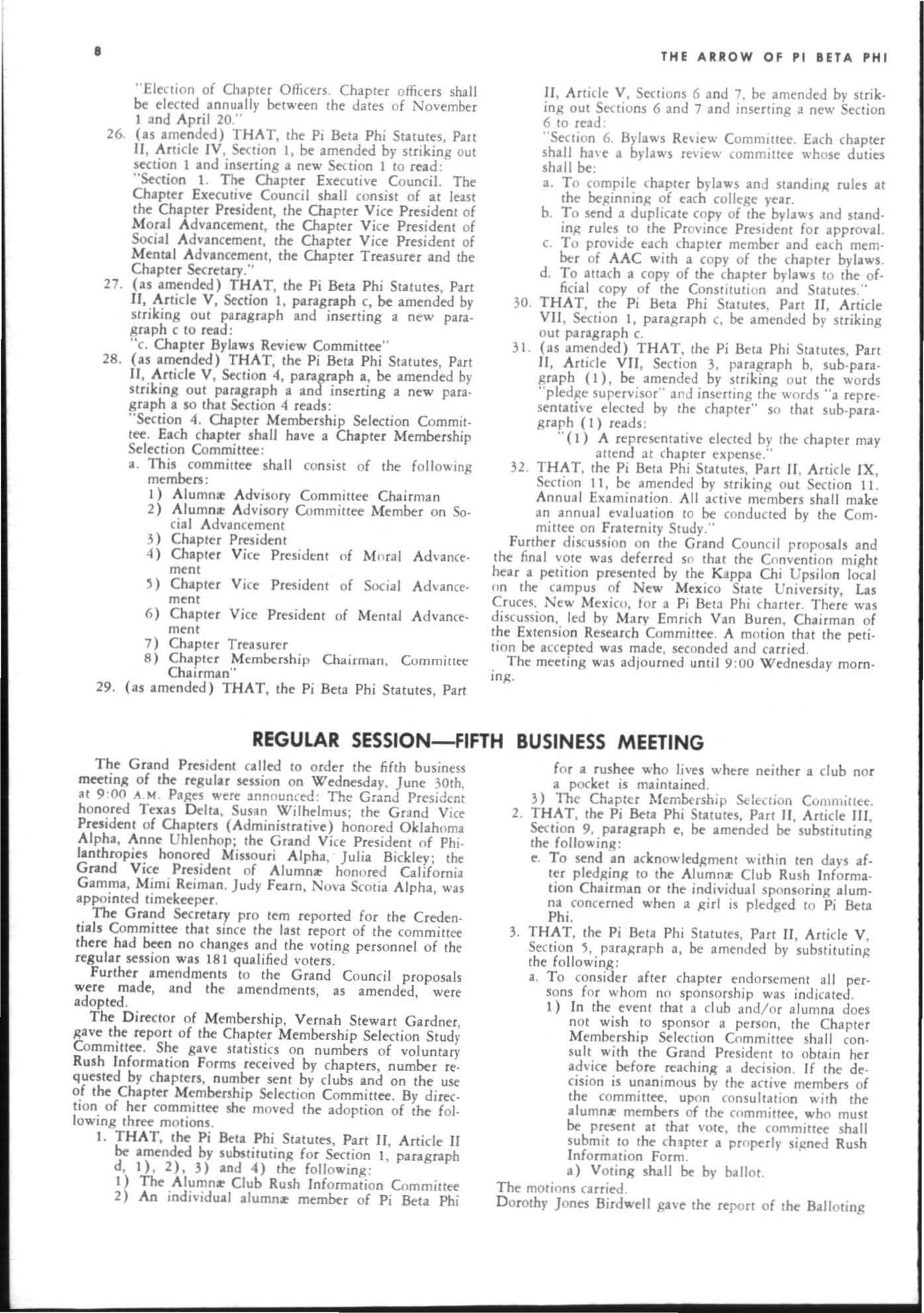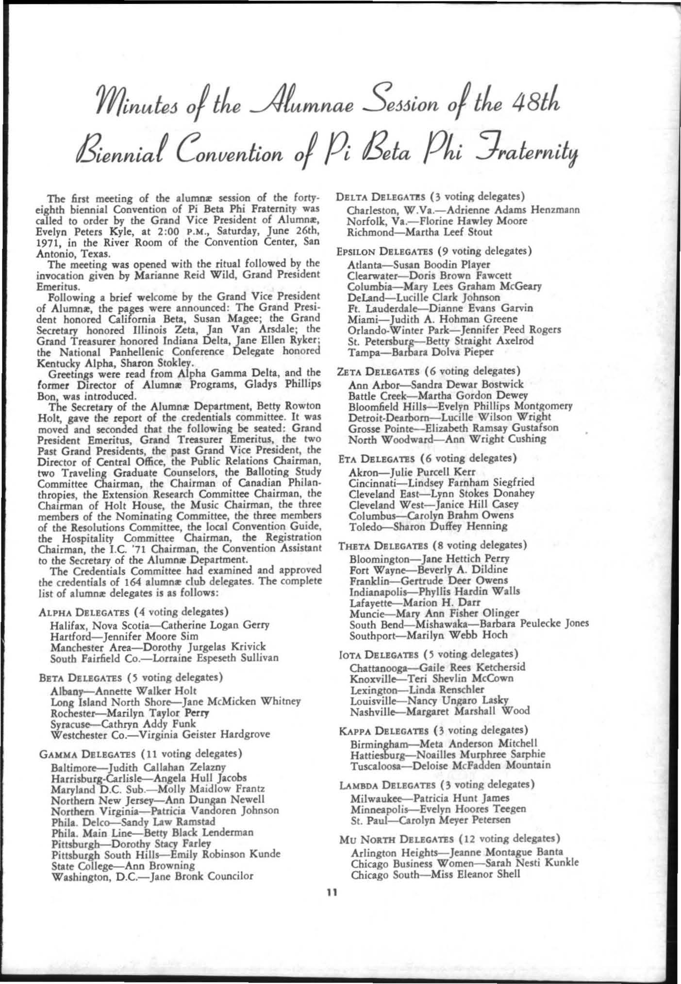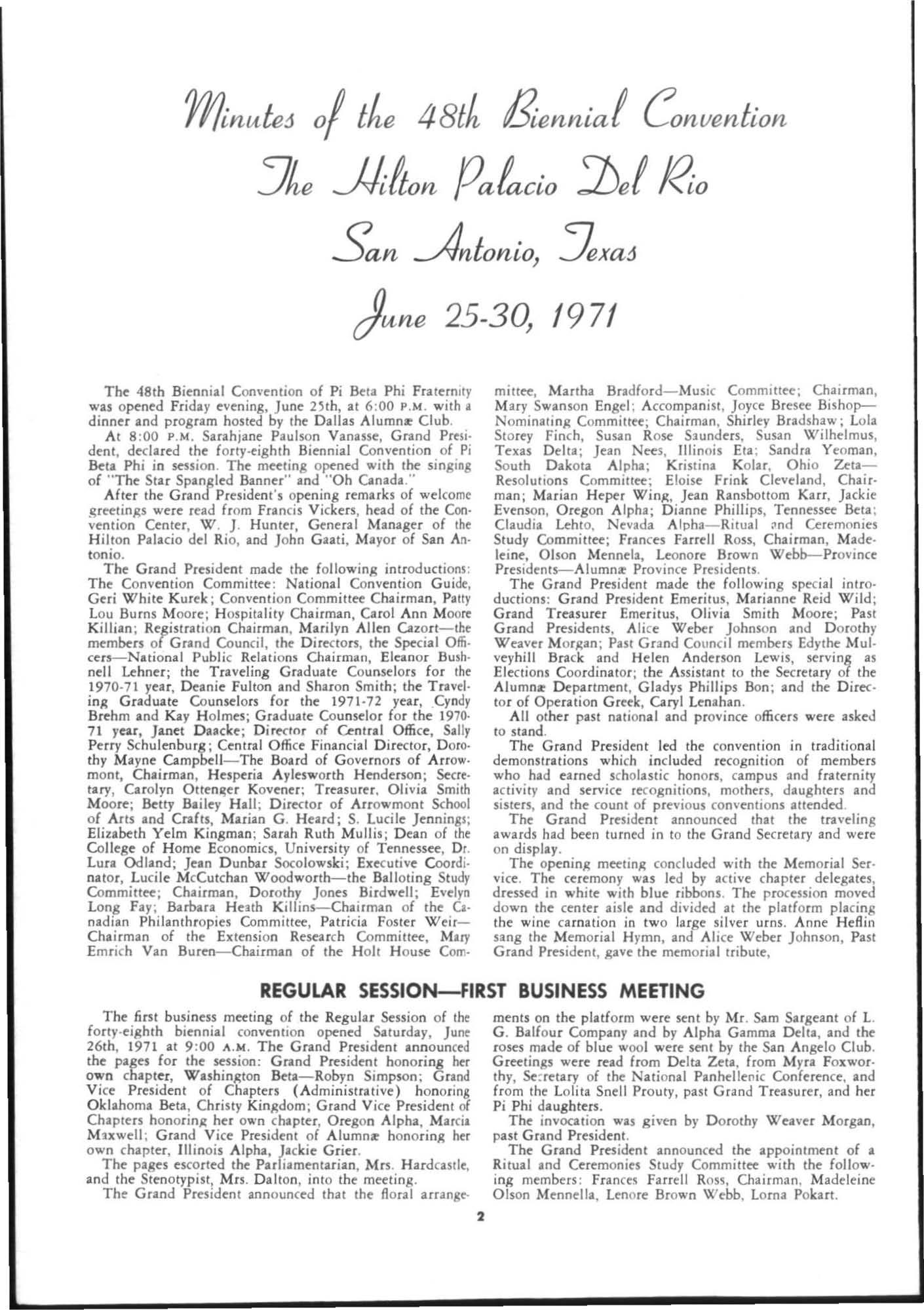 The first busines s meeting of the Regul a r Session of the forty -eighth biennial convenll o n opened Saturday. June 26th, 197 1 at 9 :00 A.M The Grand President announced the pages for the sessi on: Grand President honoring her own chapter, Beta - Ro byn Simpson; Grand Vi ce President of Chapters (Ad ministra t ive) h o n o r ing Okl ahoma Beta, Christy Kin gdom; Grand Vice President of Chaplers honorin,R: her O'll>'n c hapter, Orego n Alpha , M arcia M :u:well ; Grand Vi ce President of Alu mnz honoring her own chapter, lIl inois Alpha, Ja ckie Grier