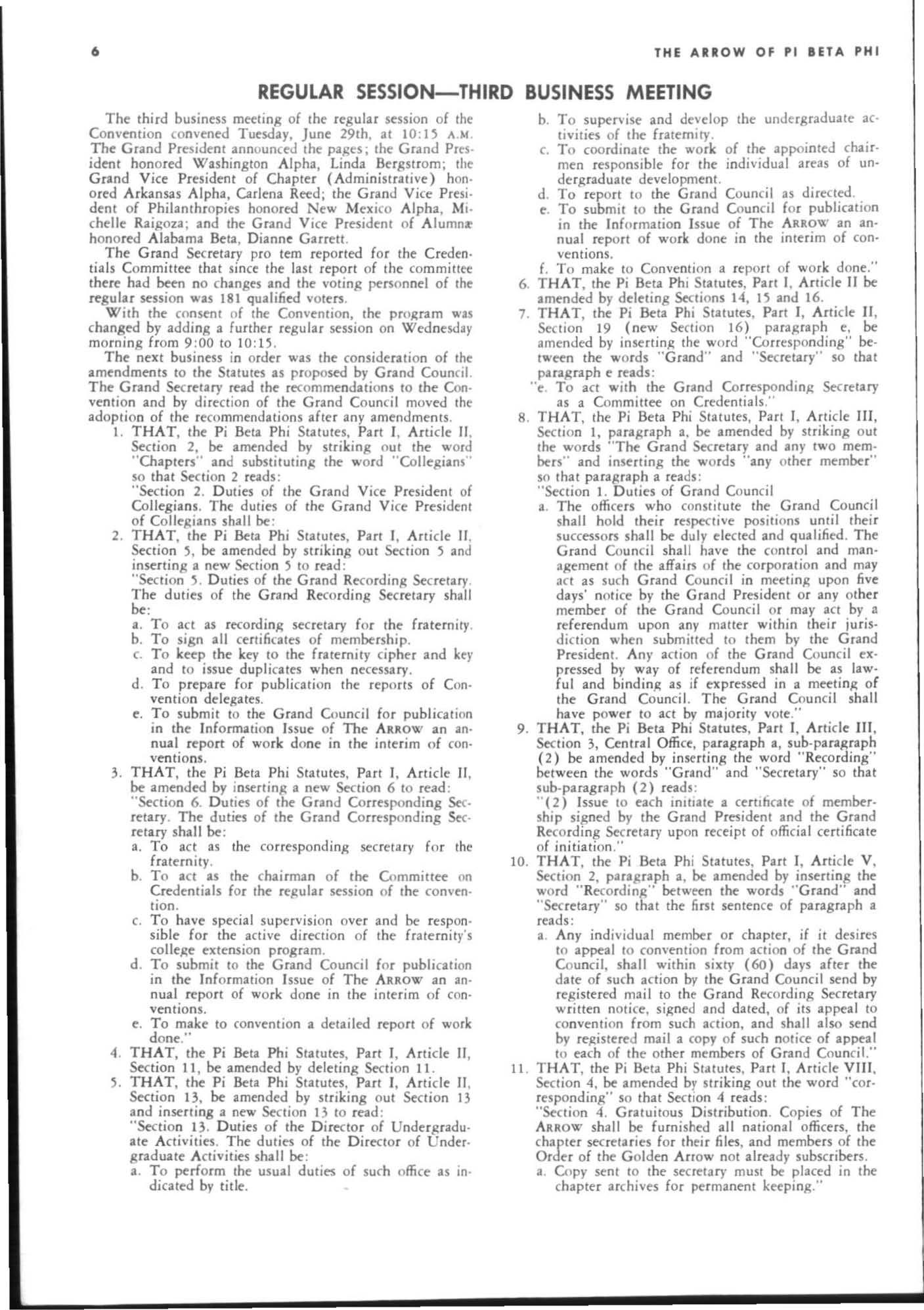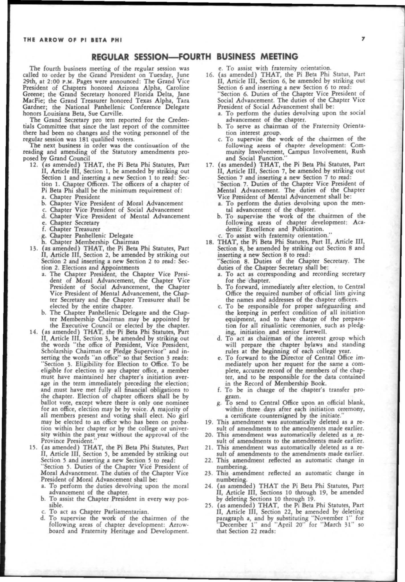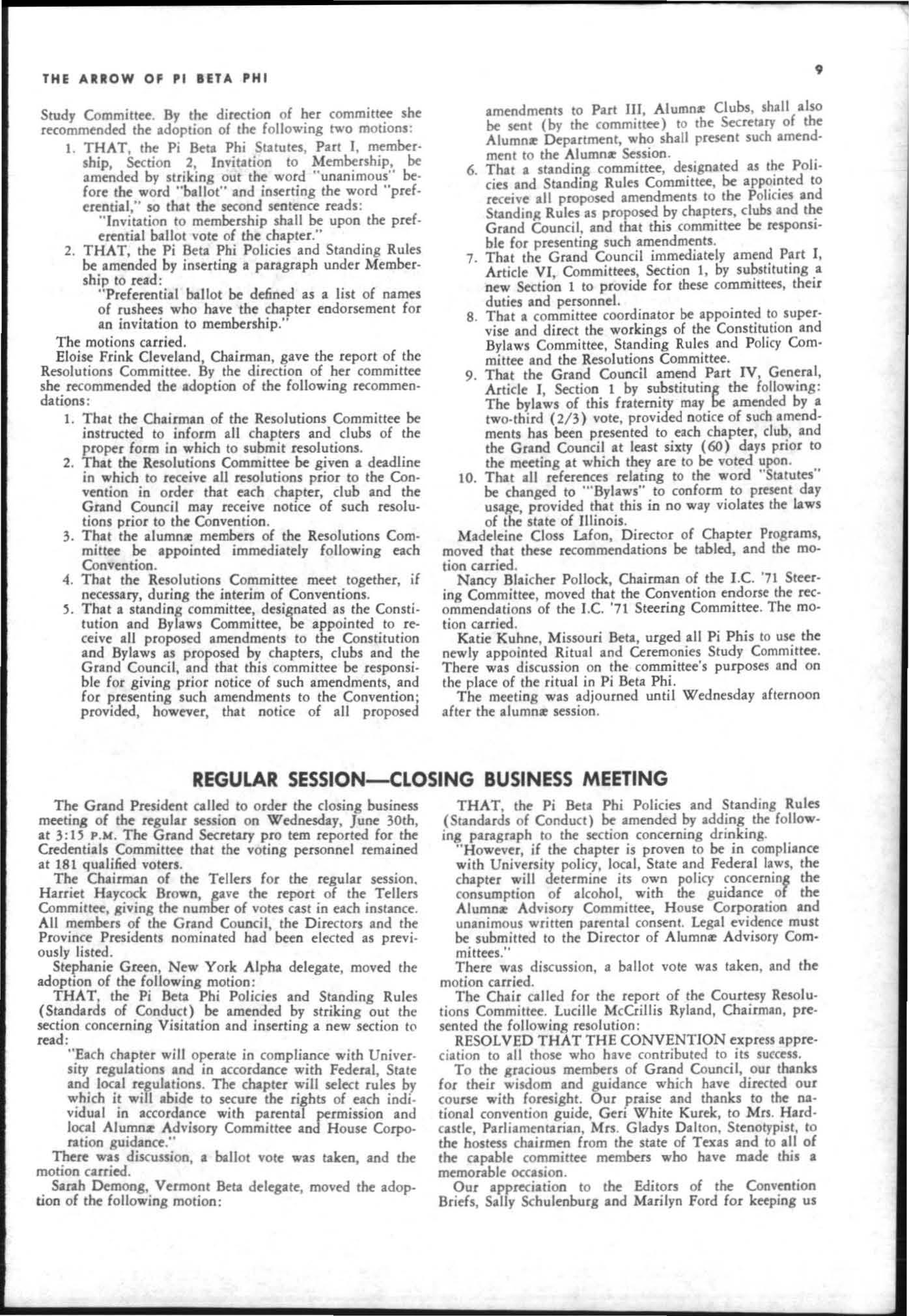 The first busines s meeting of the Regul a r Session of the forty -eighth biennial convenll o n opened Saturday. June 26th, 197 1 at 9 :00 A.M The Grand President announced the pages for the sessi on: Grand President honoring her own chapter, Beta - Ro byn Simpson; Grand Vi ce President of Chapters (Ad ministra t ive) h o n o r ing Okl ahoma Beta, Christy Kin gdom; Grand Vice President of Chaplers honorin,R: her O'll>'n c hapter, Orego n Alpha , M arcia M :u:well ; Grand Vi ce President of Alu mnz honoring her own chapter, lIl inois Alpha, Ja ckie Grier