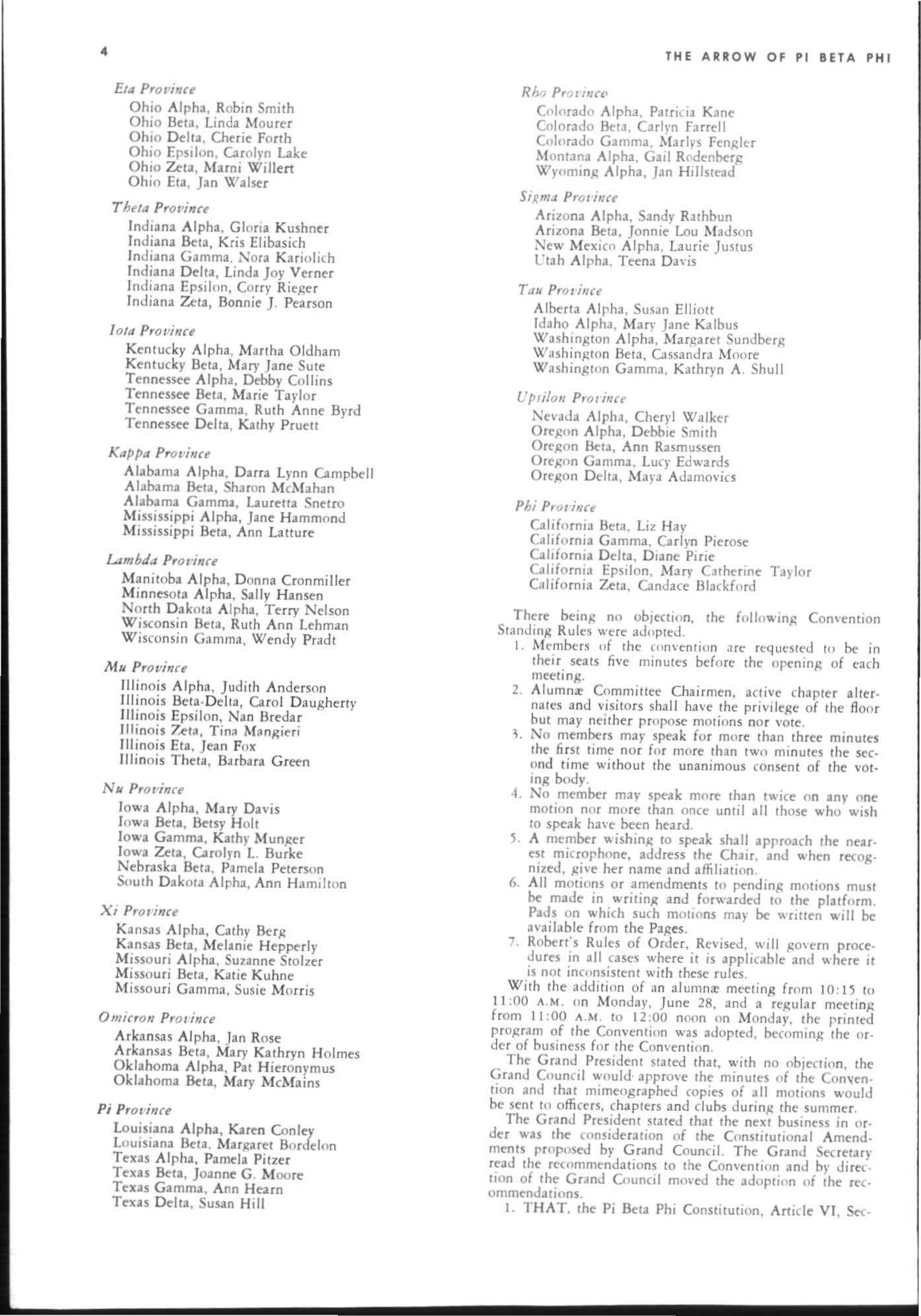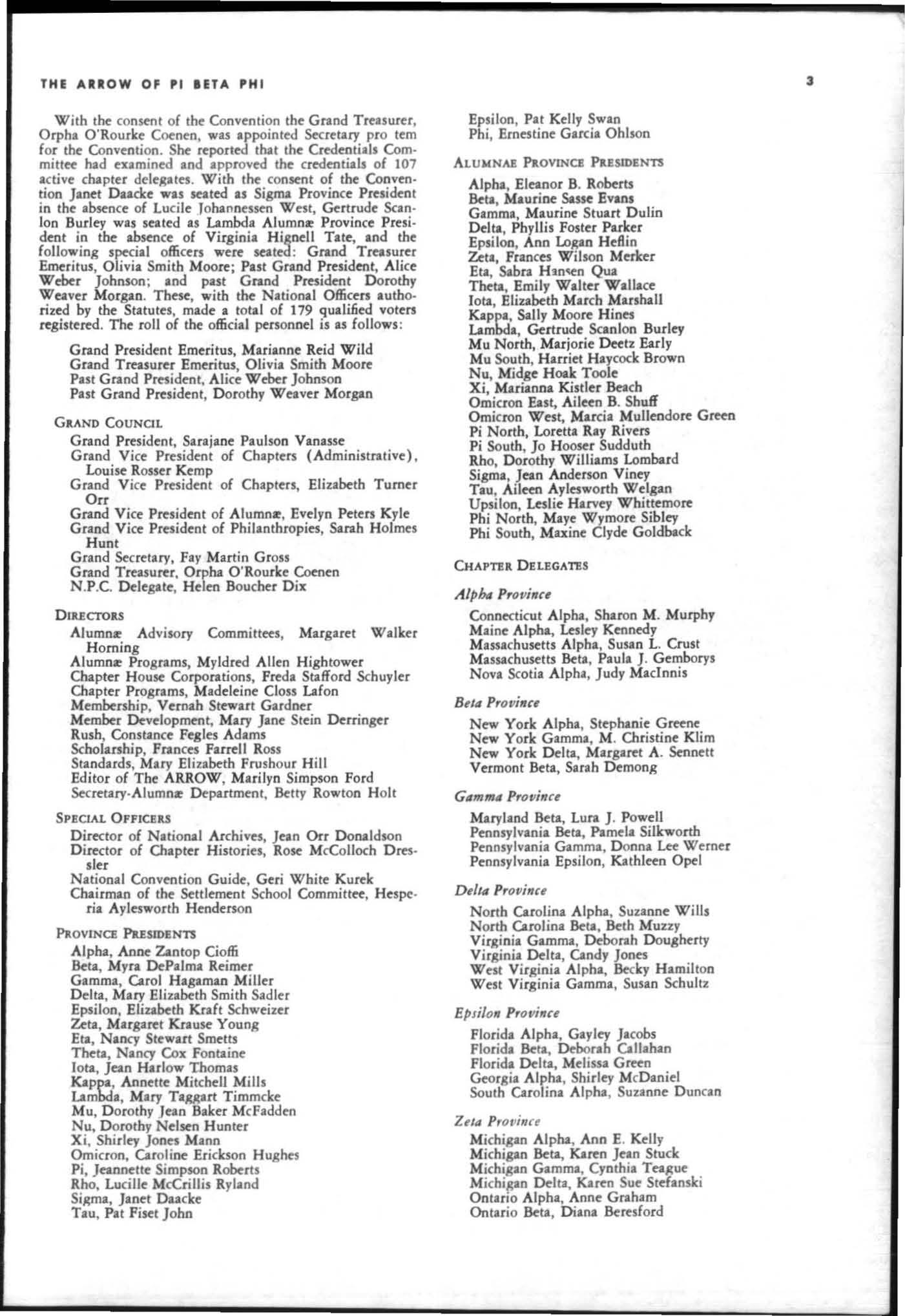With the o( the- Convention the- Grand Tre-asurer, Orpha O'Rourke- Coenen, wu appointed Secretary pro tern (or the- Convention She reported that the Credentiab Com · mittee had examined and approved the credentials o( J01 active chapter delegates . With the- consen t of the Conven· tion Janet Da.dee was seated as Sigma Province President in the absence of Lucile Johan nessen West, Gertrude Scanlon Burley was seated as Lambda Alumnr Province Presi . dent in the absence o( Virginia Hignell Tate, and the (ollowing spKial officers were seated: Grand Treasurer Emeritus, Olivia Smith Moore; Past Grand President, Ali ce Weber Johnson ; and past Grand President Dorothy Weaver Morgan These, with the National Officers autho· rized by the Statutes, made a total of 179 qualified voters registete'd . The roll of the offici.l perso nnel is as follows :