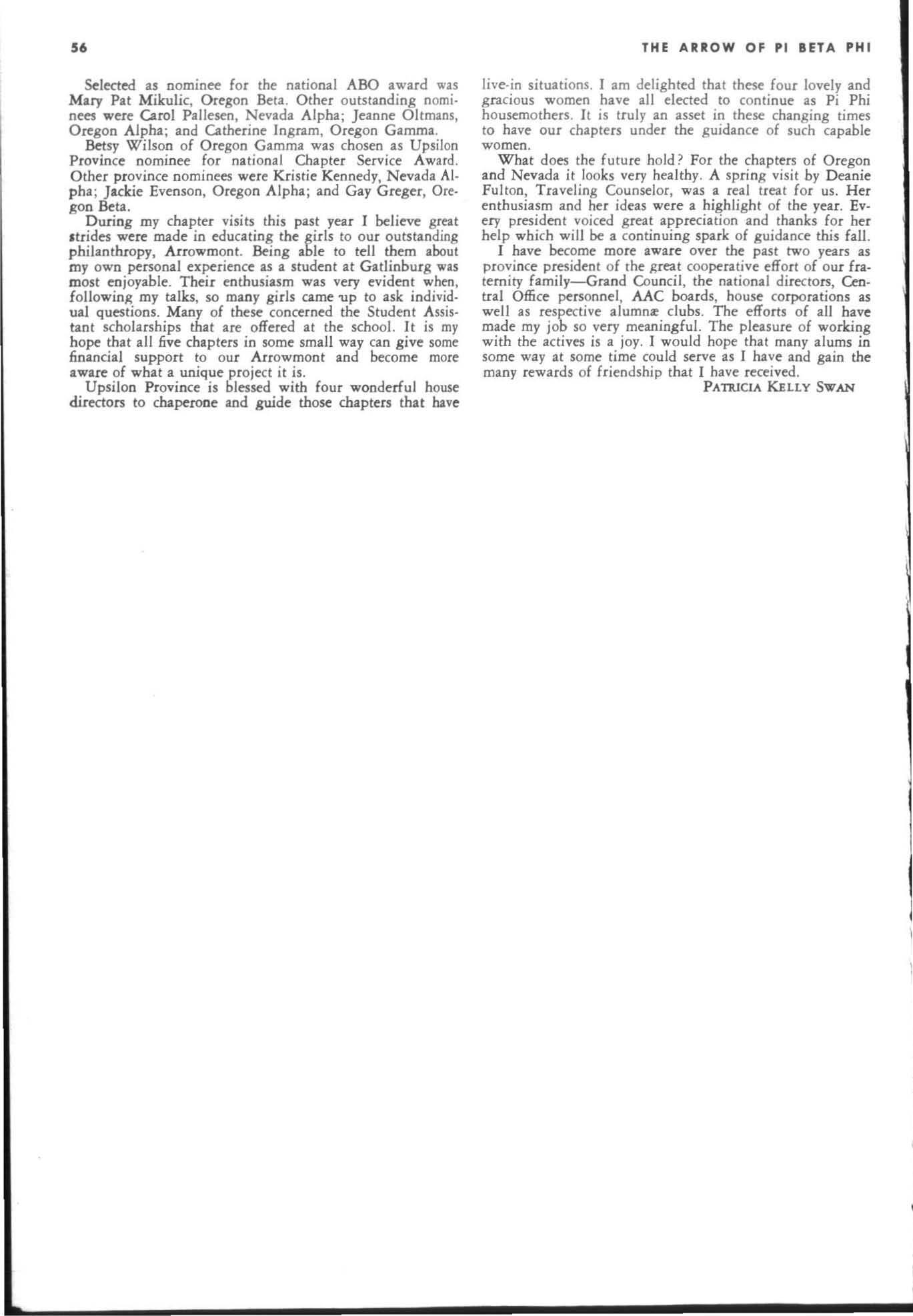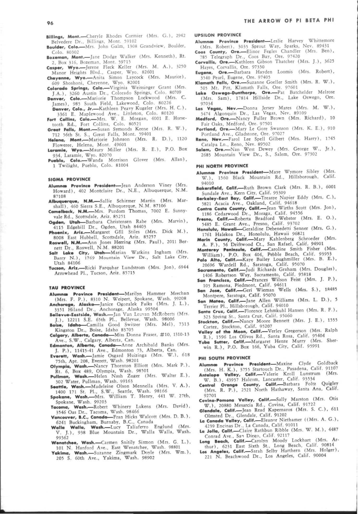 Marlha Bradfo rd - Mus ic Co mm i ttee ; Chairman , Mary Swanson Engel ; Accompanist , Joy ce Nominating Co mmittee; Chairman , Shirley Brad s haw; Lo la St o rey Finc h, Susan Slunders , Susan Wilhelmus Texas Della ; Jean Nees , Illinois Eta ; Sandra Ye o man , South DakOl' Alpha; Kristina K o lar. Oh io utaRes o lutions Commitltt ; Eloise Frink Cleveland , Chairman; Ma rian Wing, Jean Ransbottom Karr , Jackie Evenson , Oregon A lpha; Dianne Phillips , Tennesstt Ikta ; Claudia Lehto Nevada Alpha - Ritual =,nd Cert:mcmies Study Committee; Fran ces Farrell Ross, Chairman , M adeleine, Olson Mennela, Leonore Brown Webb--Pro vince Presidenu-Alumnr Provin ce Presidents