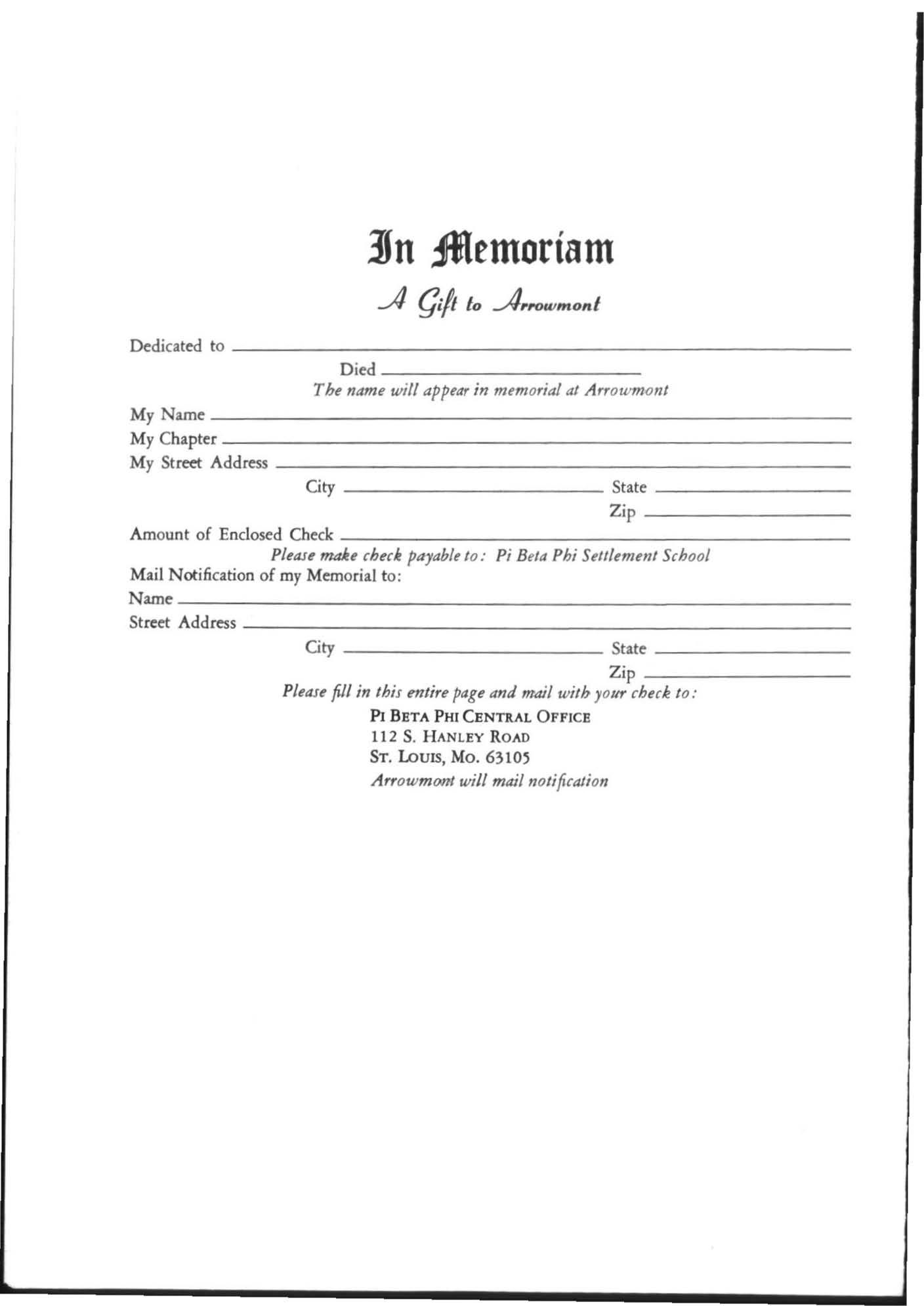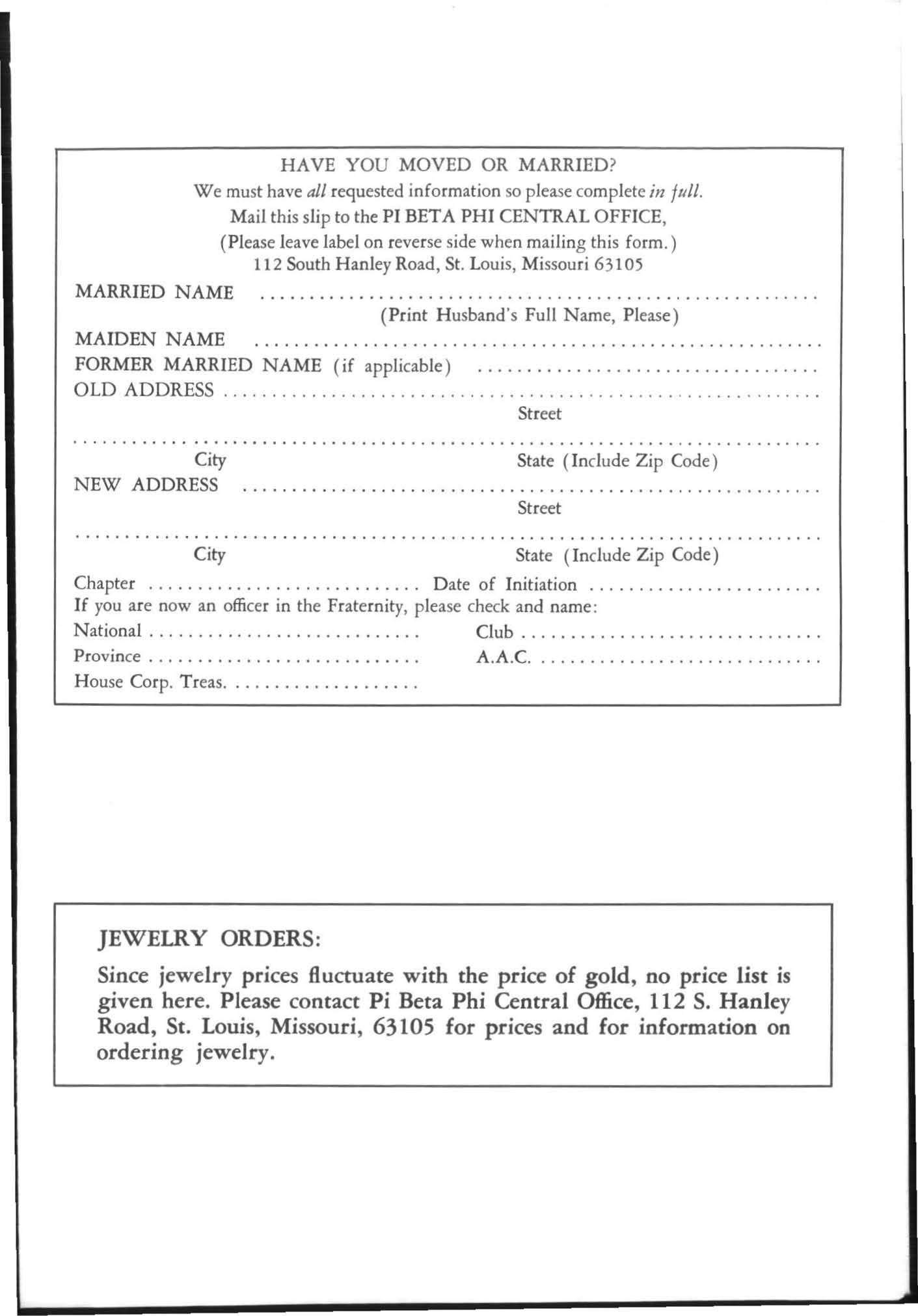 We must have all requ es t ed information so please comp lete in filii. M ai l this s li p t o the PI BET A PHI CENTRAL OFFICE, (Please leave labe l o n reve r se side whe n mailing this form.) 112 South Hanl ey Road, St. Louis, Mi ssou ri 63105