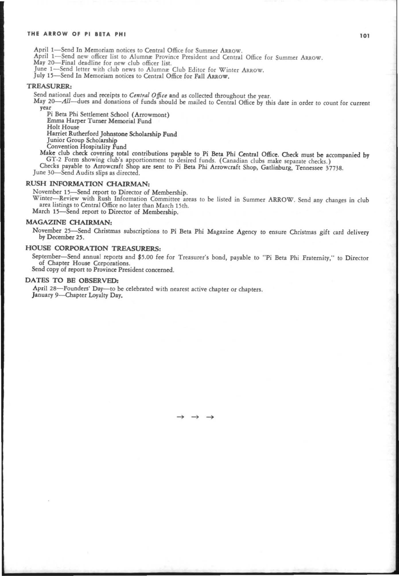 September-Send annual rep o rts and $5 .00 fee far Treasurer's bond, payable to " Pi Beta Ph i Fraterniry," to Directo r of Chapter Cor porations.
