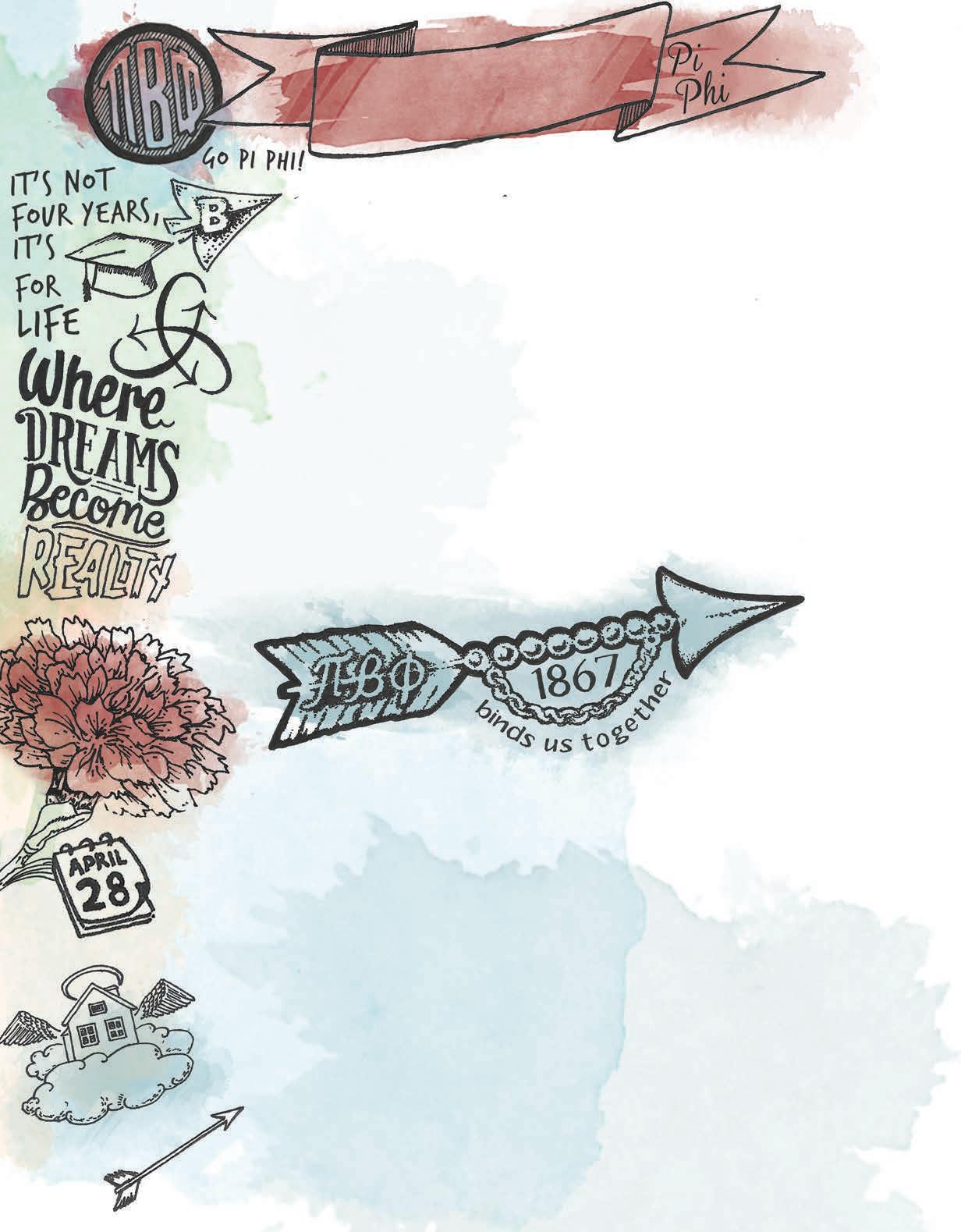 All Pi Phis are encouraged to submit news and stories to The Arrow. All photos and written submissions become the property of Pi Beta Phi and are subject to editing for content, grammar and space constraints, and may be used for other educational or marketing purposes by the Fraternity. When submitting a story, be sure to include a member’s preferred chapter, first, maiden and last names. As a general rule, The Arrow does not print stories about weddings, engagements, pinnings or birth announcements. Visit www.pibetaphi.org/arrow for more information and to download Pi Beta Phi’s Photography Guidelines. We cannot guarantee the publication of any submission. We receive so many and space is limited.