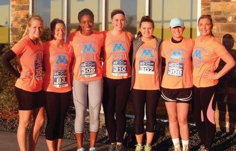 Minnesota Alphas at the University of Minnesota trained together for the Eau Claire, Wisconsin, marathon. On race day, a group of Pi Phis drove 90 minutes to surprise their running sisters. From left, Minnesota Alphas LORA REMUS, PAIGE LOTZ , HANNAH REISNER , VICTORIA MARTINSON, CORI JOHNSON, CATHERINE ROGERS and MORGAN KLAUSTERMEIER