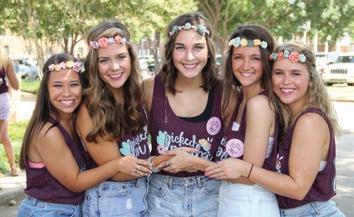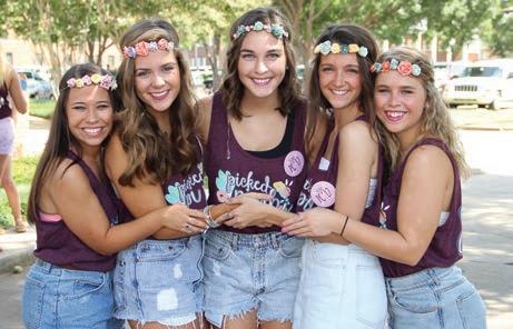 In August, the Oklahoma Beta Chapter at Oklahoma State University welcomed its New Members with a flower-themed Bid Day. The women wore handmade flower crowns and T-shirts reading “Picked Pi Phi.” From left, Oklahoma Betas AMANDA JONES, GRACIE COEN, SHELBY NORTHCUTT, RYLAN MCELROY and EMMA SCHEMMER