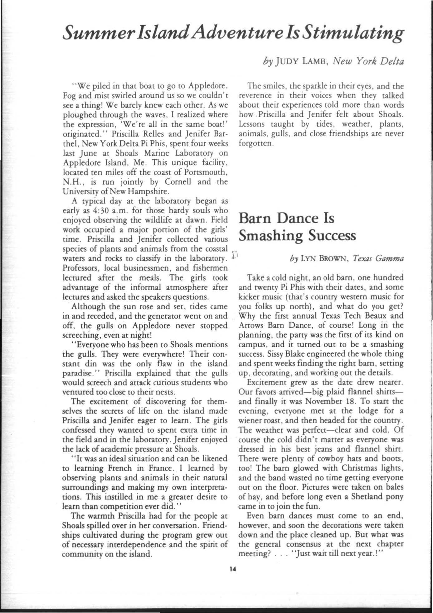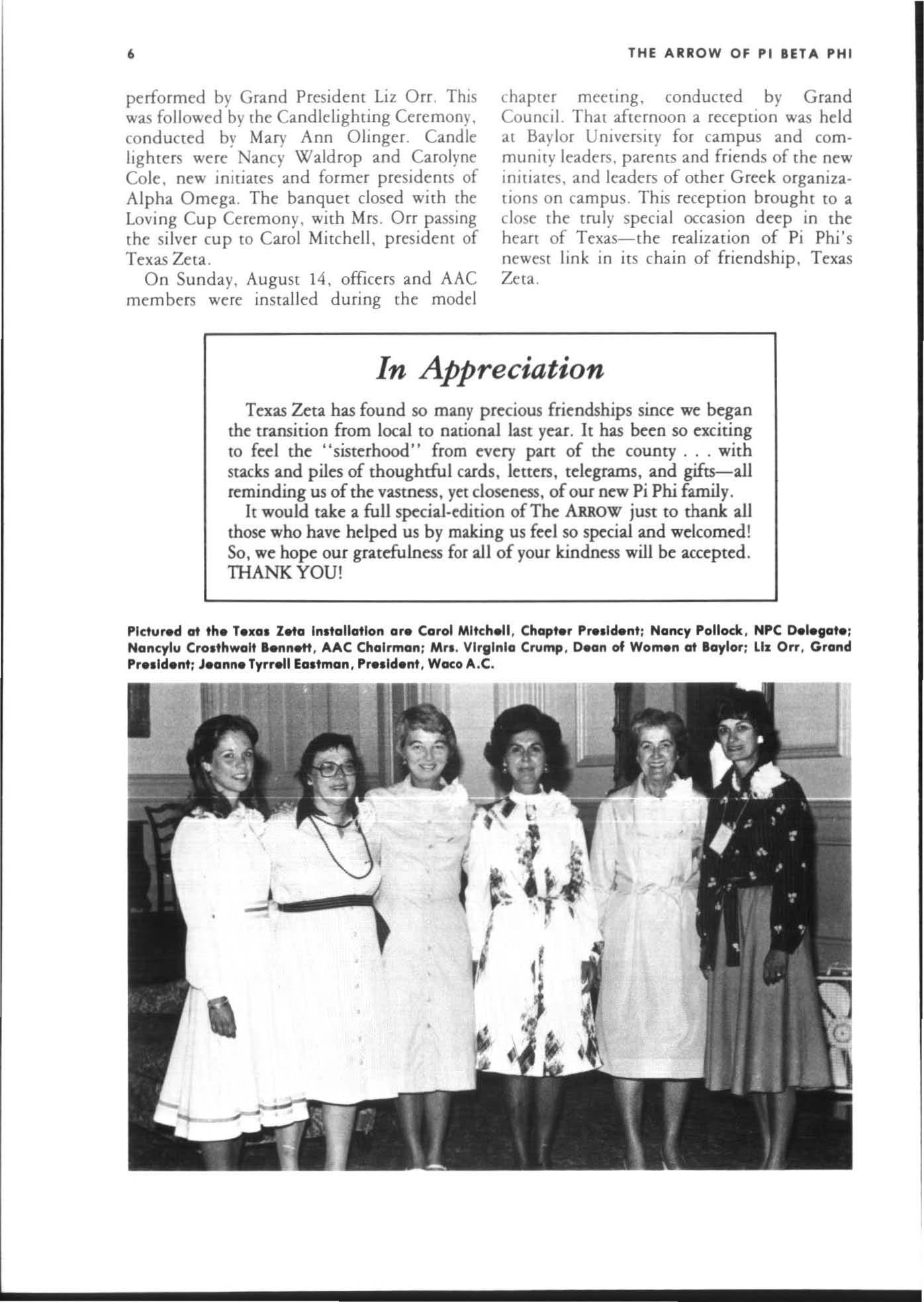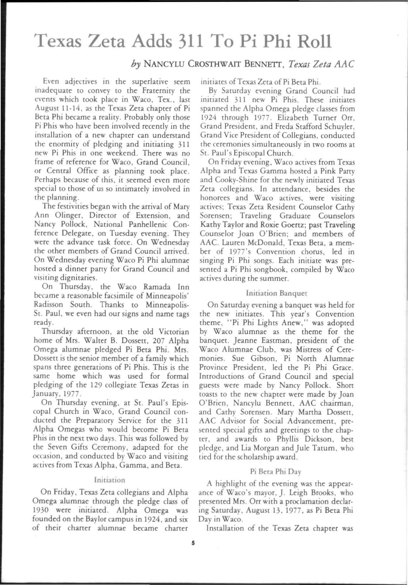 Even adjectives in the s uperlative seem inadequate (0 convey to (he Fraternity the events which took place in Waco , Tex . , last August 11-14 as rhe Texas Zeta chaprer of Pi Bera Phi became a realiry Probably only those Pi Phis who have been involved recently in rhe in stallation of a new chapter can understand rhe enormity of pledging and initiating 3 11 new Pi Phi s in one weekend. There was no frame of reference for Wa co, G rand Council. o r Central Office as planning took place . Perhaps because of this. it seemed even more specia l [Q those of us so intimately involved in the planning.